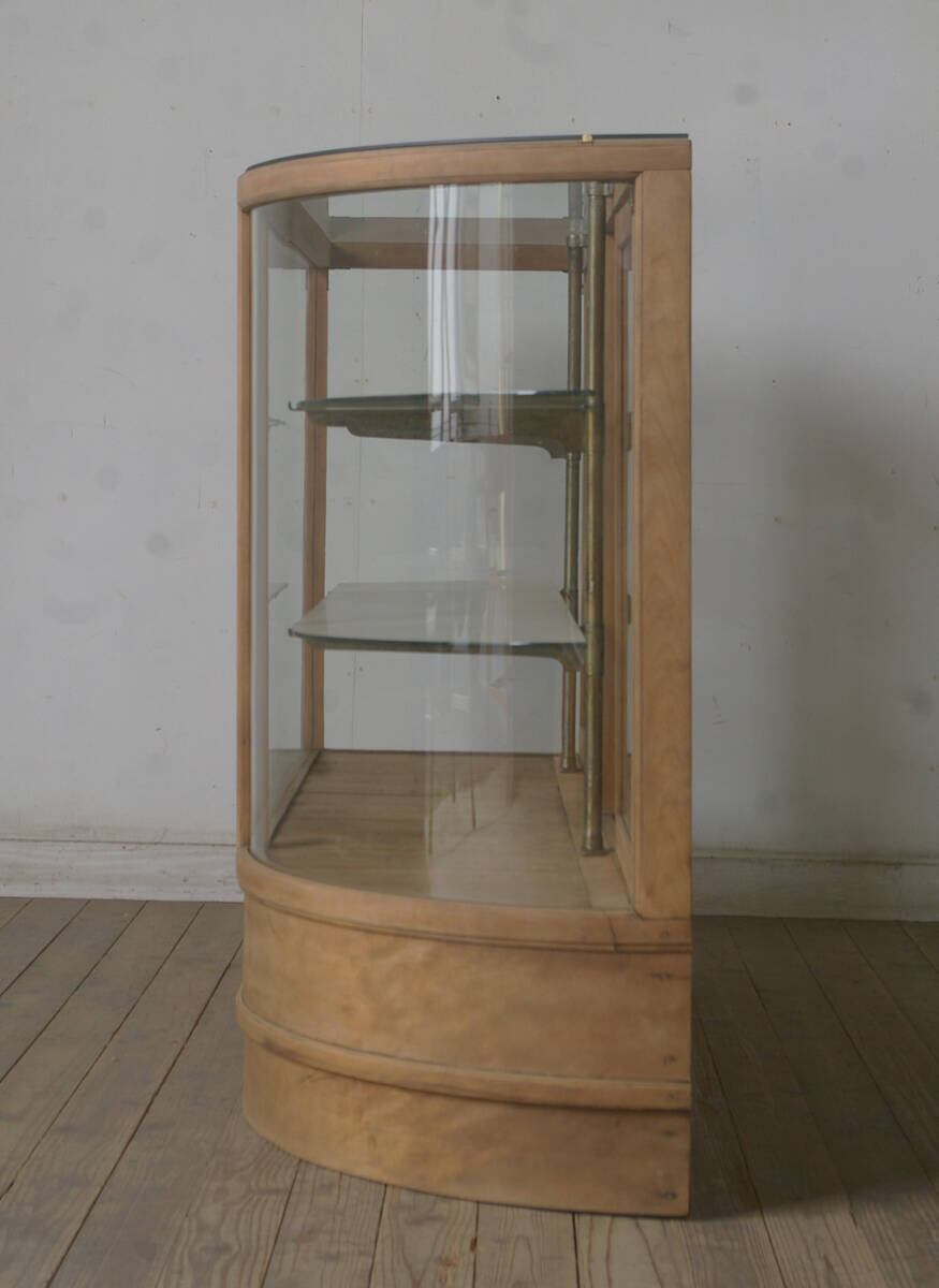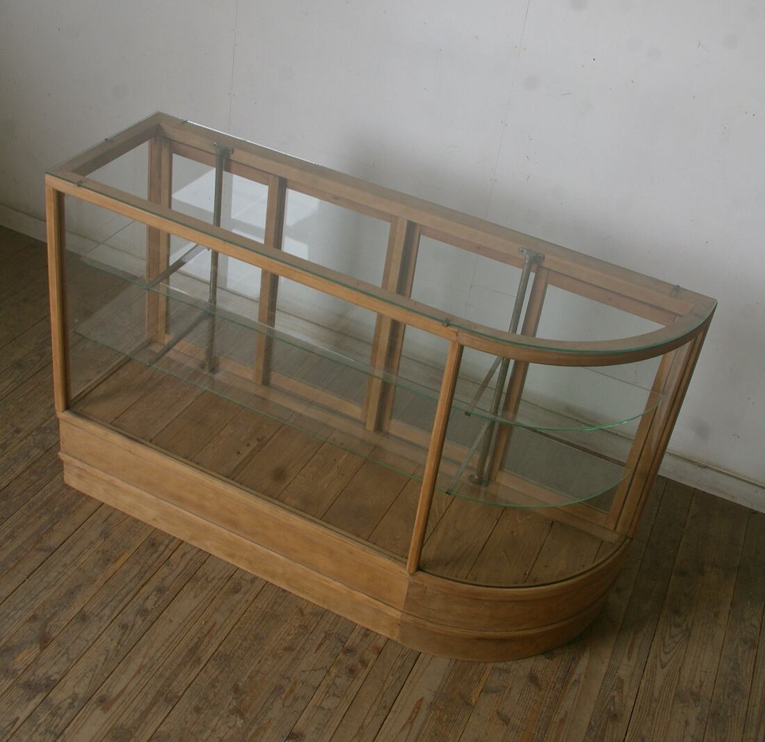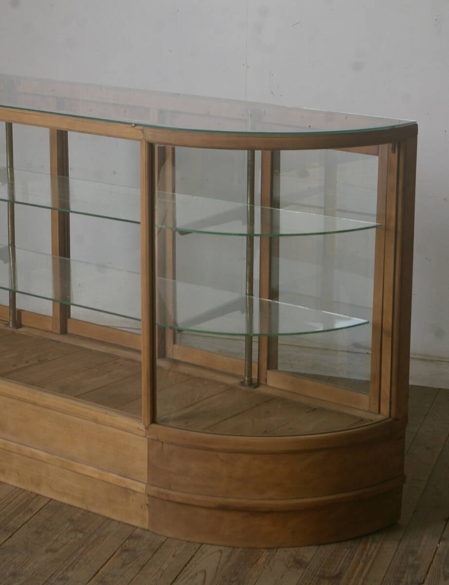 片面のRガラスと古い木枠の綺麗な木目がとても雰囲気の良いアンティークカウンター5面ガラスショーケースです。