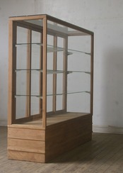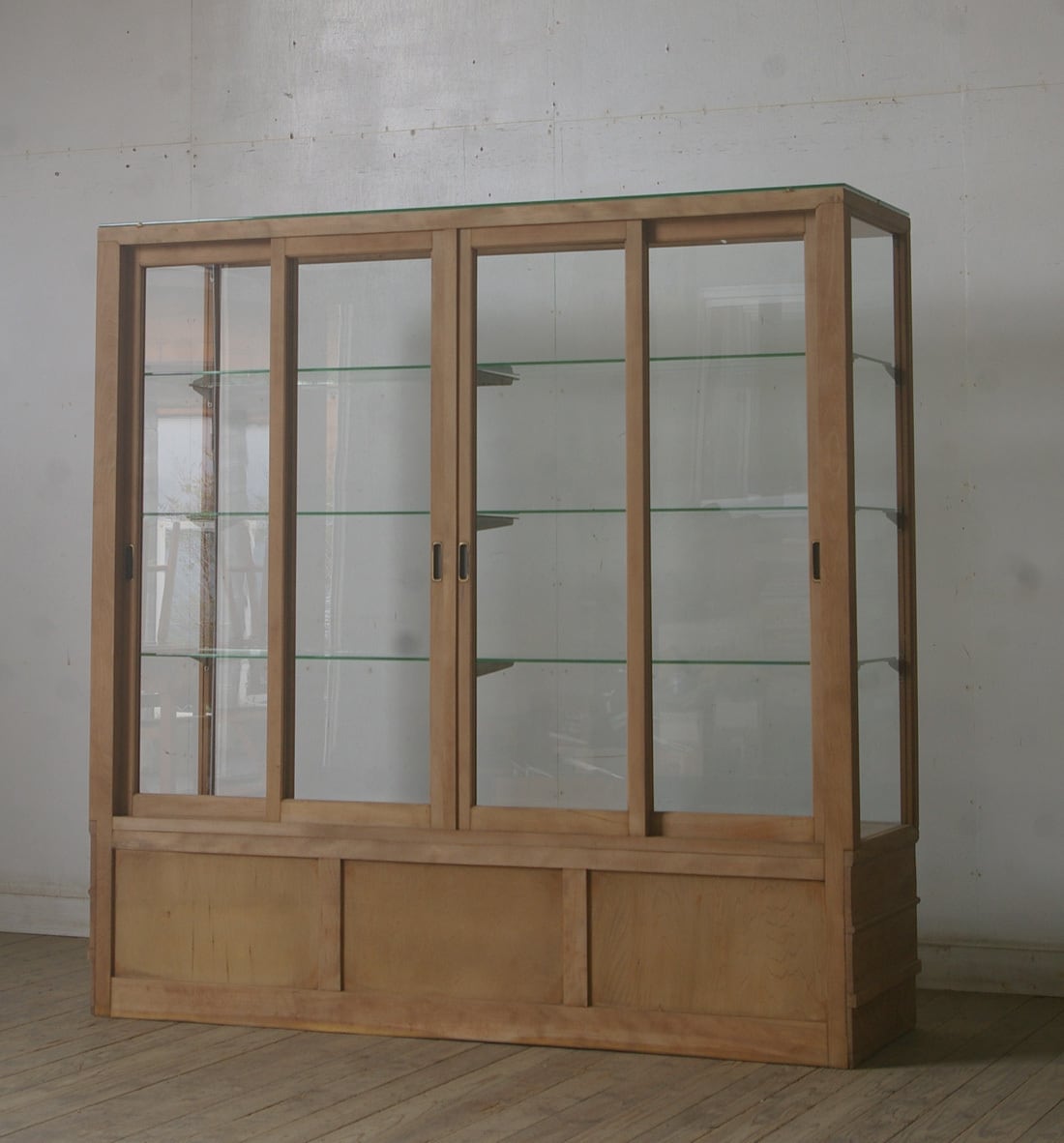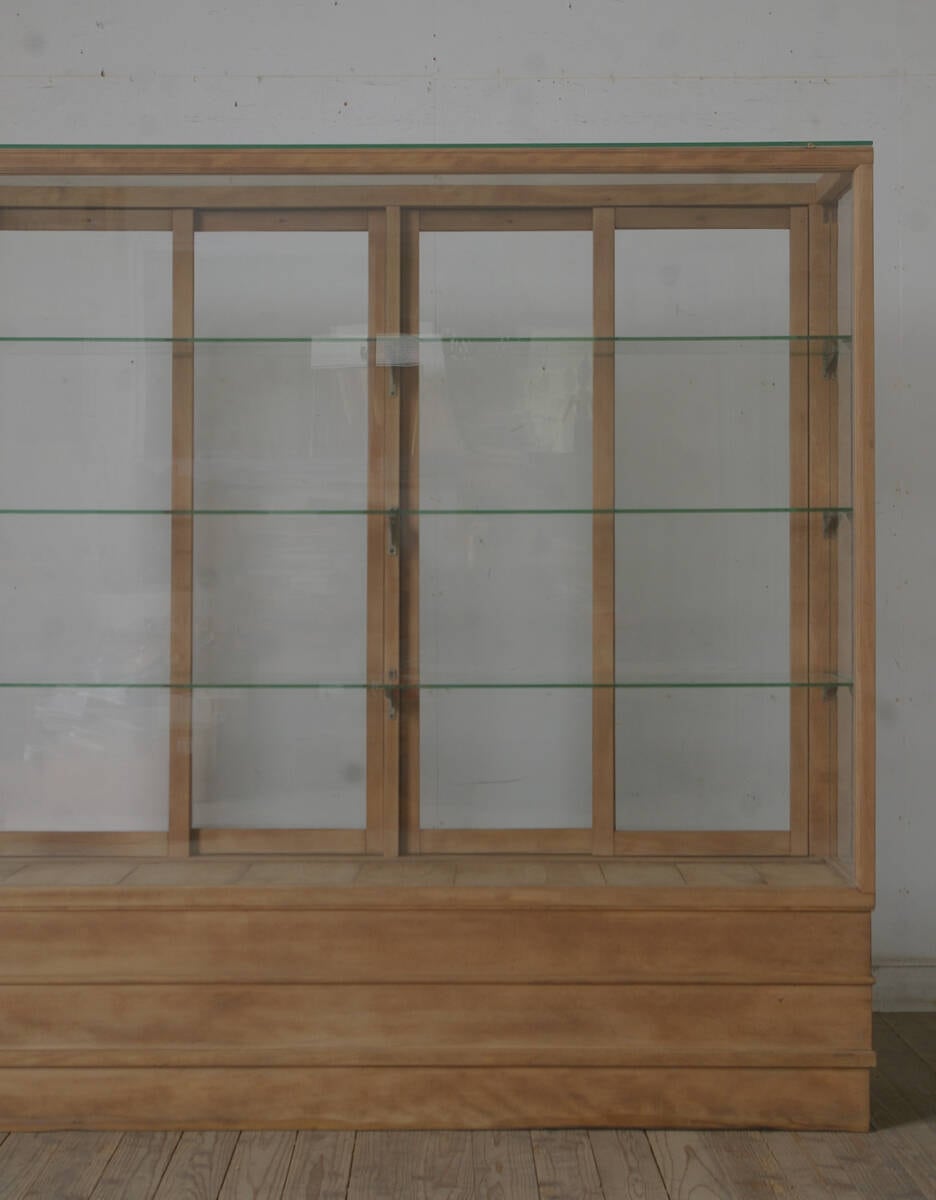 古い木枠の綺麗な木目がとても雰囲気の良いアンティーク大きな5面ガラスショーケースです。