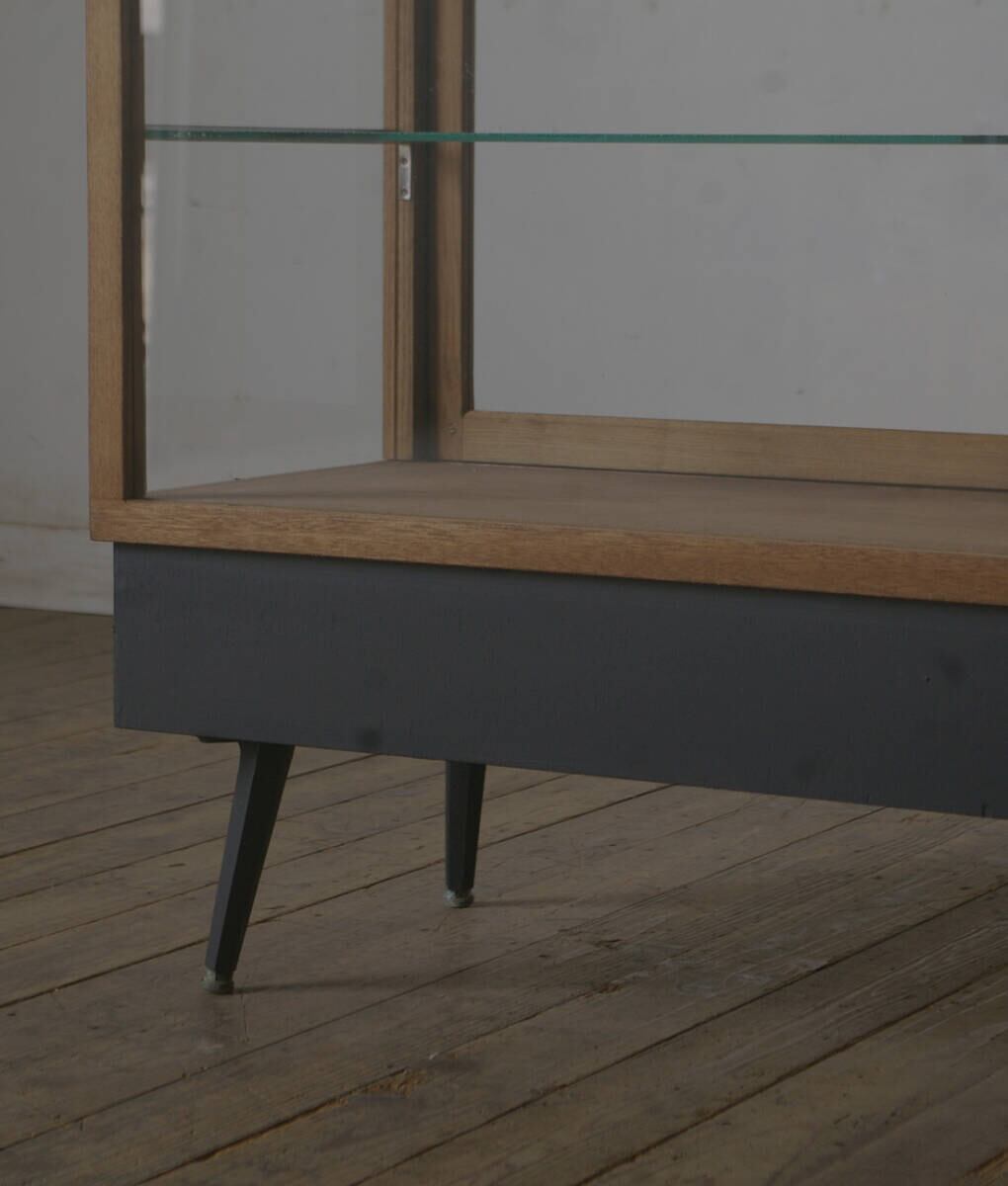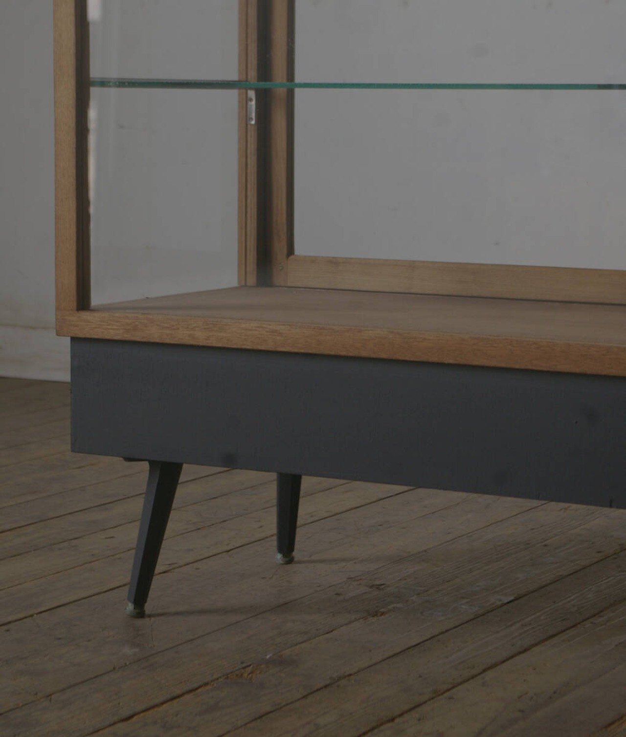 オリジナルの鉄脚と古い木枠の綺麗な木目がとても雰囲気の良いアンティーク5面ガラショーケースです。