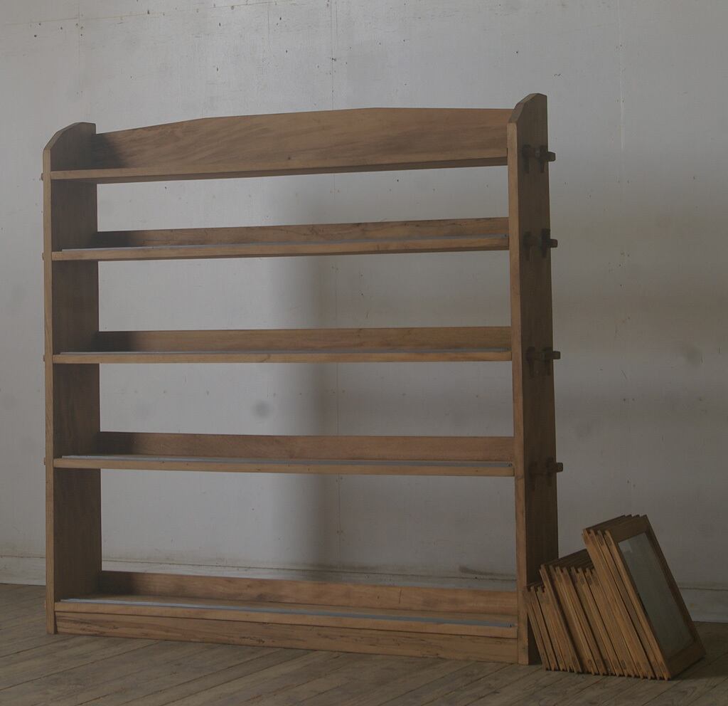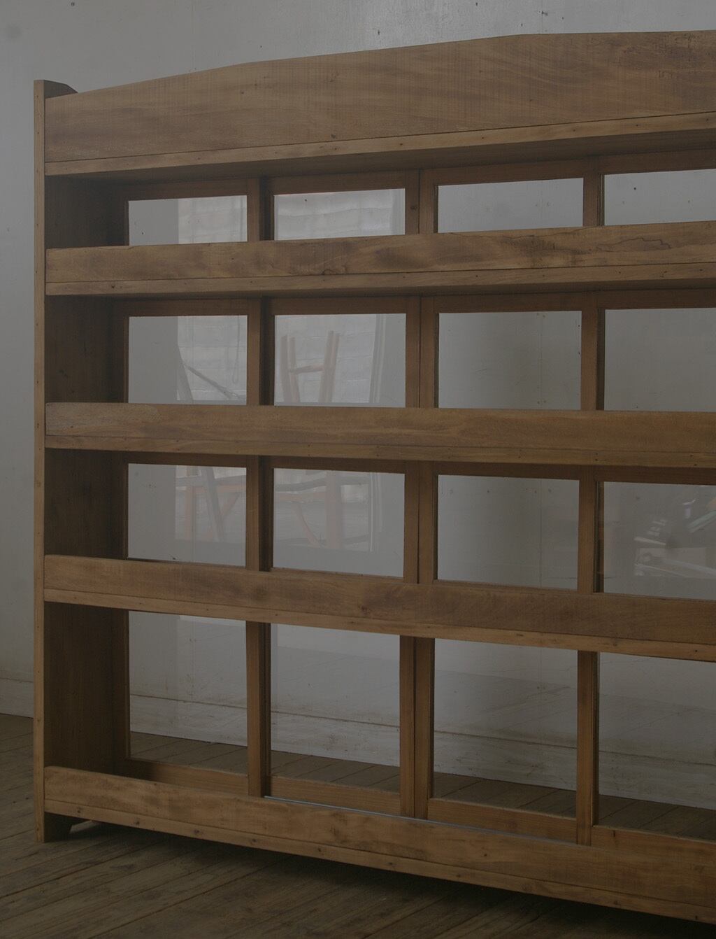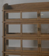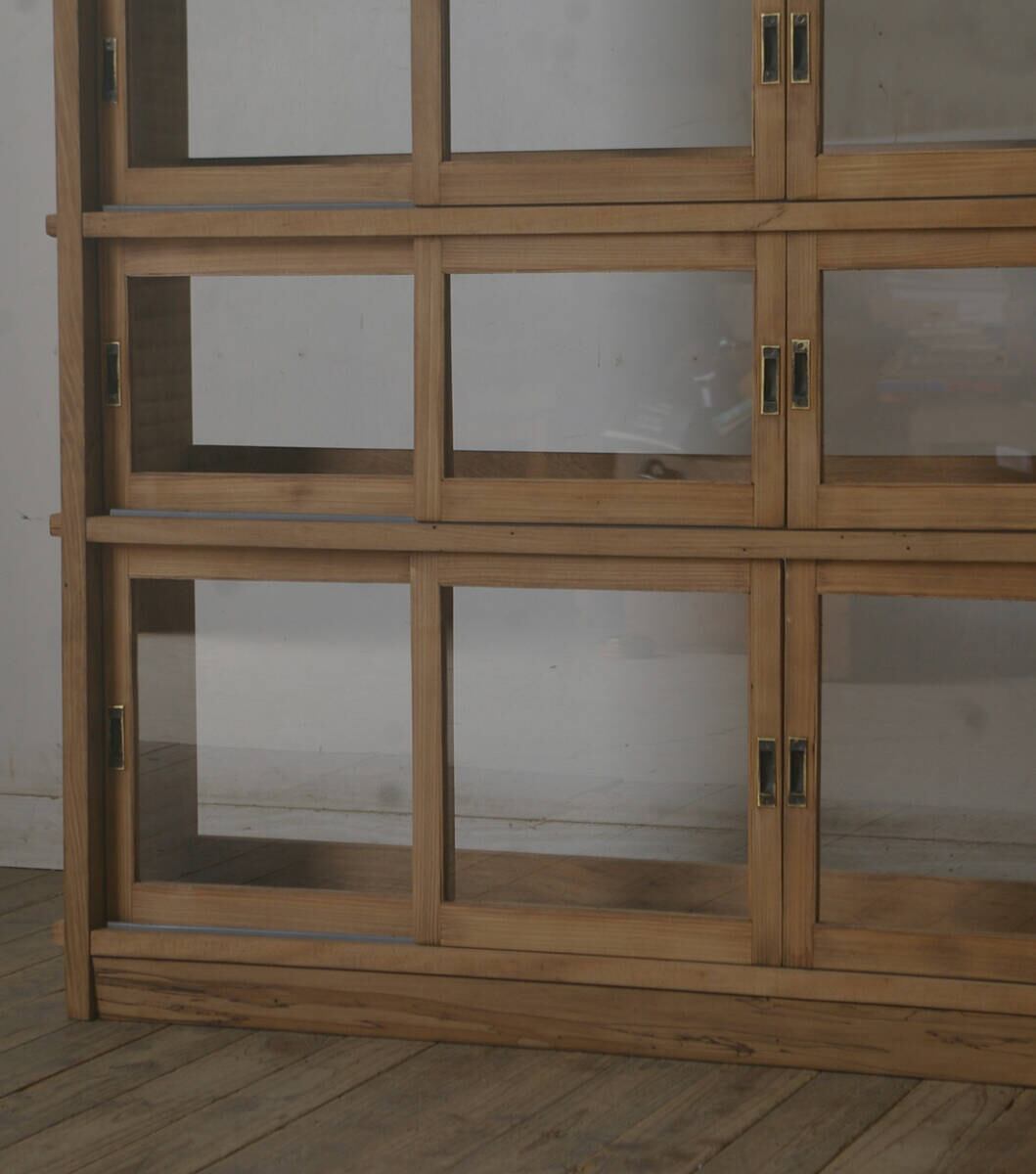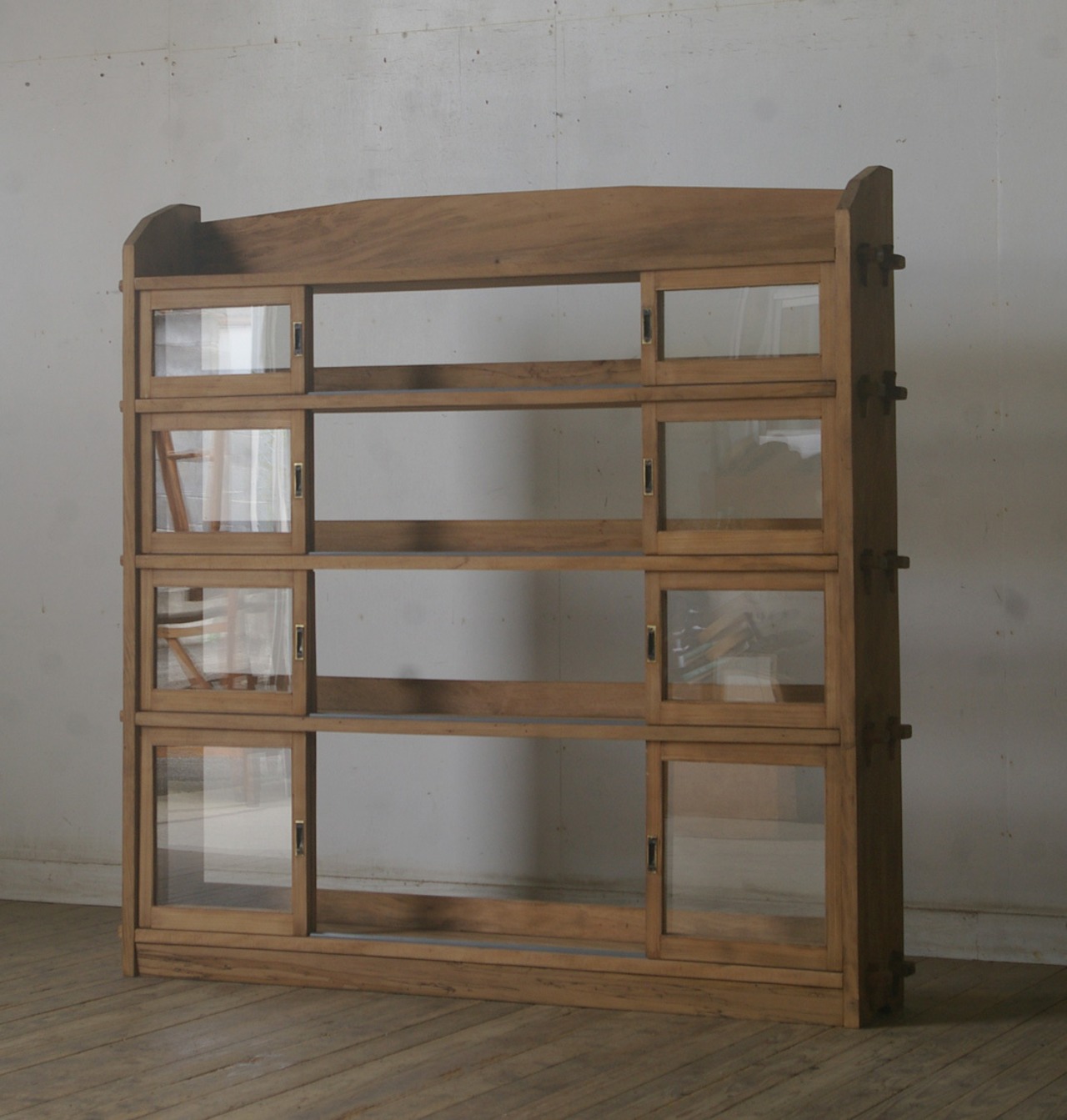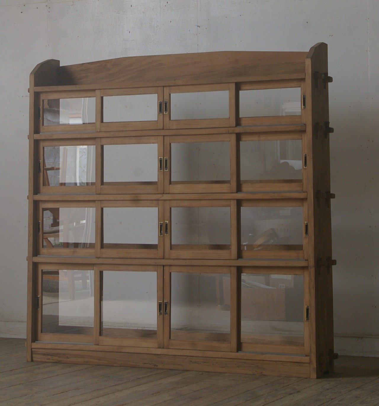 16枚のガラス戸と重厚な古い無垢材の綺麗な木目がとても雰囲気の良いアンティーク飾り棚ですの。