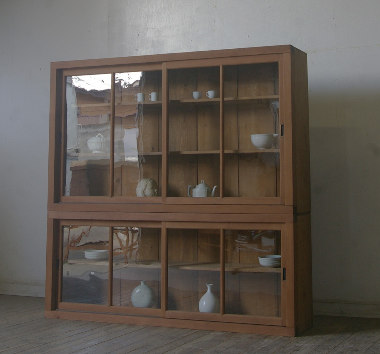古い重ね横長の大きなガラス戸棚 YZ2661