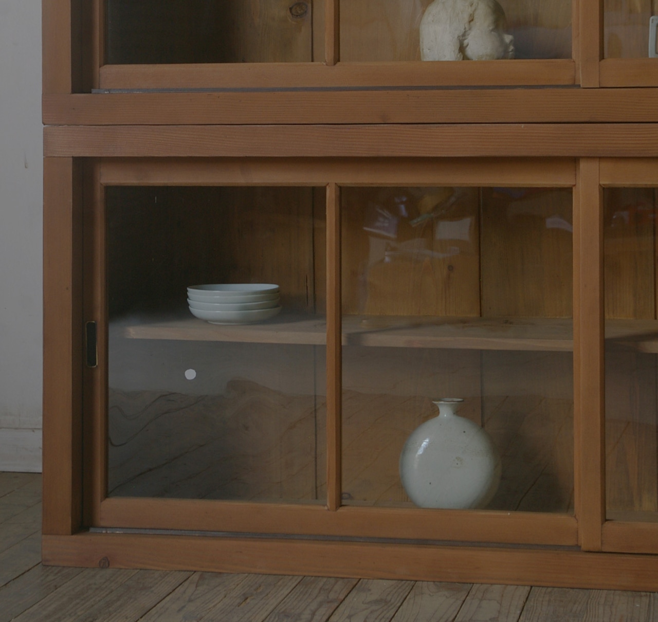 4枚のガラス戸と古い無垢材の綺麗な木目がとても雰囲気の良いアンティーク重ねガラス戸棚です。
