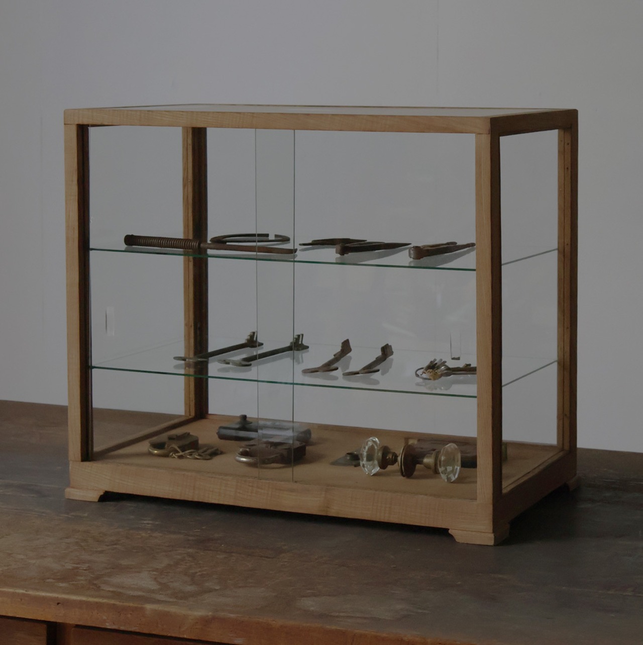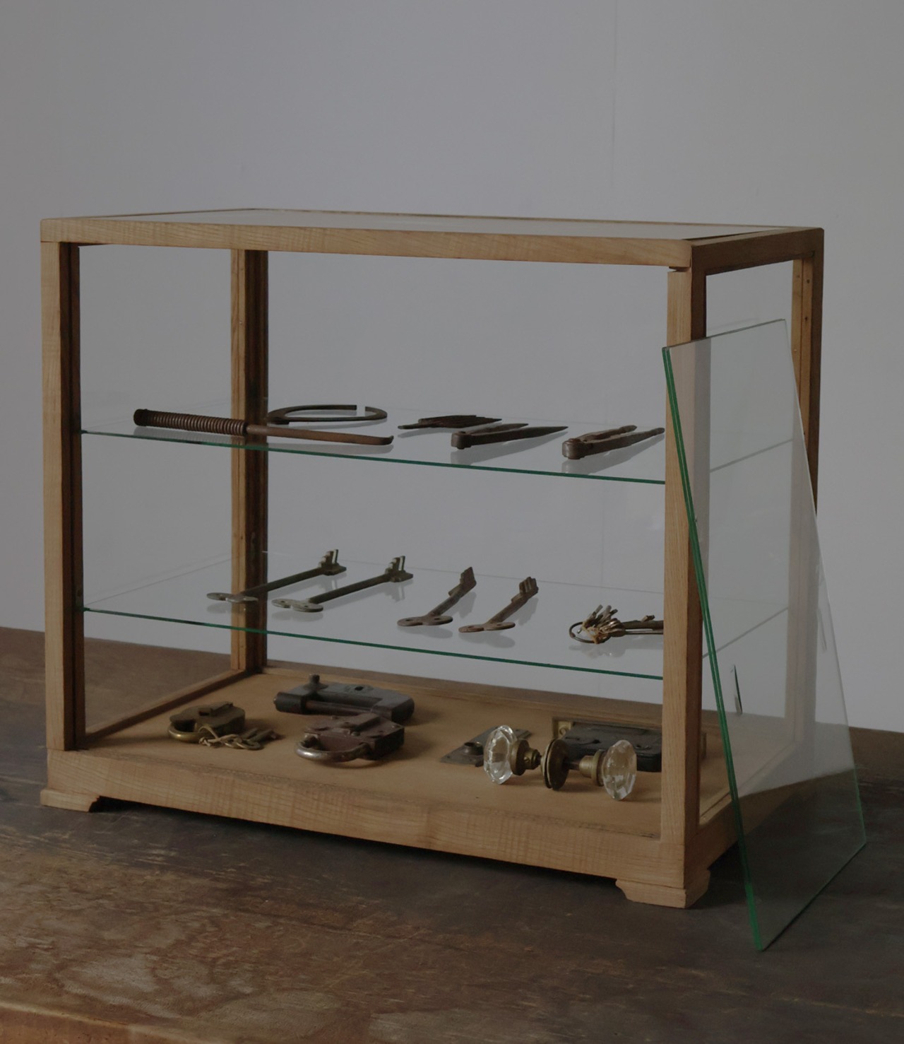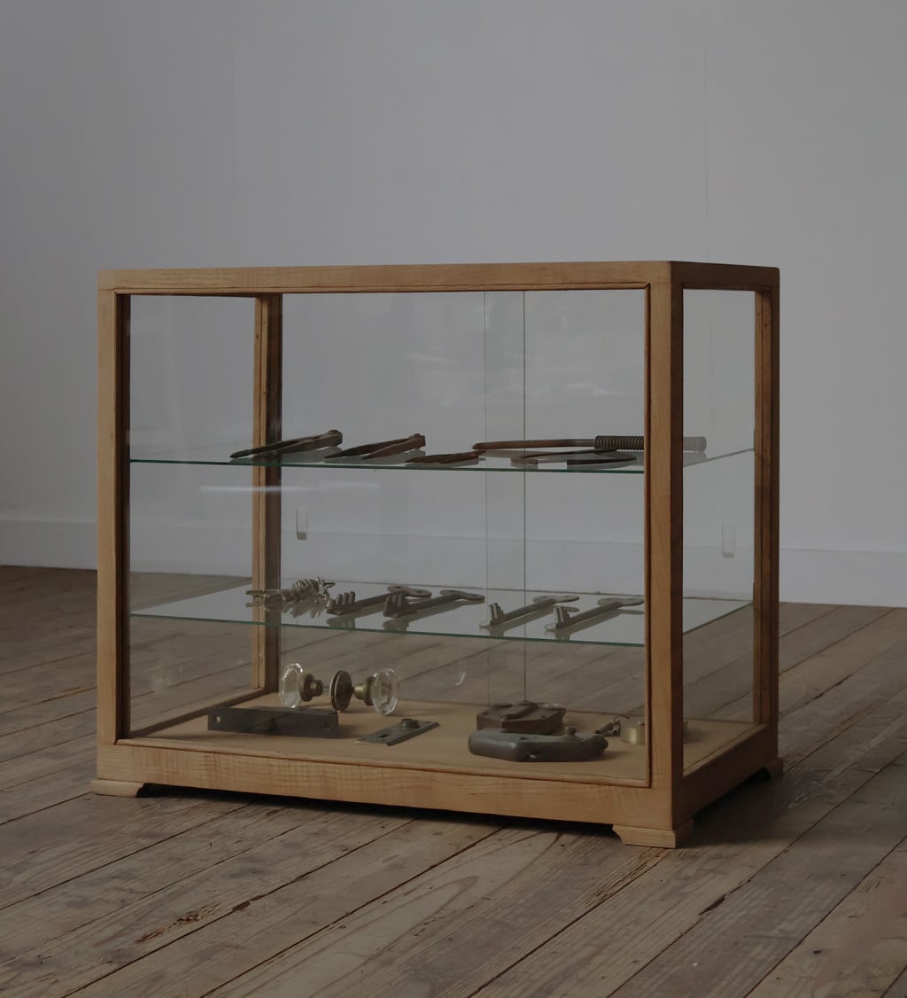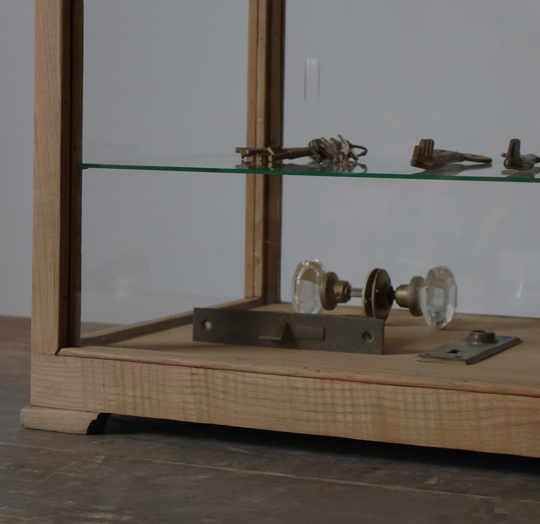 シンプルなグッドデザインで造りも良く、古い木枠の綺麗な木目がとても雰囲気の良いアンティーク卓上5面ガラスショーケースですので、店舗やギャラリー、カフェ、アトリエなどでの什器としてや、ご自宅でのコレクション展示ケースや食器棚、アクセサリーケースなどに