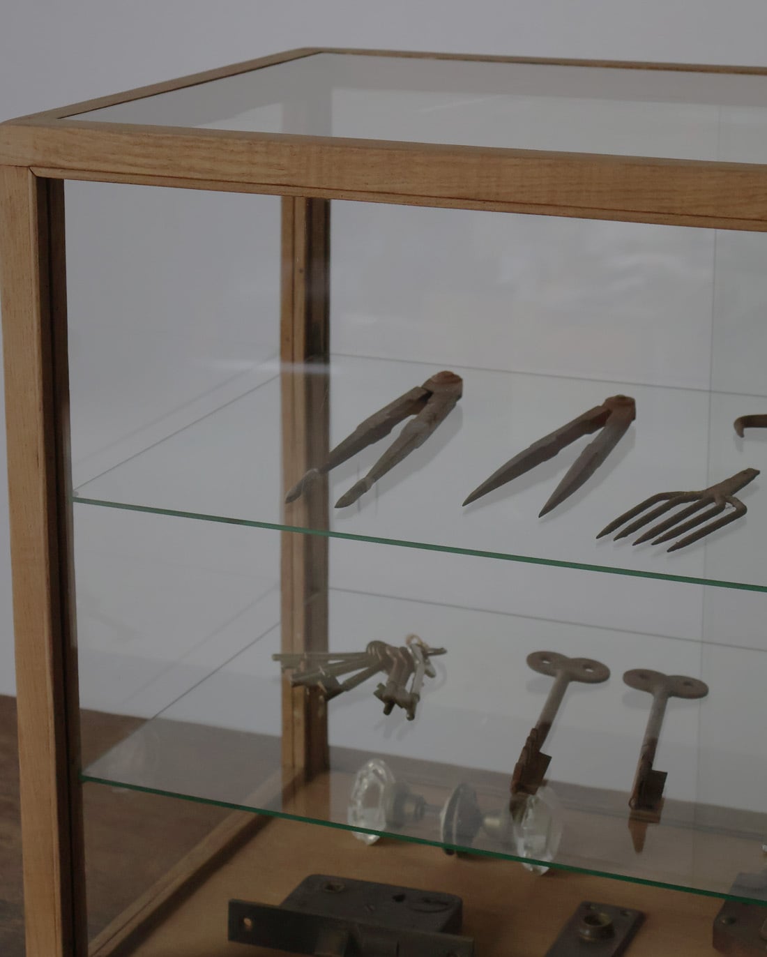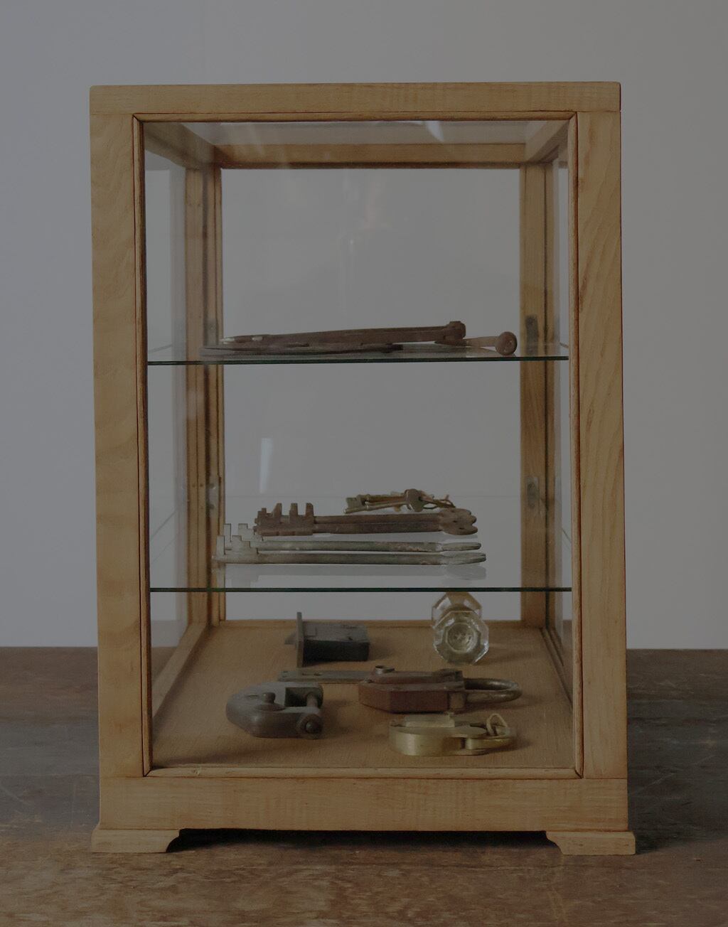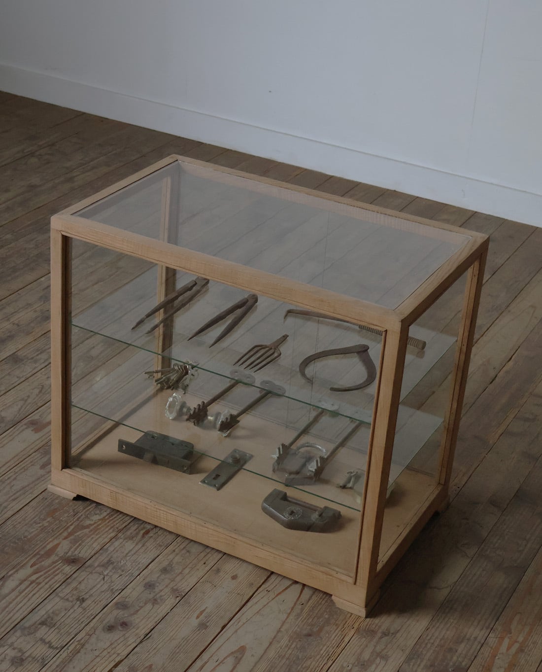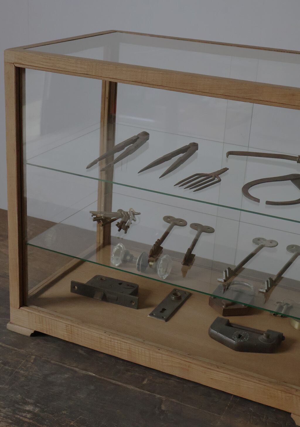 シンプルなグッドデザインで造りも良く、古い木枠の綺麗な木目がとても雰囲気の良いアンティーク卓上5面ガラスショーケースですので、店舗やギャラリー、カフェ、アトリエなどでの什器としてや、ご自宅でのコレクション展示ケースや食器棚、アクセサリーケースなどに