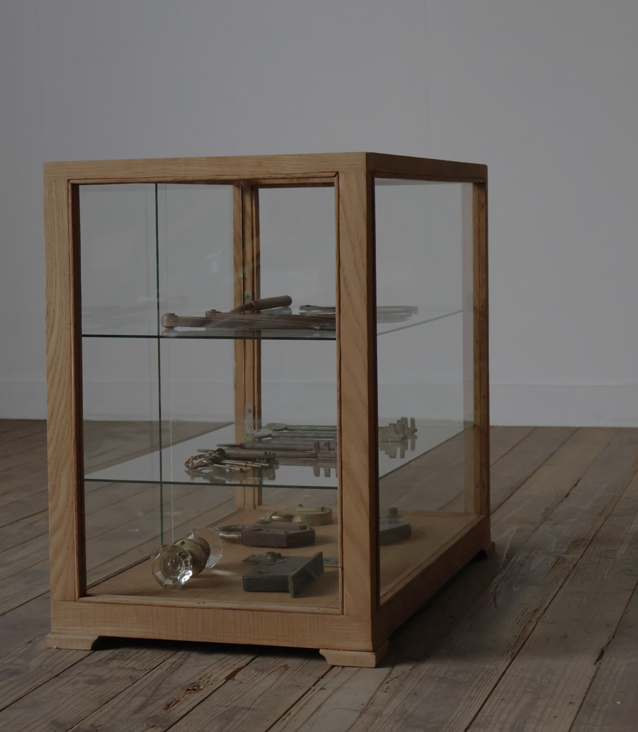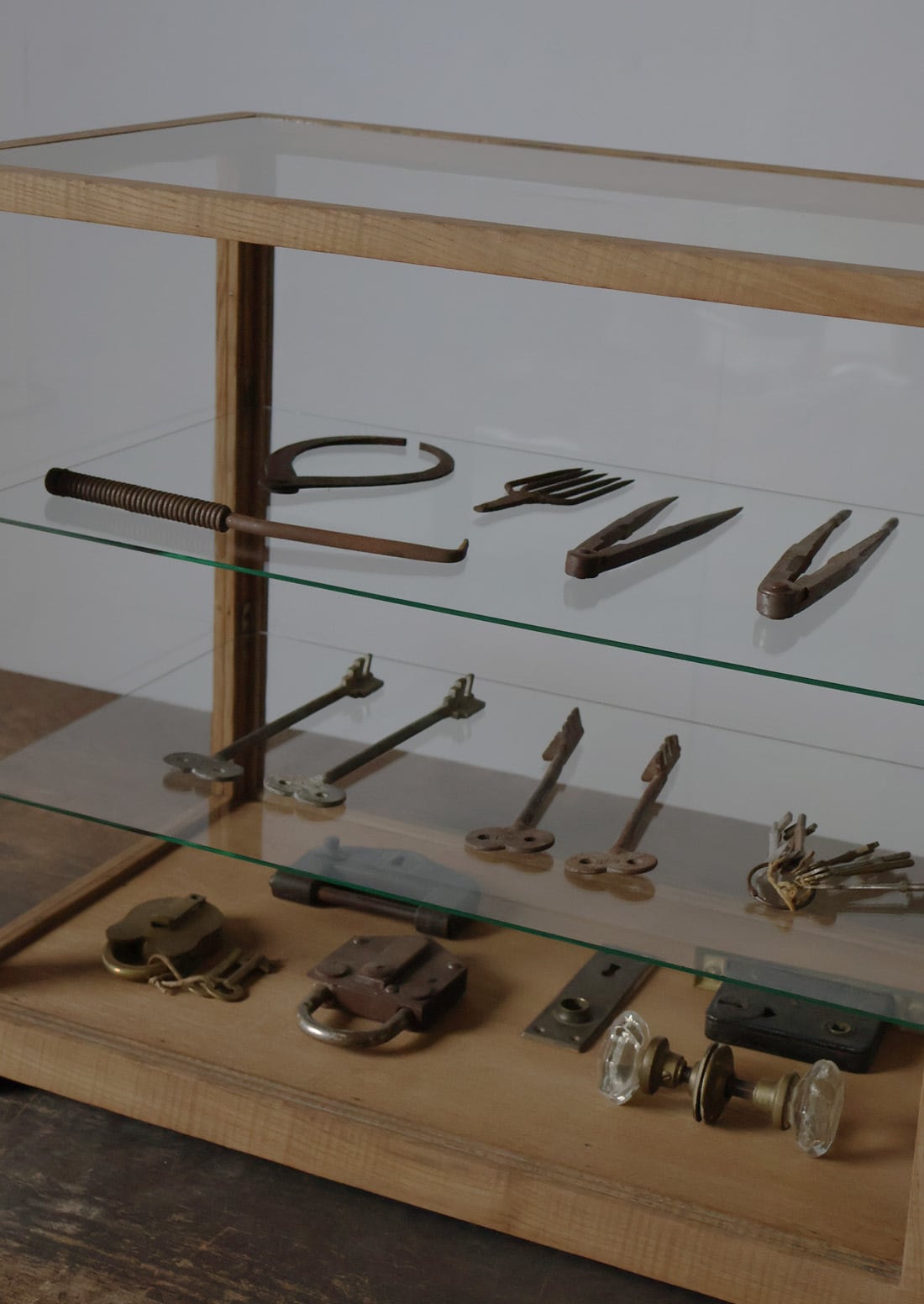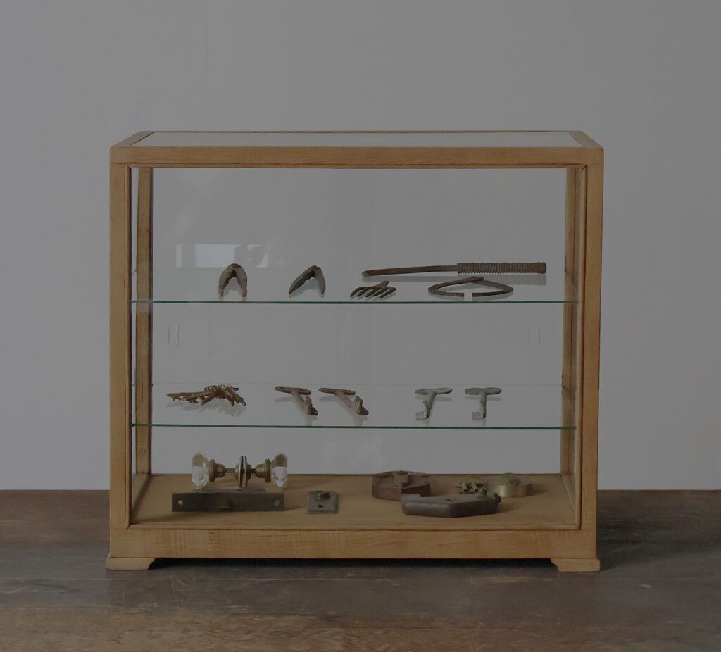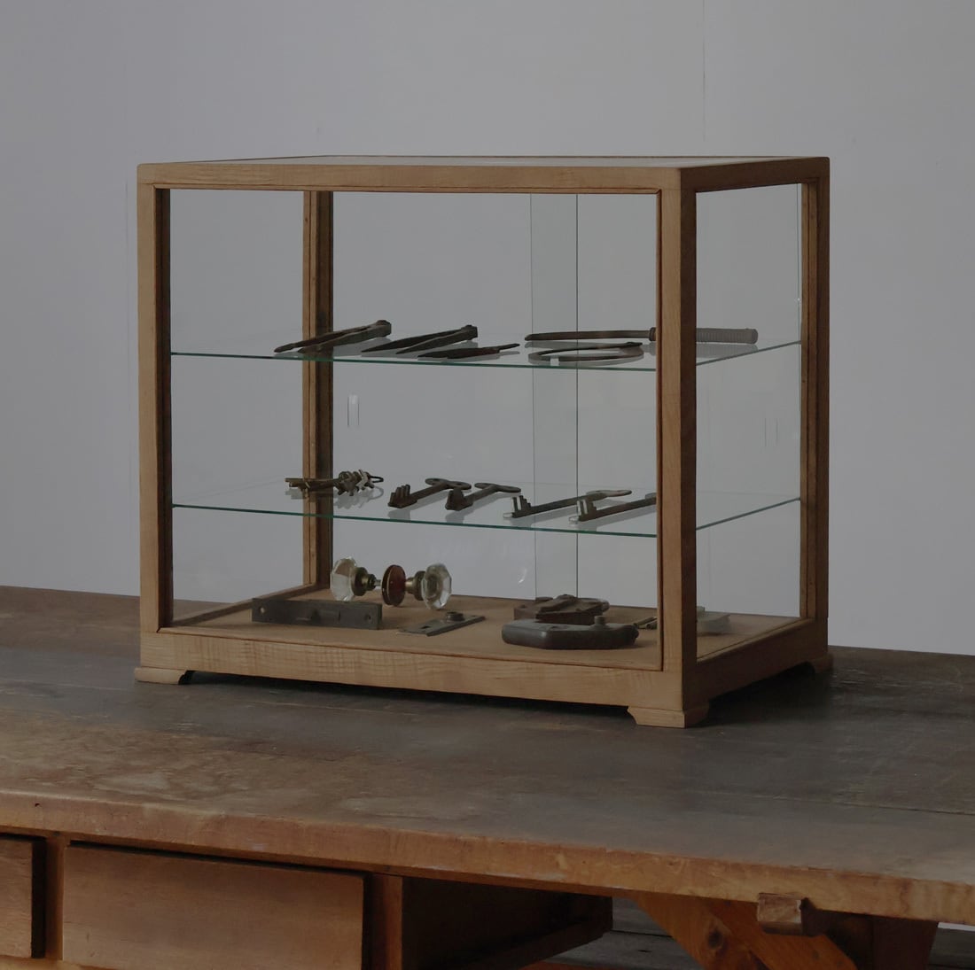 シンプルなグッドデザインで造りも良く、古い木枠の綺麗な木目がとても雰囲気の良いアンティーク卓上5面ガラスショーケースですので、店舗やギャラリー、カフェ、アトリエなどでの什器としてや、ご自宅でのコレクション展示ケースや食器棚、アクセサリーケースなどに