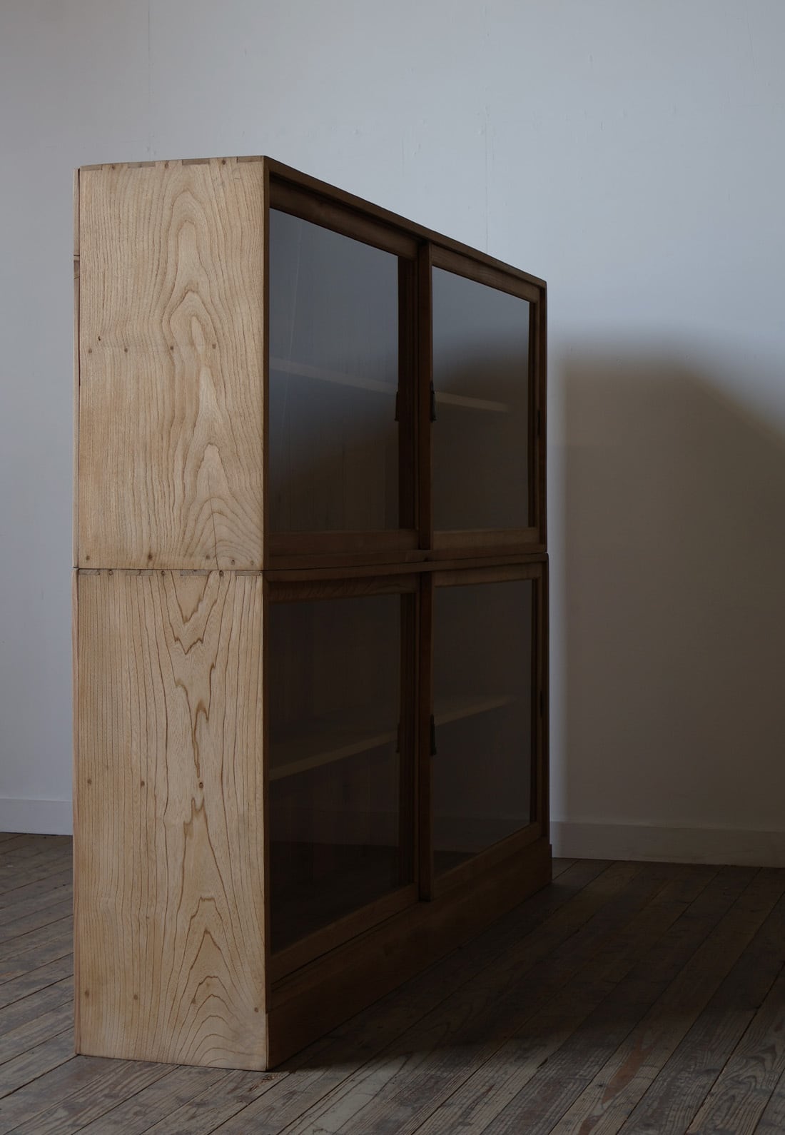 古い無垢材の綺麗な木目がとても雰囲気の良いアンティーク重ねガラス戸棚です。