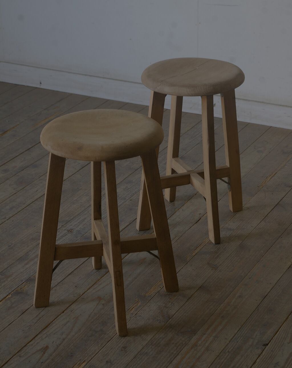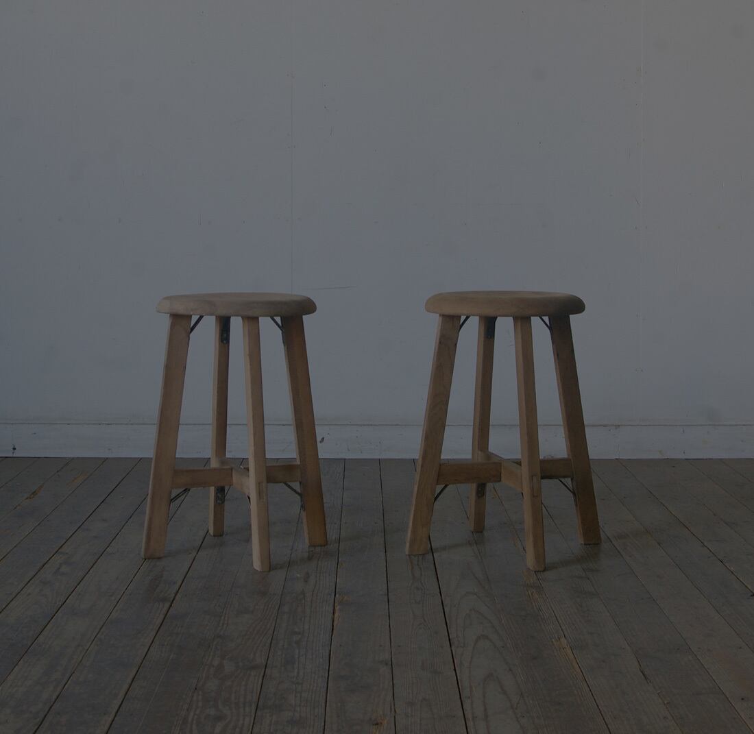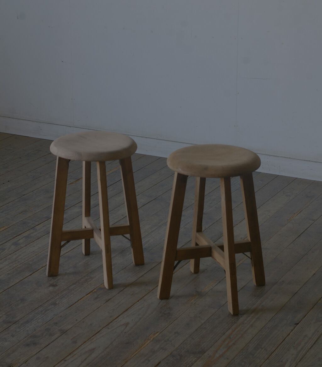 重厚な古い無垢材の綺麗な木目がとても雰囲気の良いアンティーク丸スツール2脚セットです。