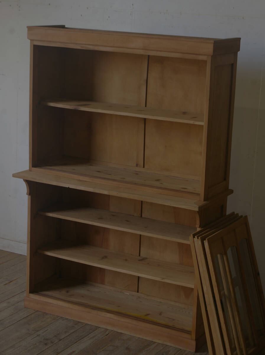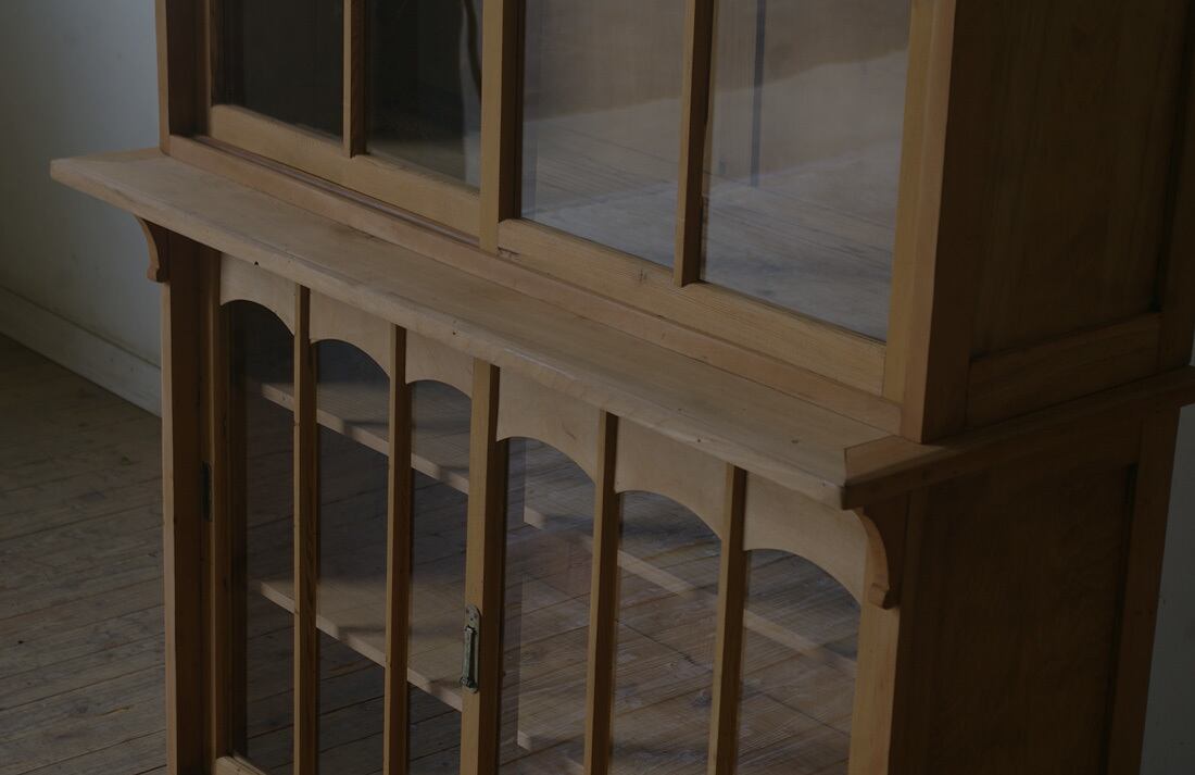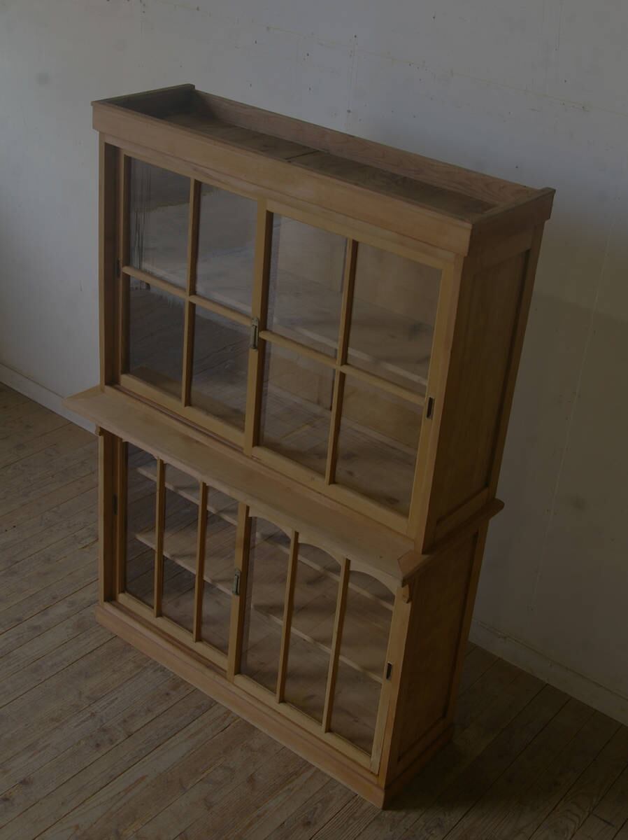 立派な造りで存在感があり、とても珍しいデザインのアンティーク重ねガラス戸棚です。