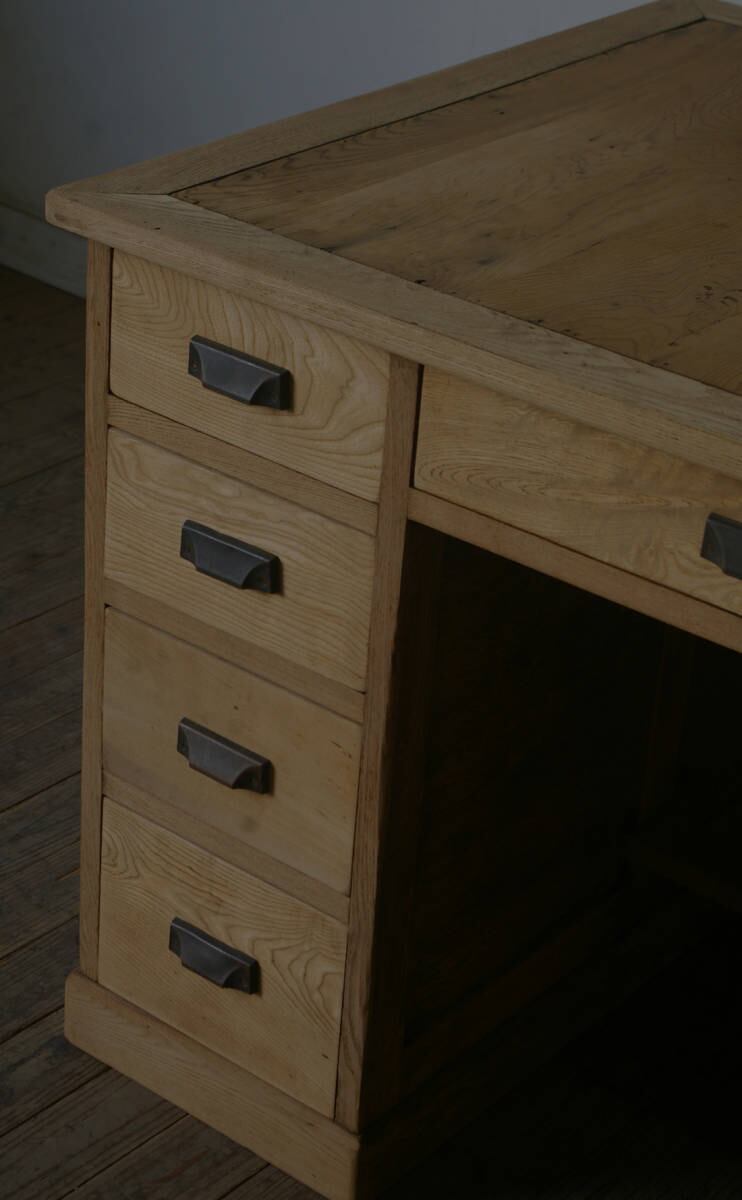 立派な造りでデザインも良く、迫力があり、味のある古い楢材枠の綺麗な木目がとても雰囲気の良いアンティークデスクです。