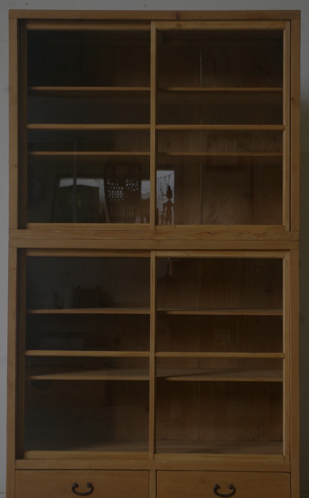 立派な造りで収納力もあり、古い無垢材の綺麗な木目がとても雰囲気の良いアンティーク重ねガラス戸棚です。