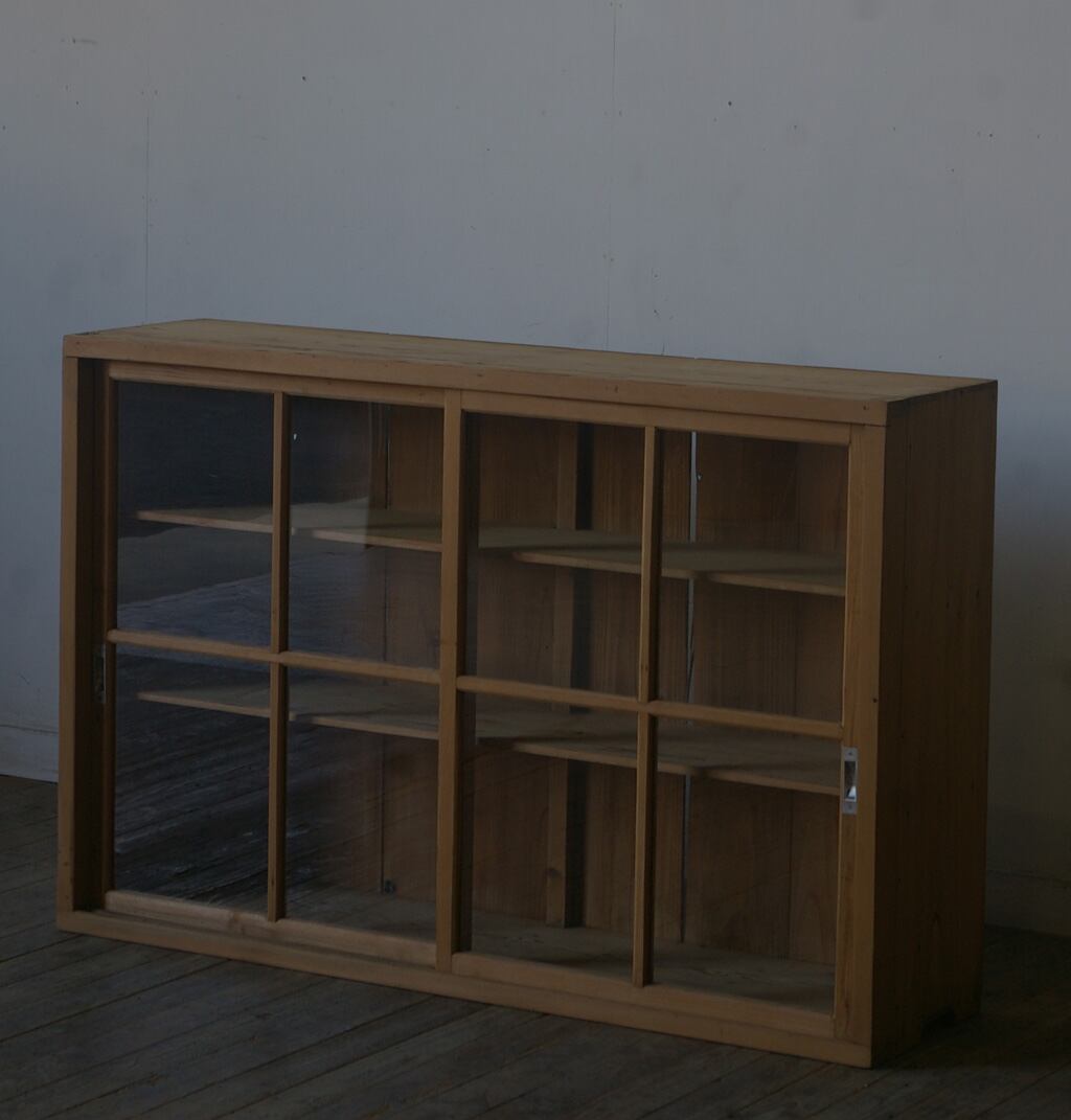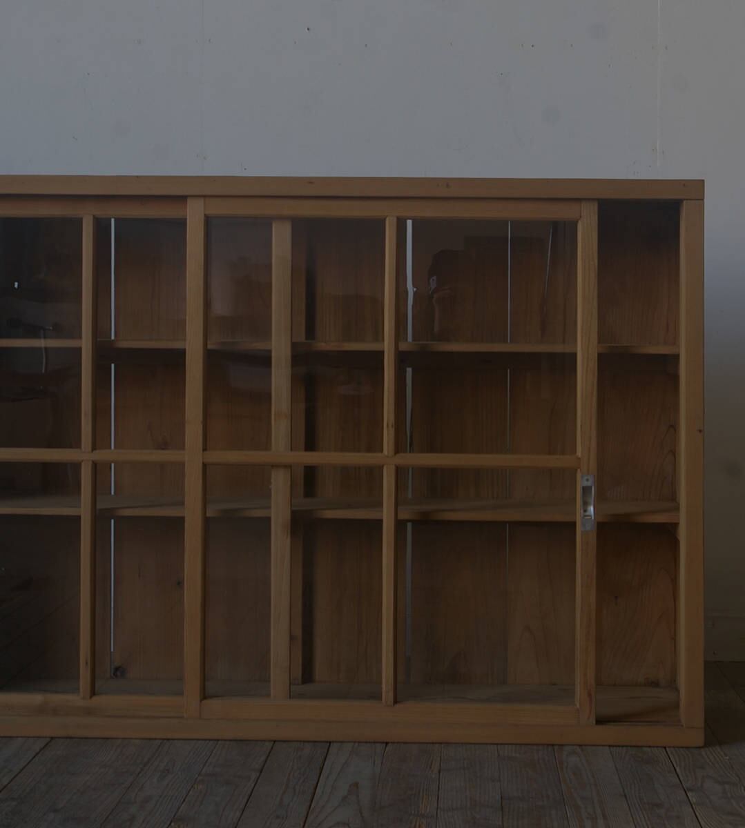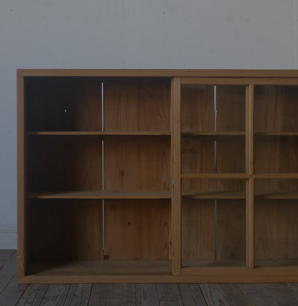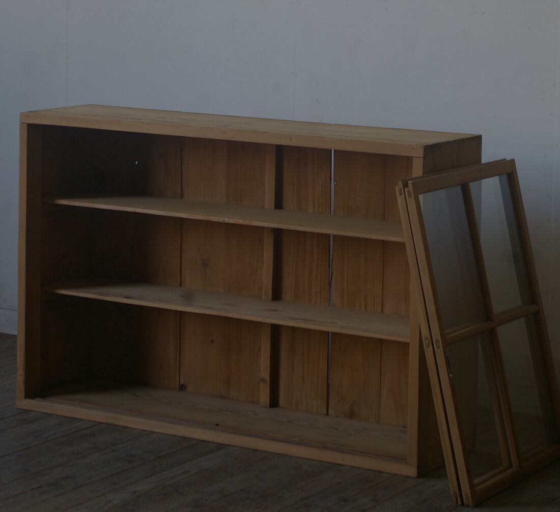 立派な造りでサイズ感も良く、大きな2枚の十字ガラス戸と味のある古い無垢材の綺麗な木目がとても雰囲気の良いアンティーク横長ガラス戸棚です。
