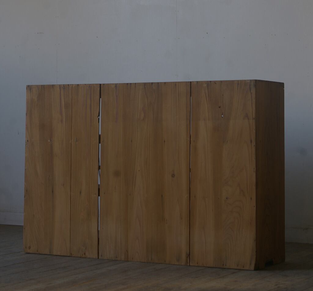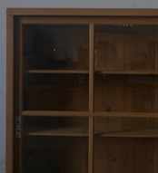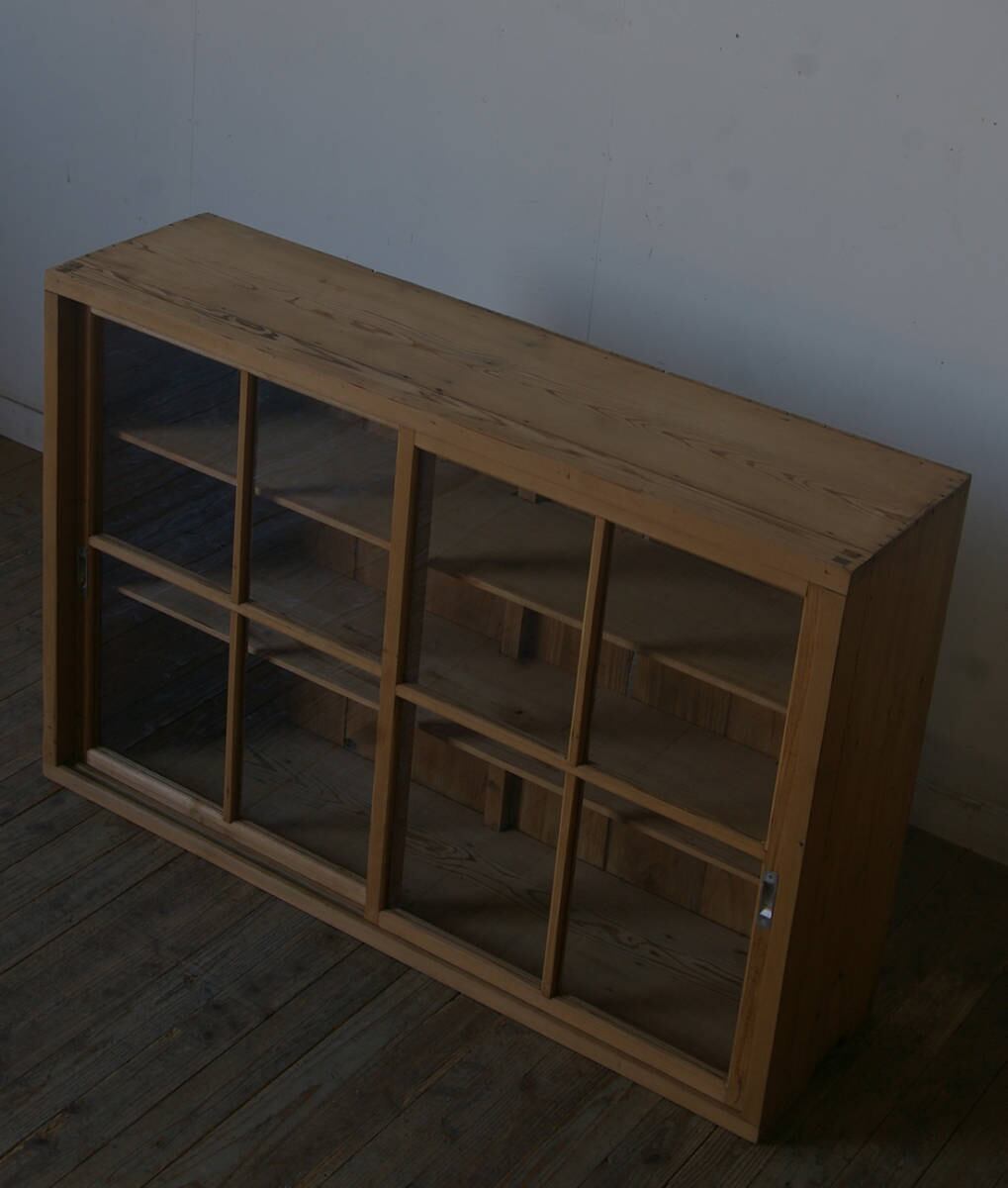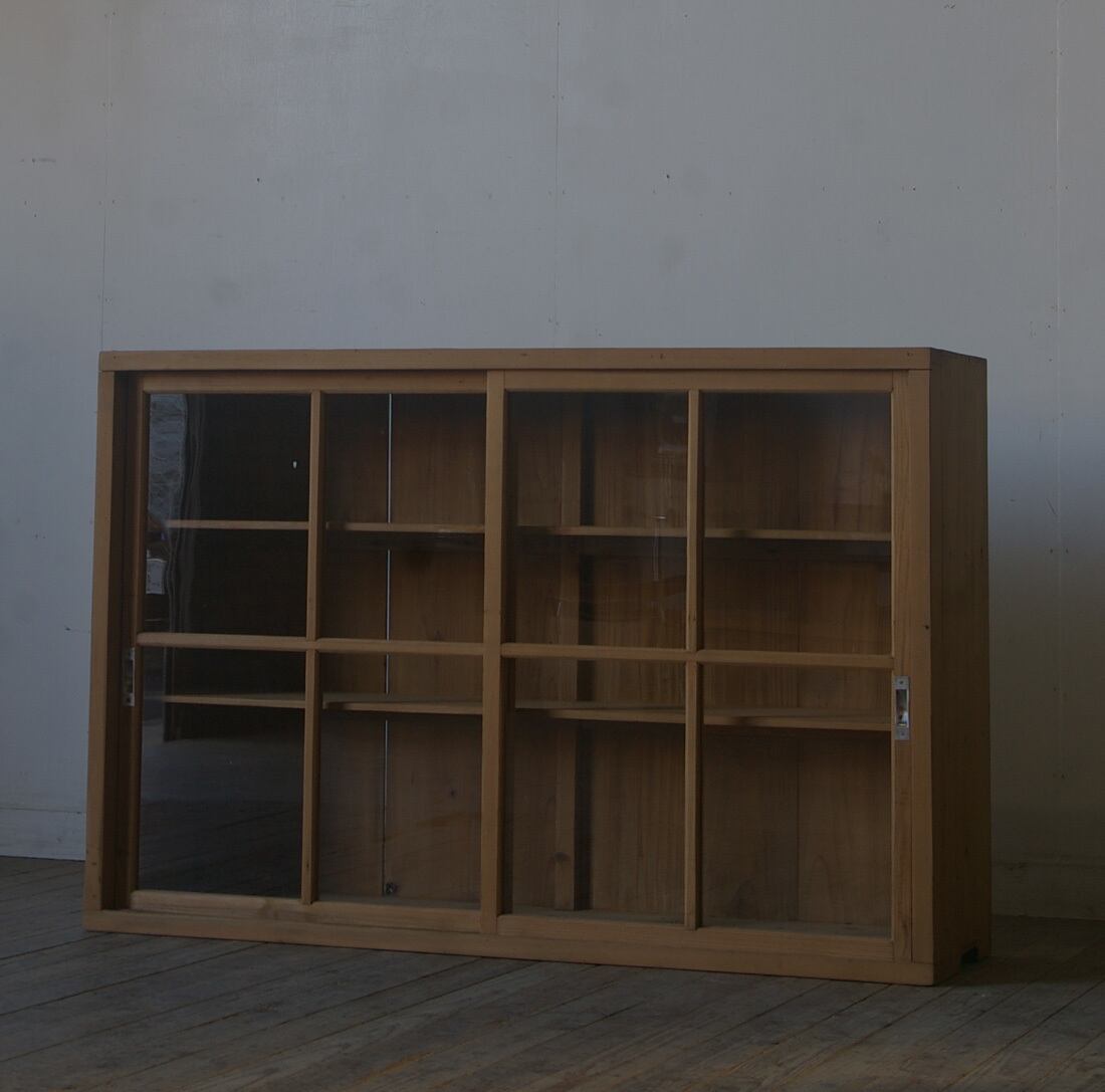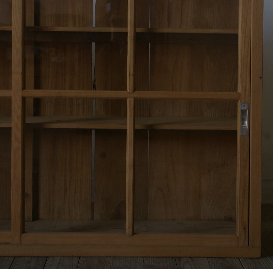立派な造りでサイズ感も良く、大きな2枚の十字ガラス戸と味のある古い無垢材の綺麗な木目がとても雰囲気の良いアンティーク横長ガラス戸棚です。