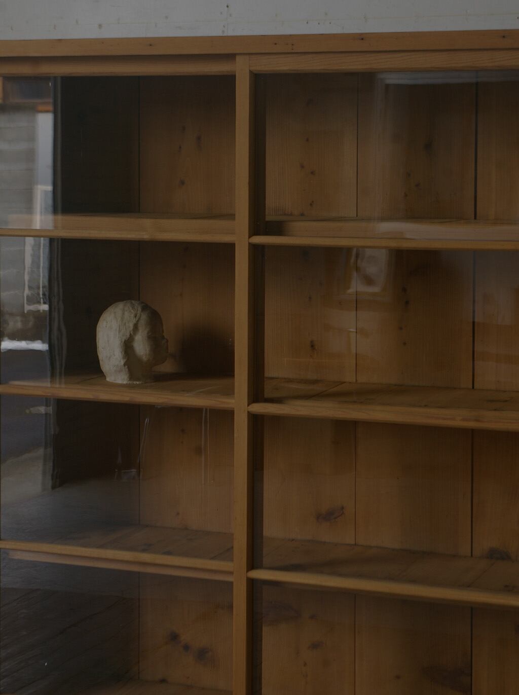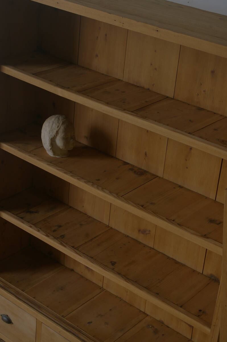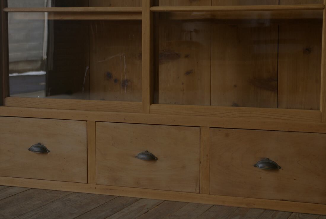 古い無垢材の綺麗な木目がとても雰囲気の良いアンティーク大きなガラス戸棚です。