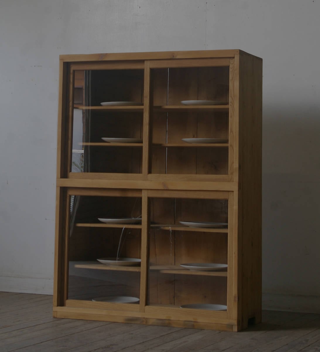シンプルなデザインで収納力もあり、4枚のゆらゆらガラス戸と古い無垢材の組み合わせがとても雰囲気の良いアンティークガラス戸棚です。
