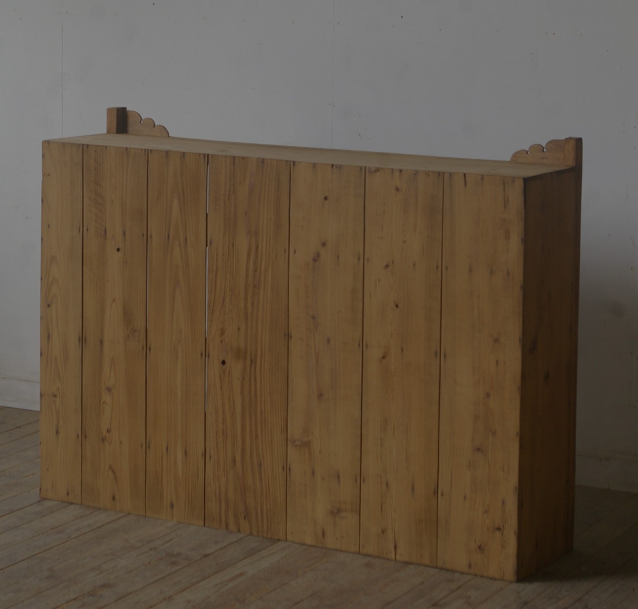 珍しいデザインで造りも良く、薄型で、大小計8枚のガラス戸と4杯の引き出し、味のある古い無垢材の綺麗な木目がとても雰囲気の良いアンティークガラス戸棚です。