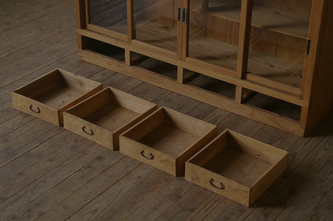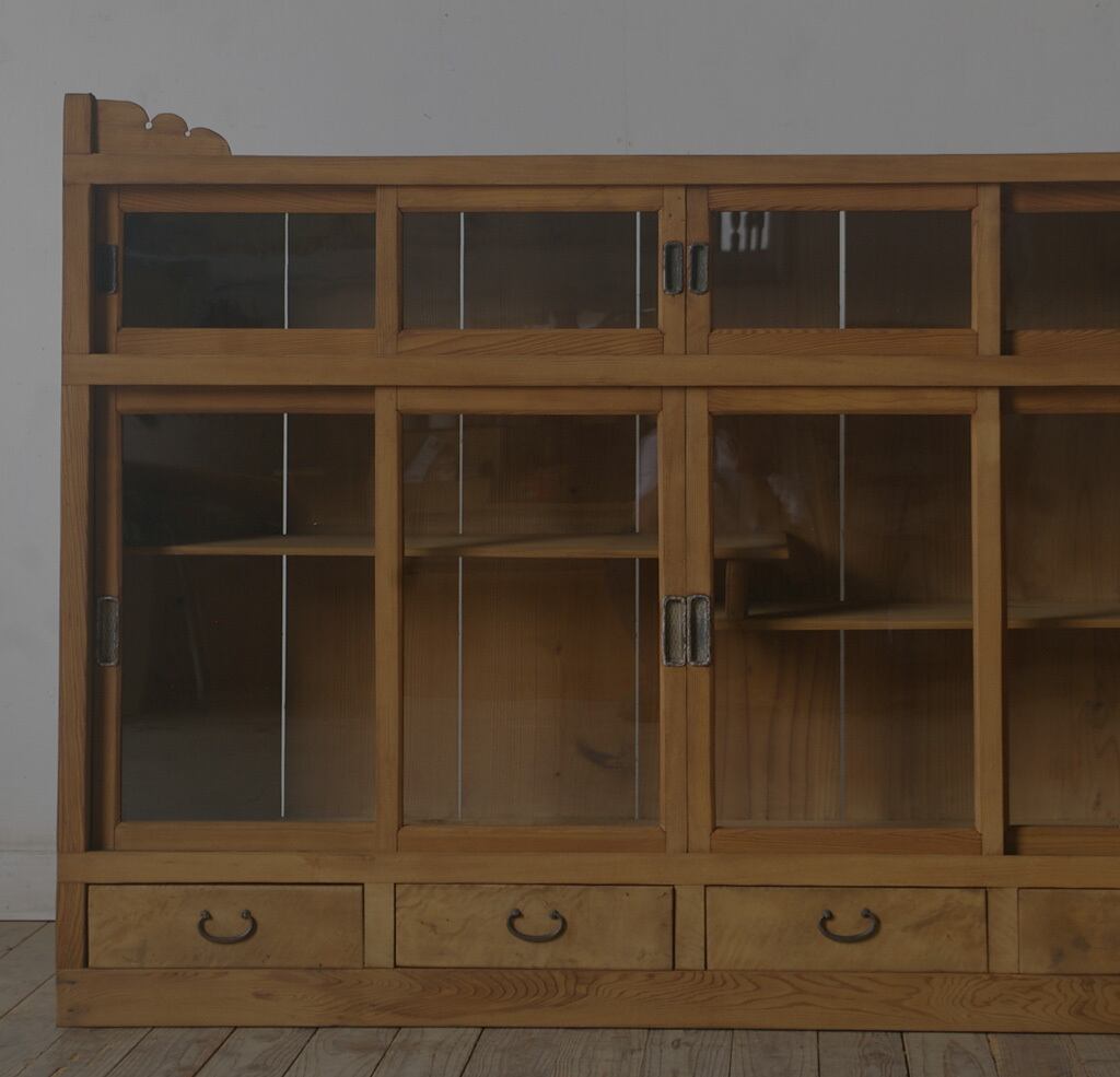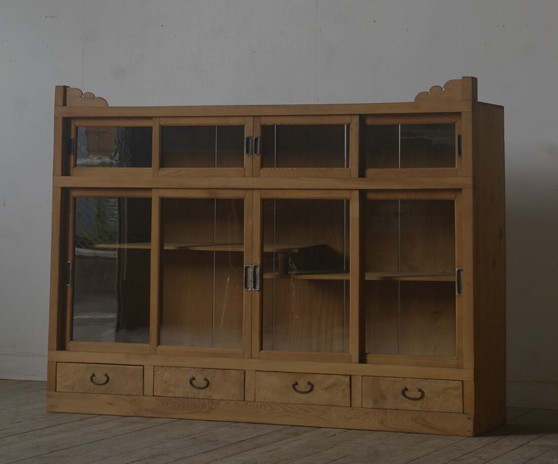 造りの良い◆古い薄型ガラス8枚戸棚◆引き出し4杯 YZ2013