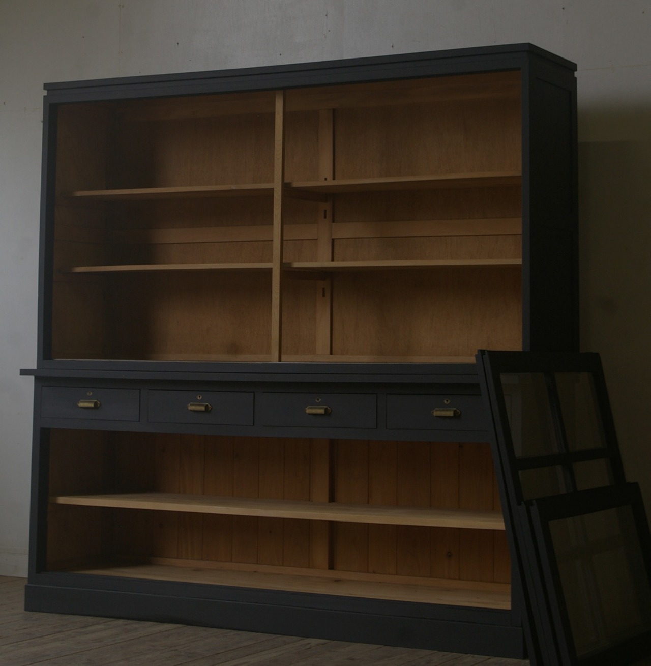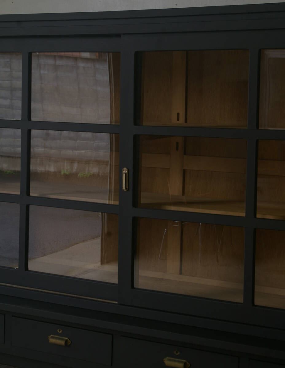 古い重ね大きな格子ガラス戸棚◆引き出し4杯 YZ2022