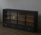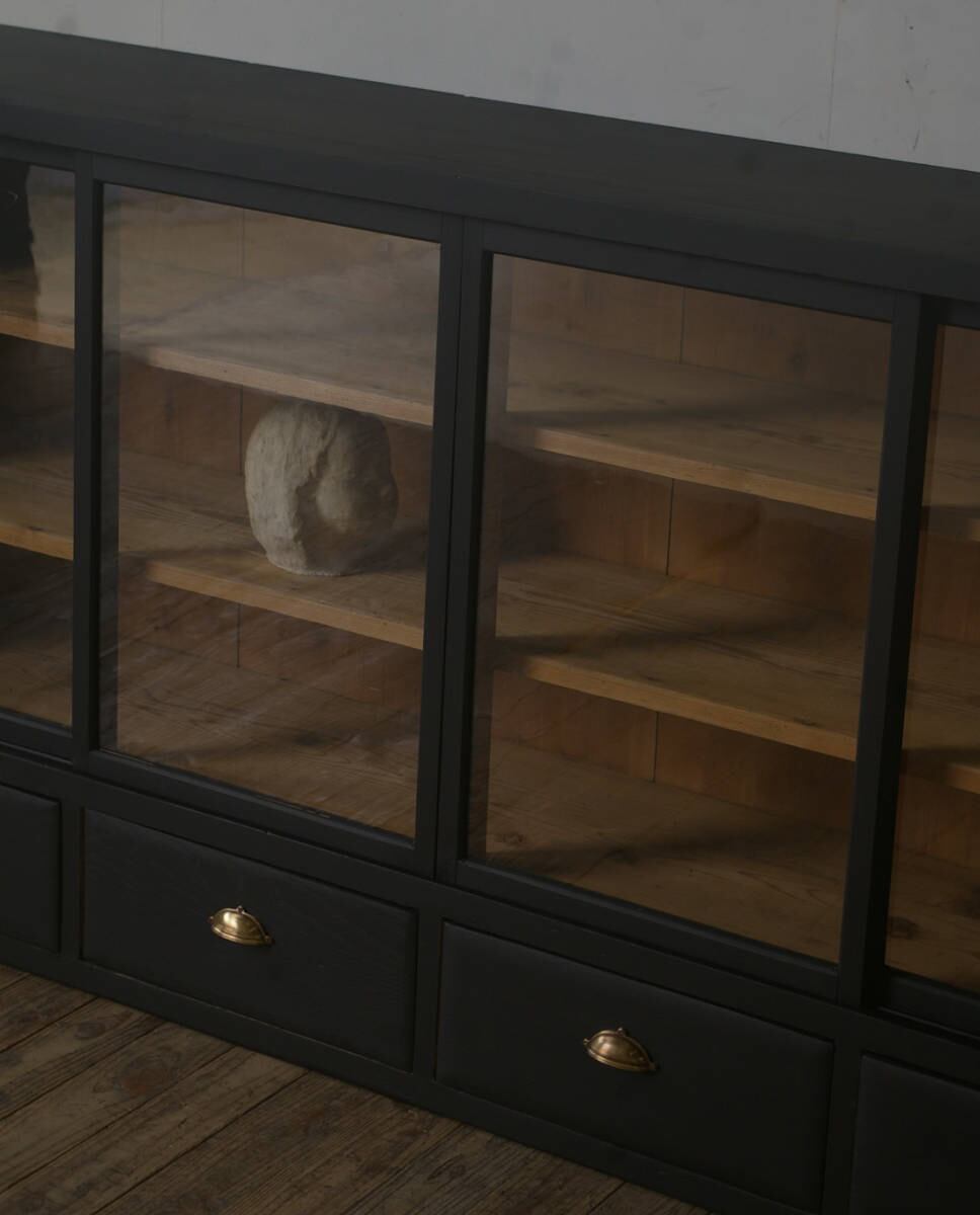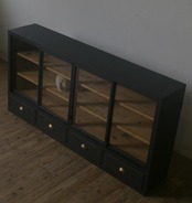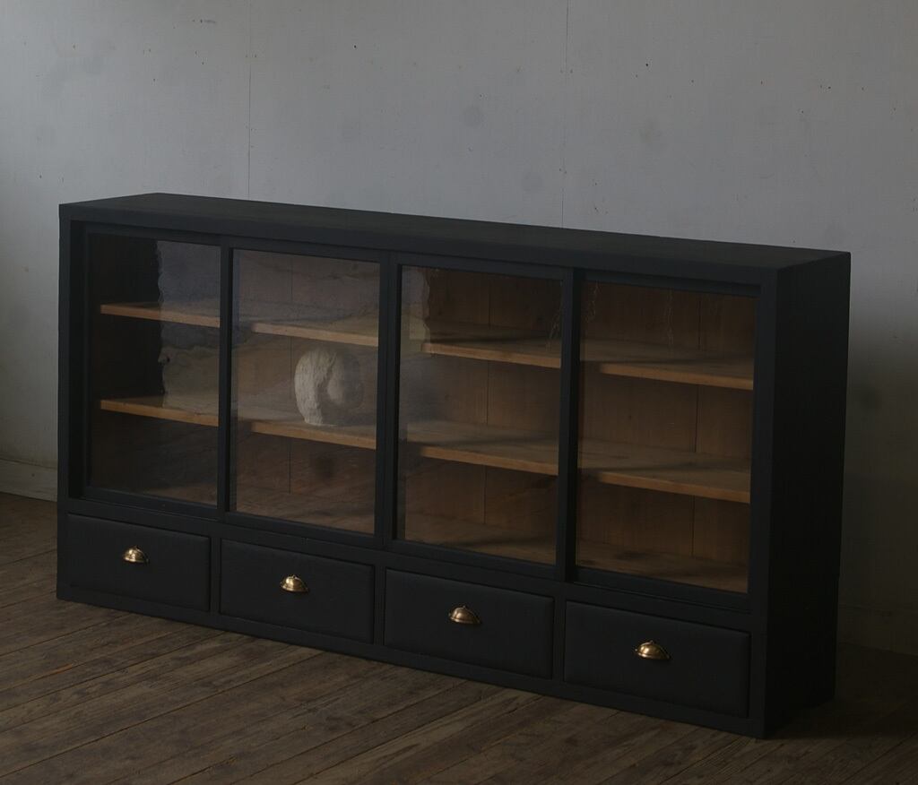 引き出し4杯◆古い横長ゆらゆら4枚ガラス戸棚 YZ2044