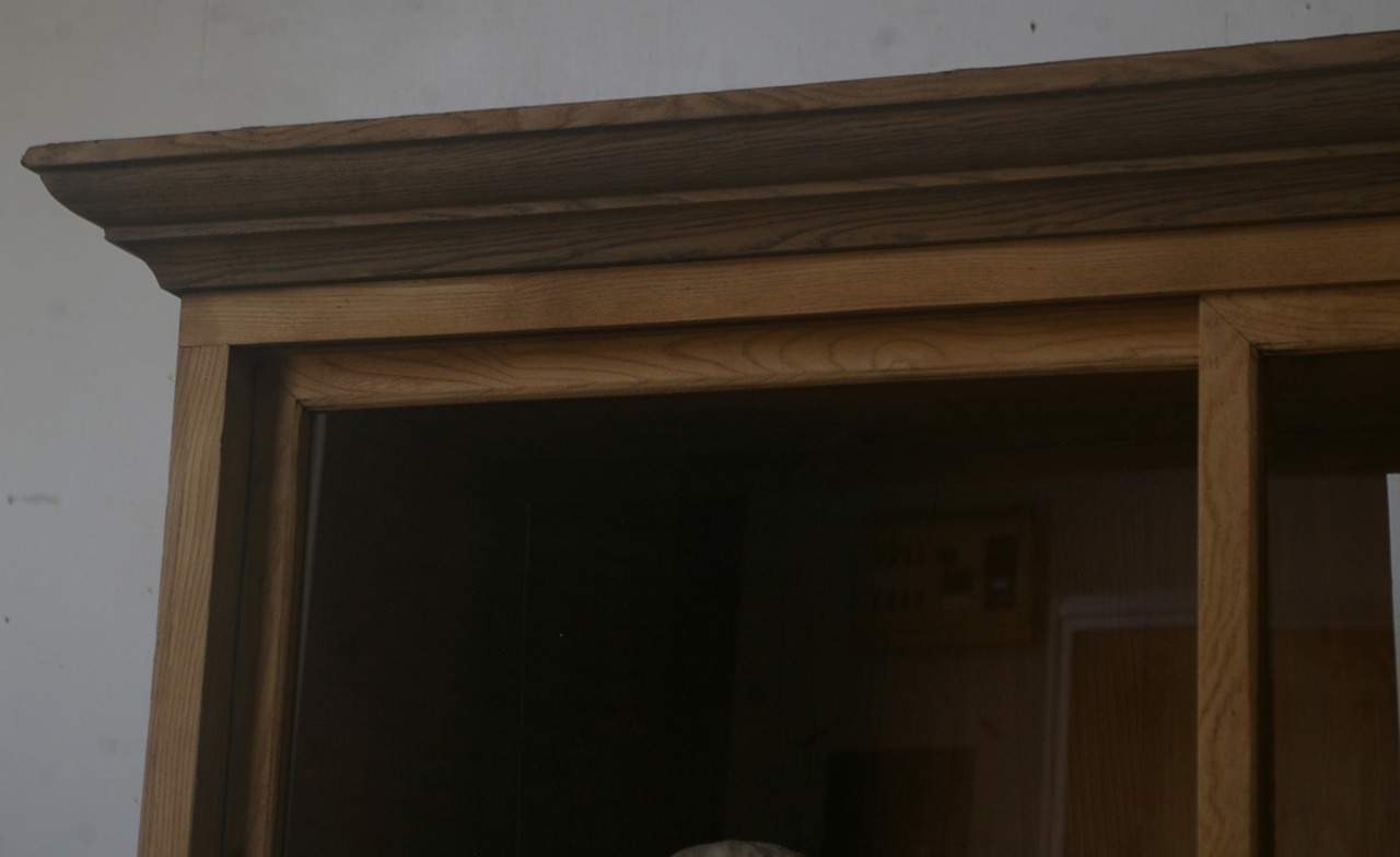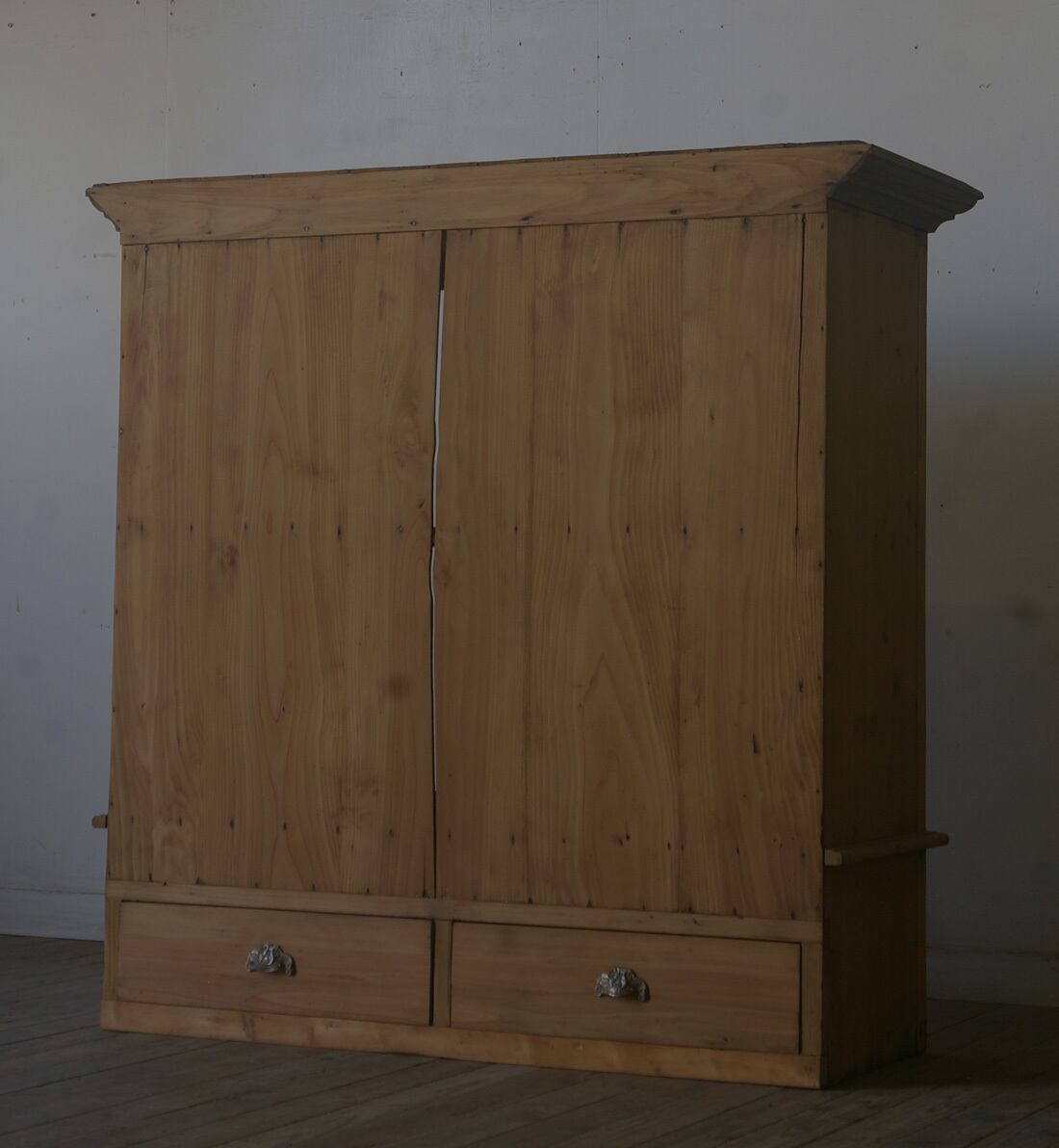 大きな2枚のガラス戸と味のある古い無垢材の綺麗な木目がとても雰囲気の良いアンティーク煙草屋のガラス戸棚です。