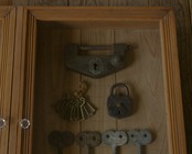 珍しいデザインで造りも良いアンティーク上開き観音扉ガラスケースです。