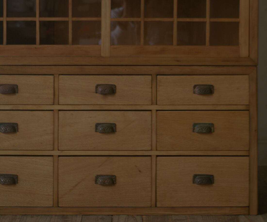 珍しいデザインで造りも良く、大きな細かい格子ガラス戸2枚と9杯の引き出し、古い無垢材の綺麗な木目がとても雰囲気の良いアンティーク引き出し9杯格子ガラス戸棚になります。