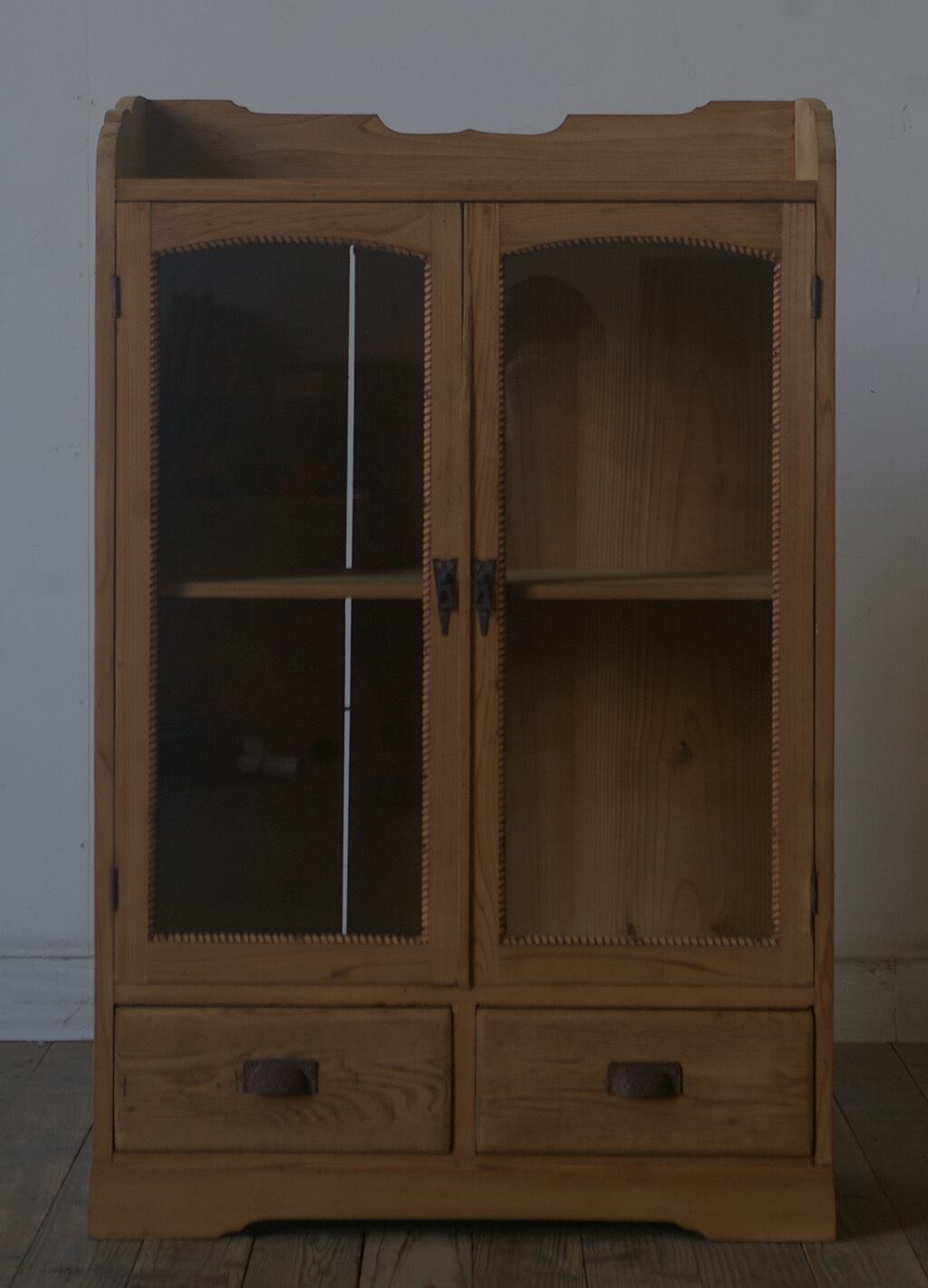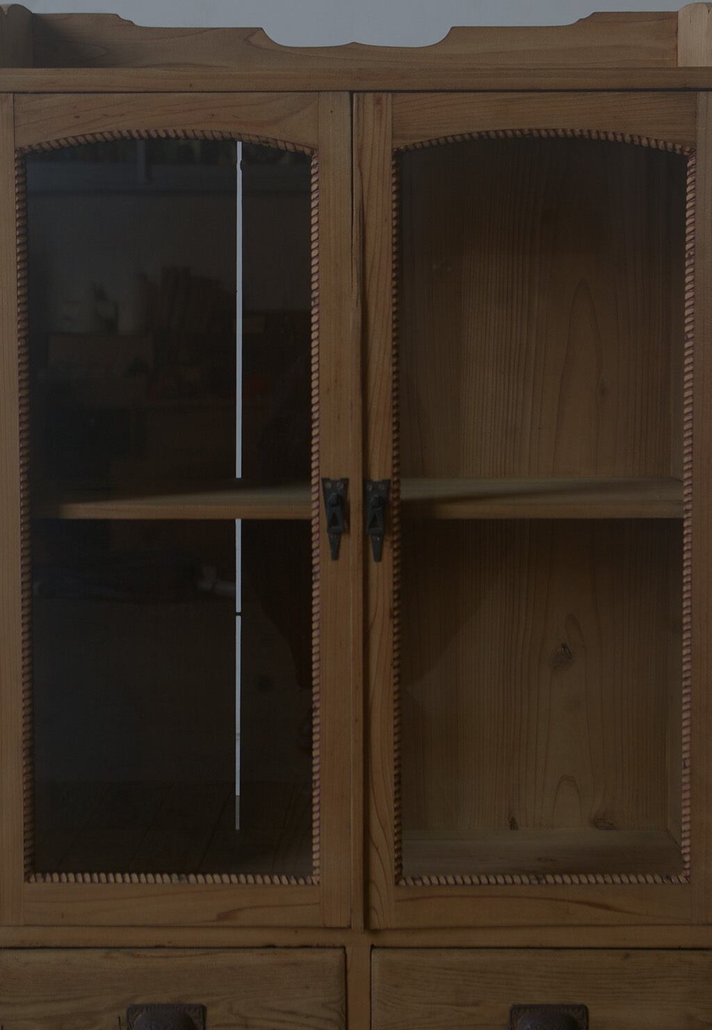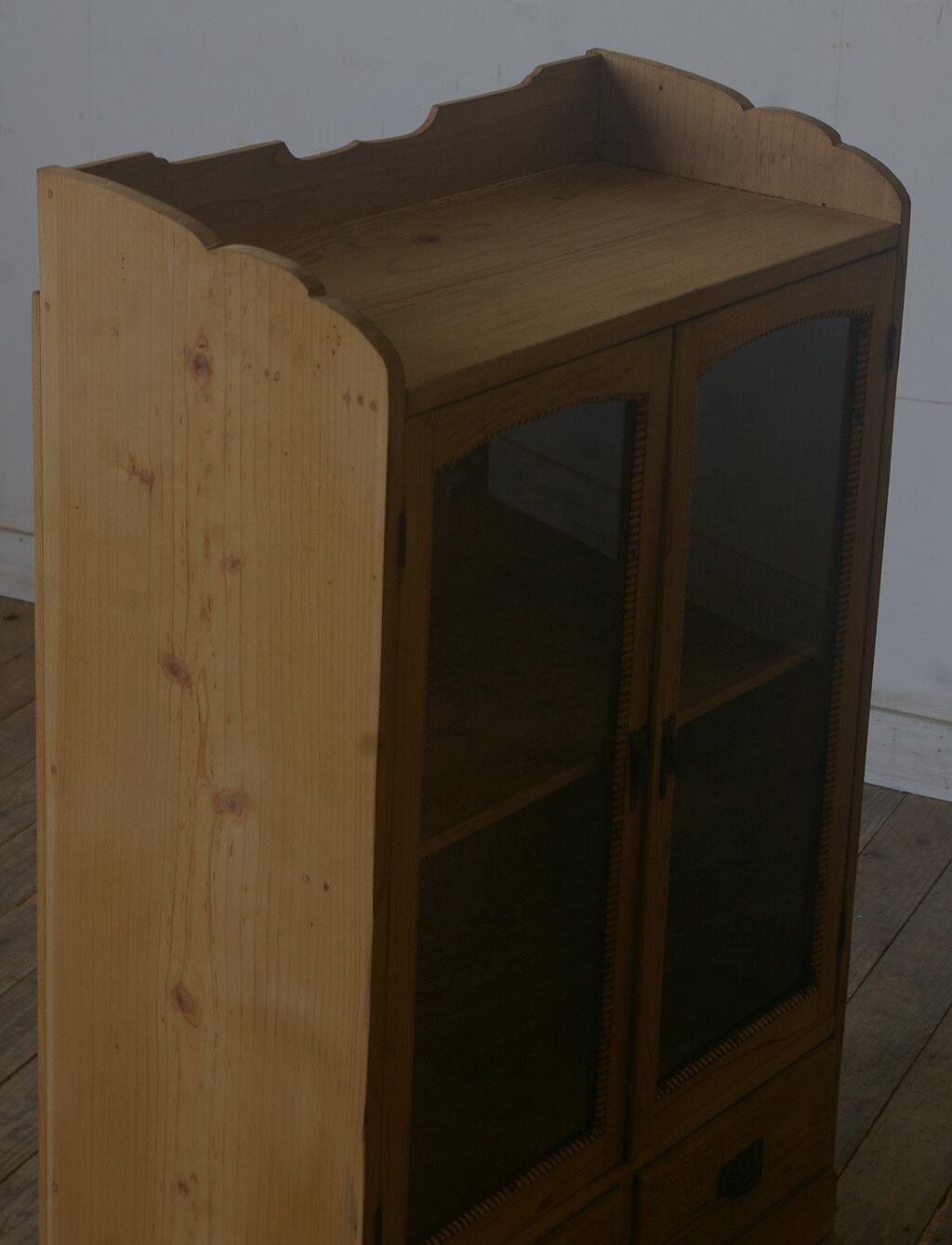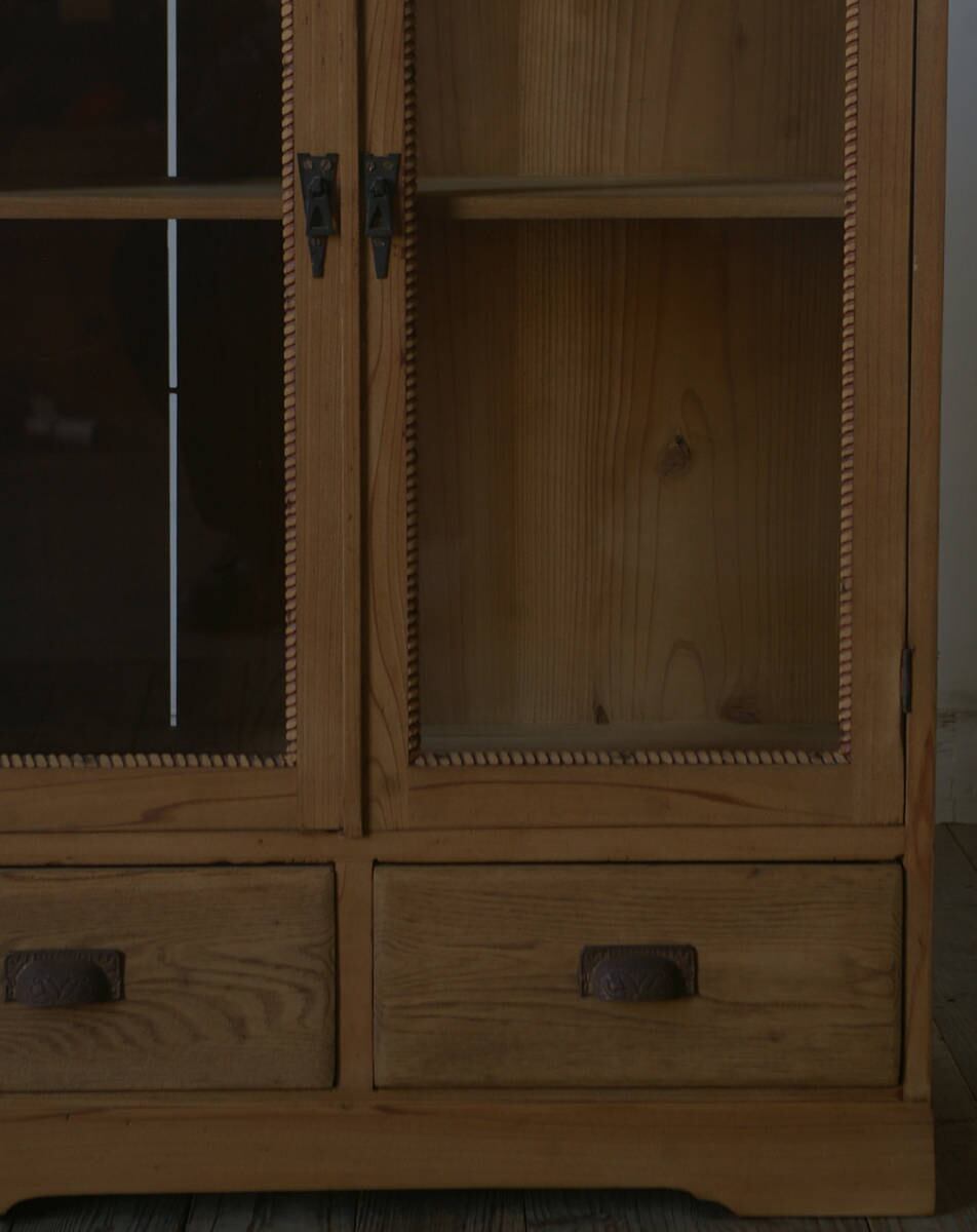 立派な造りでデザインも良く、古い無垢材の綺麗な木目がとても雰囲気の良いアンティークガラス観音扉飾り棚です。