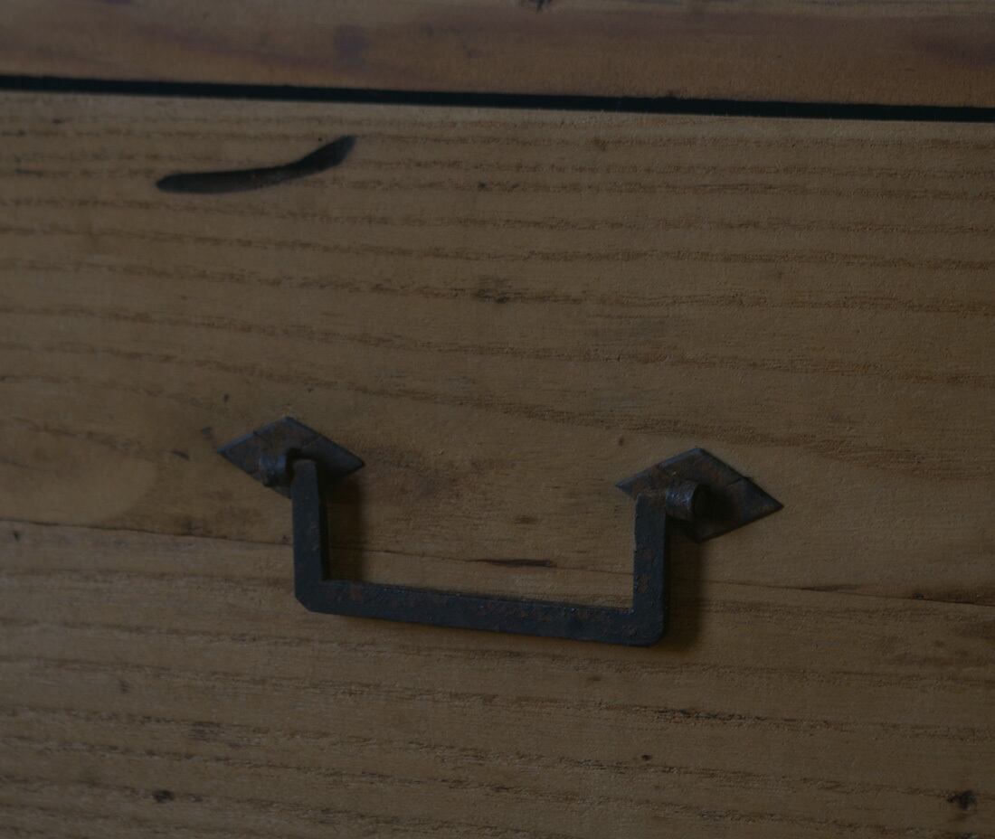 大きな5杯の引き出しと重厚な古い無垢材の綺麗な木目がとても雰囲気の良いアンティーク横長ローチェストです。