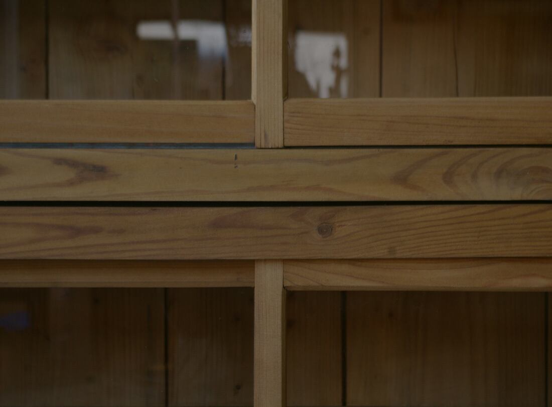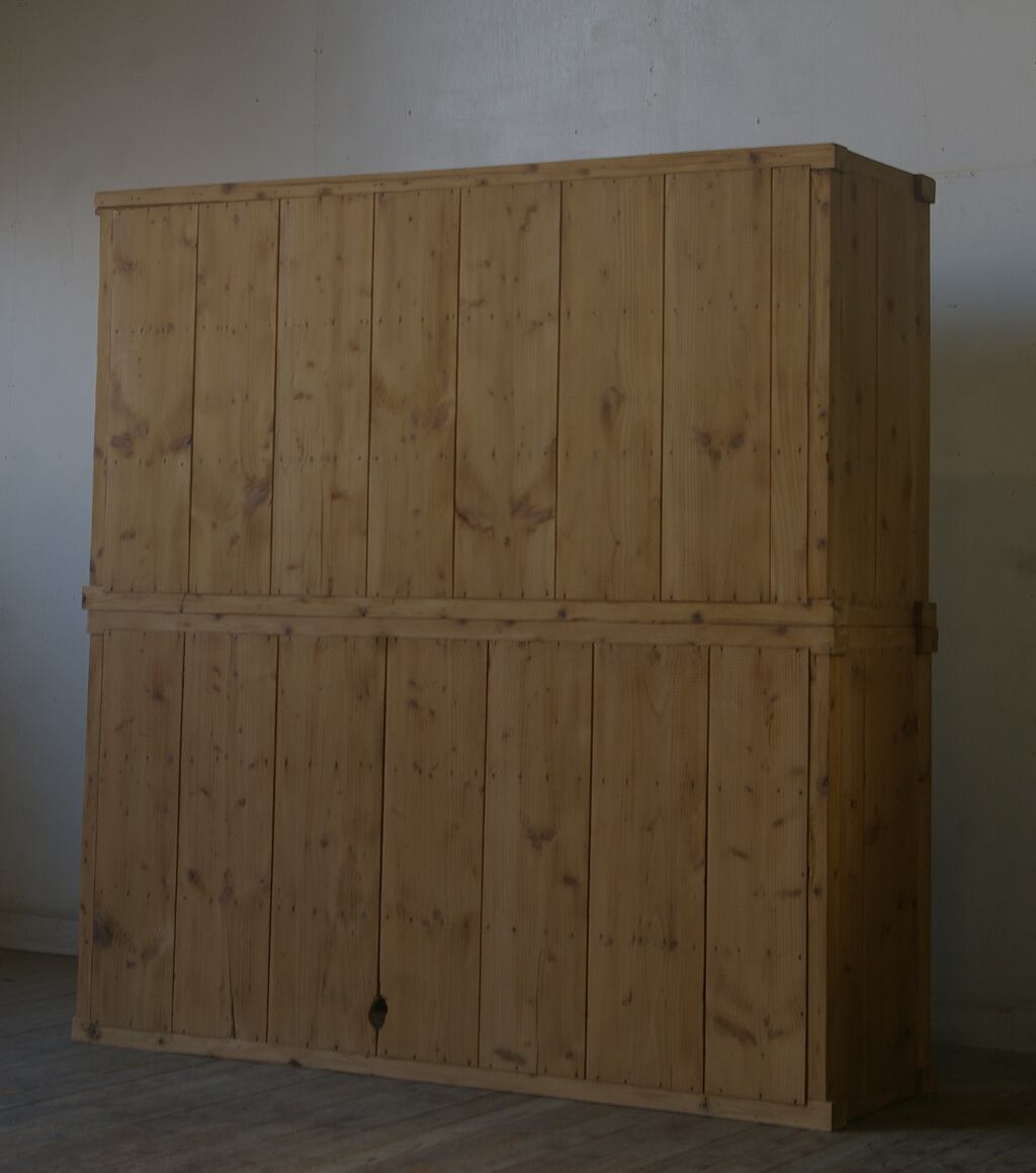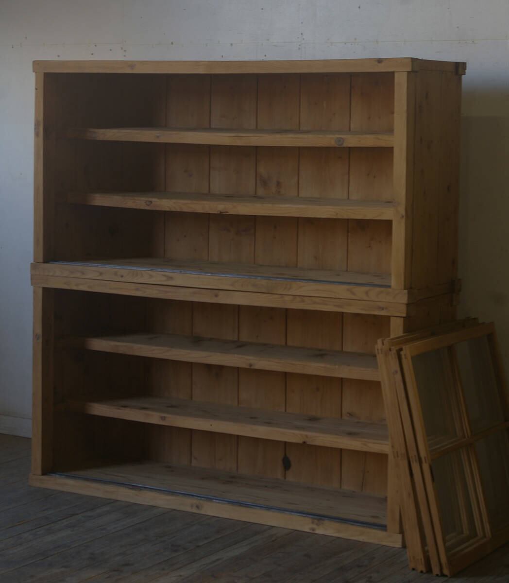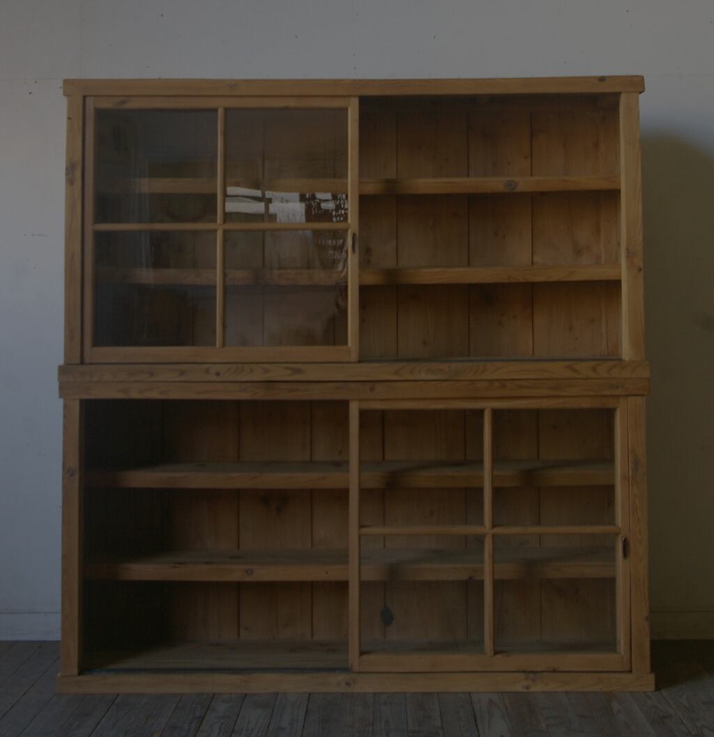 立派な造りで収納力もあり、大きな4枚の十字ガラス戸と古い無垢材の綺麗な木目がとても雰囲気の良いアンティーク重ねガラス戸棚です。