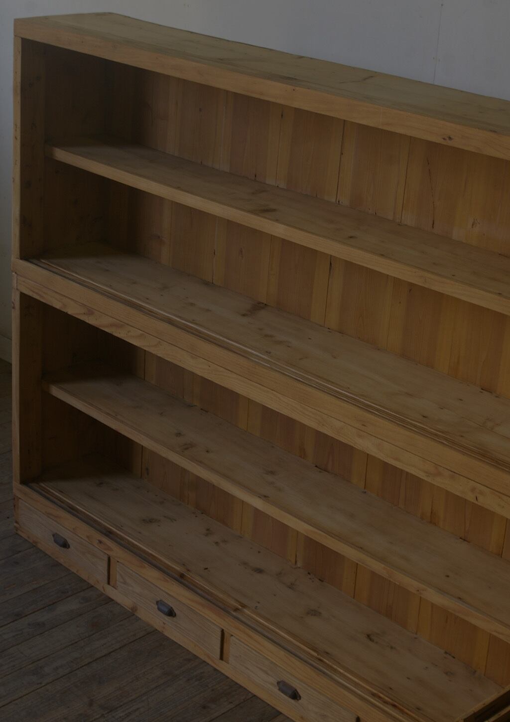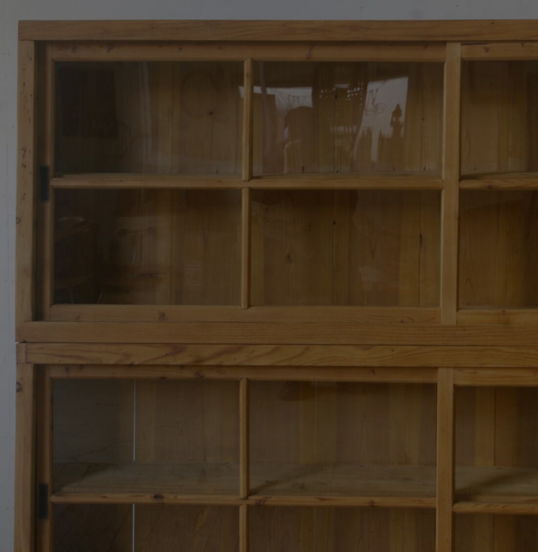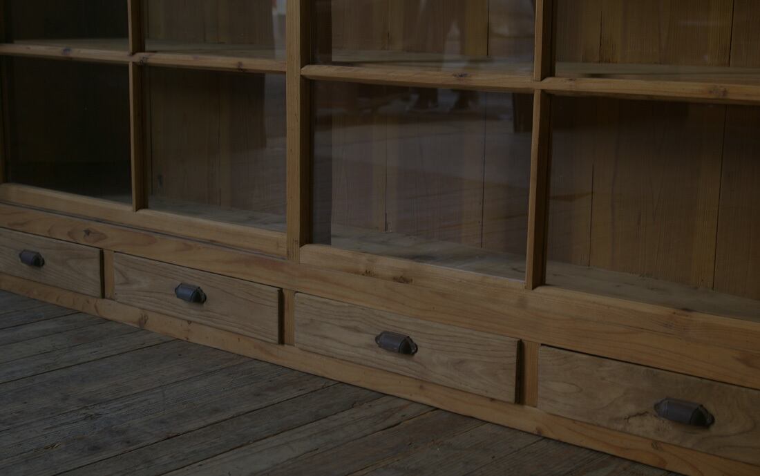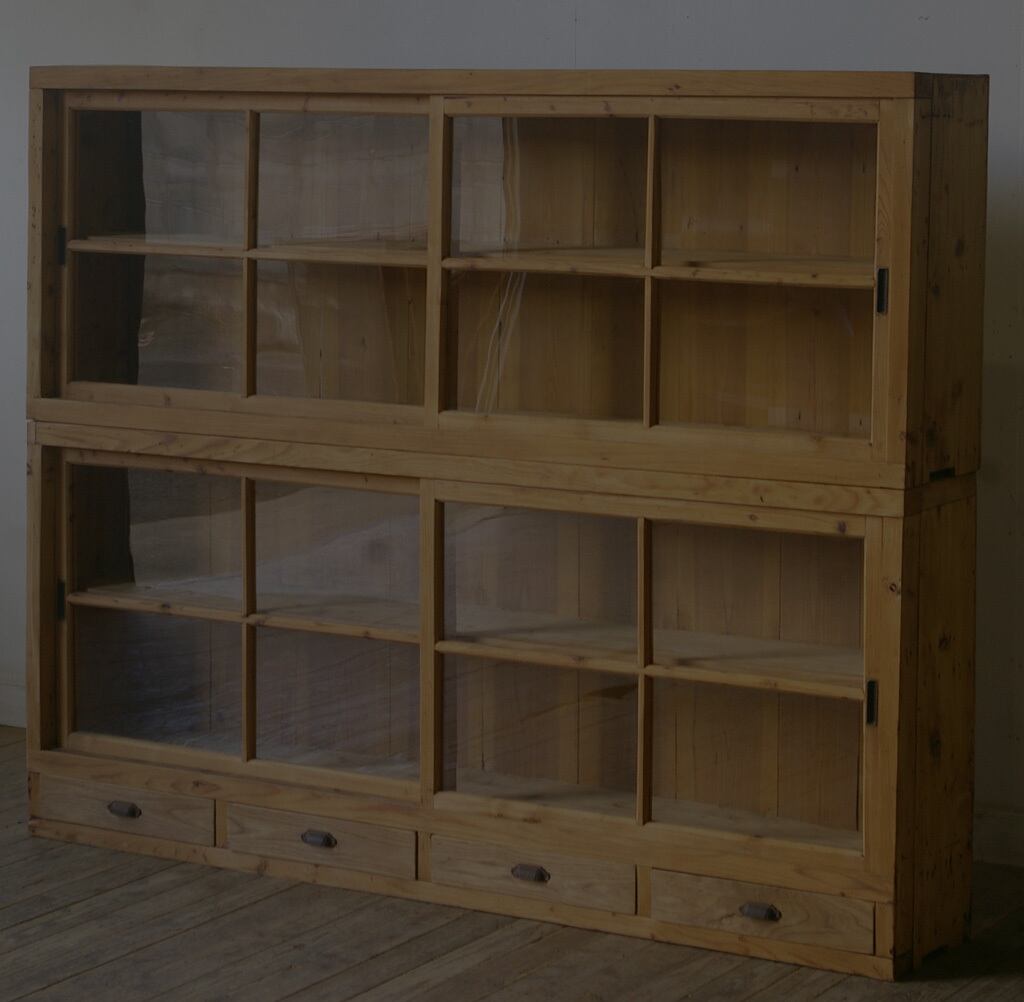 古い無垢材の綺麗な木目がとても雰囲気の良いアンティーク重ねガラス戸棚です。