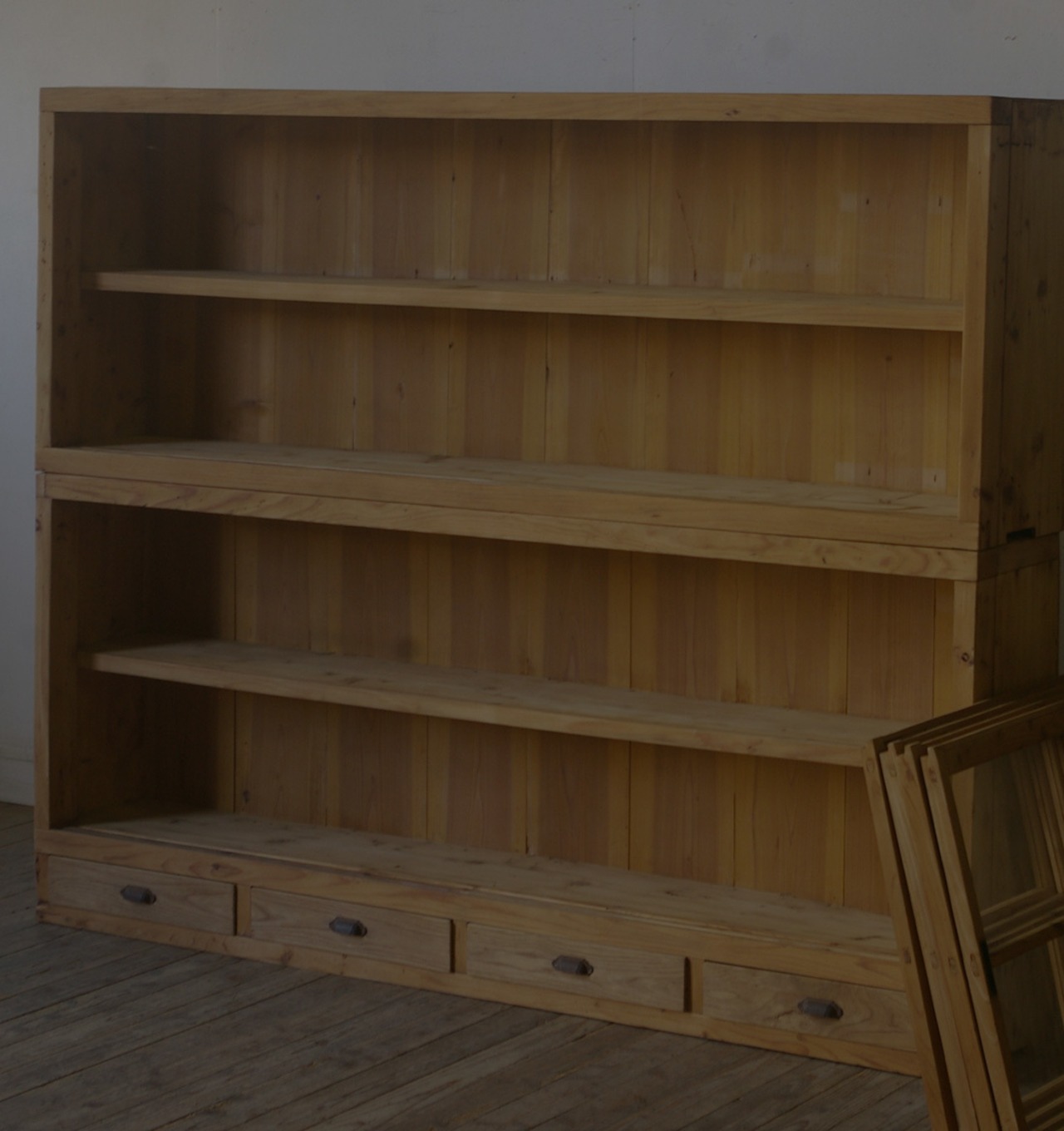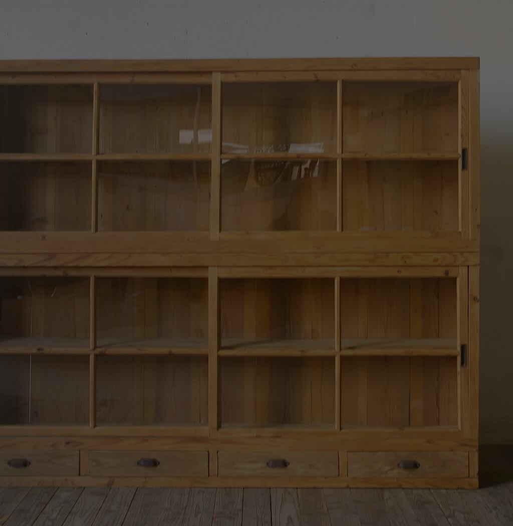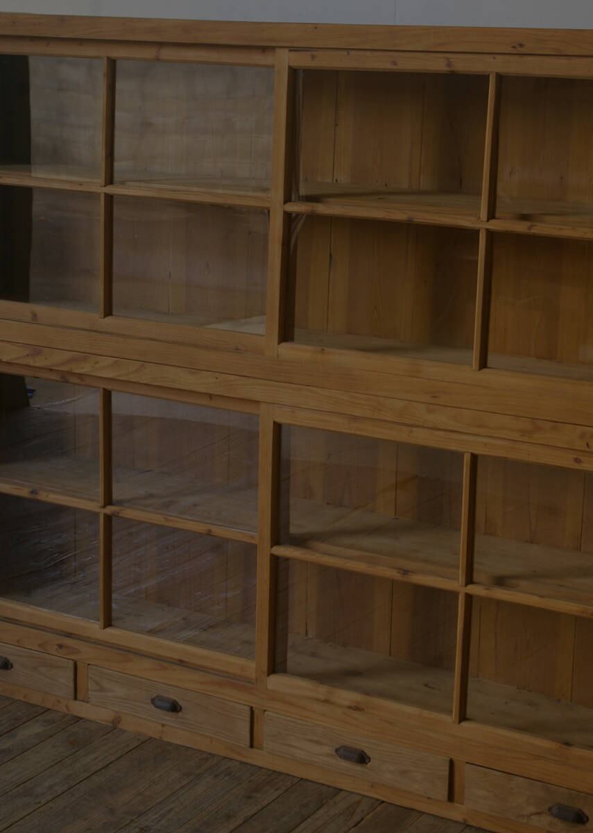 薄型◆古い重ね十字ガラス戸棚◆引き出し4杯 YZ2101