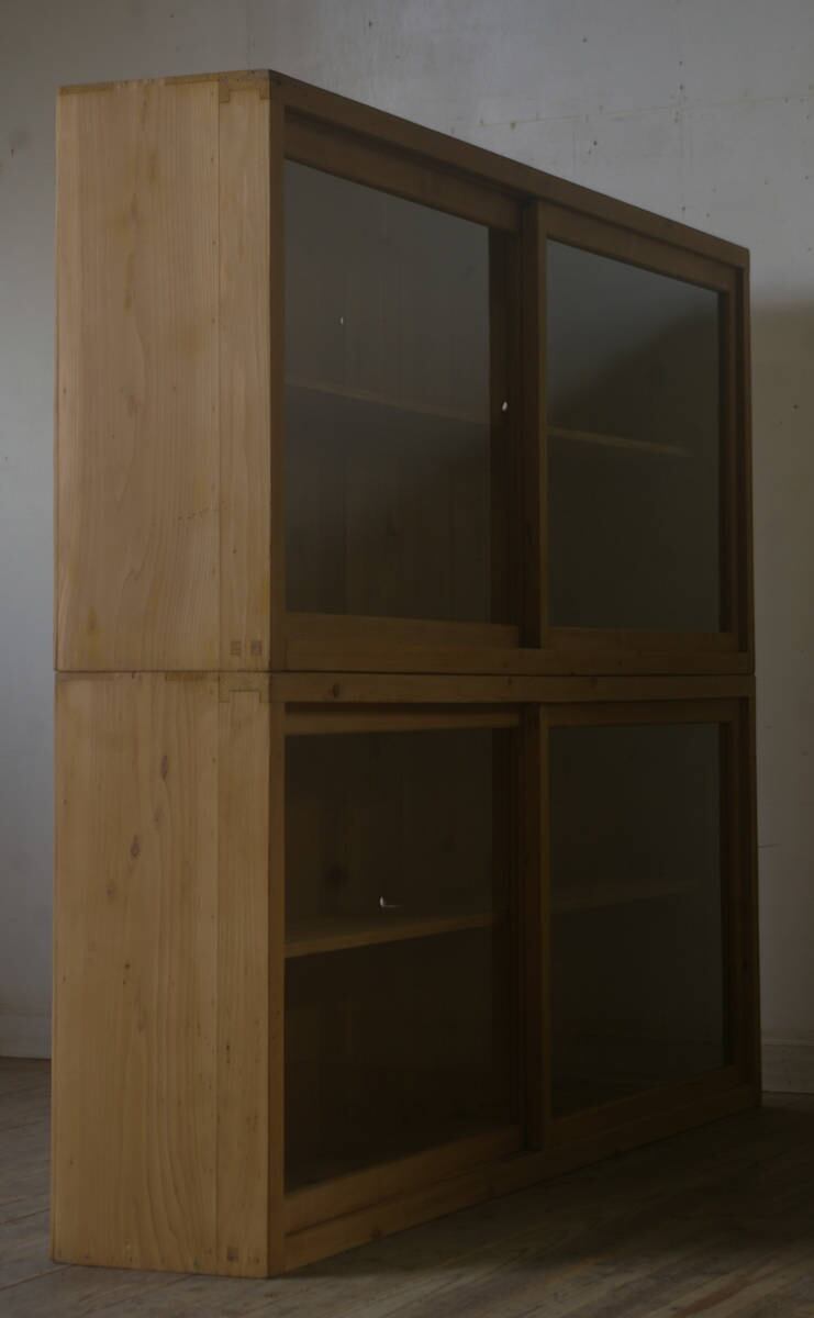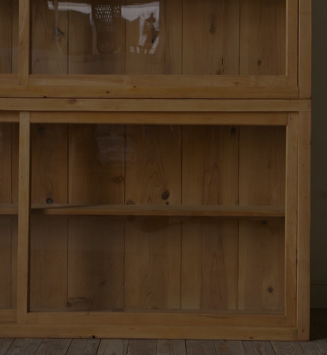 立派な造りで存在感が大きな4枚のゆらゆらガラス戸と古い無垢材の綺麗な木目がとても雰囲気の良いアンティーク重ねガラス戸棚です。