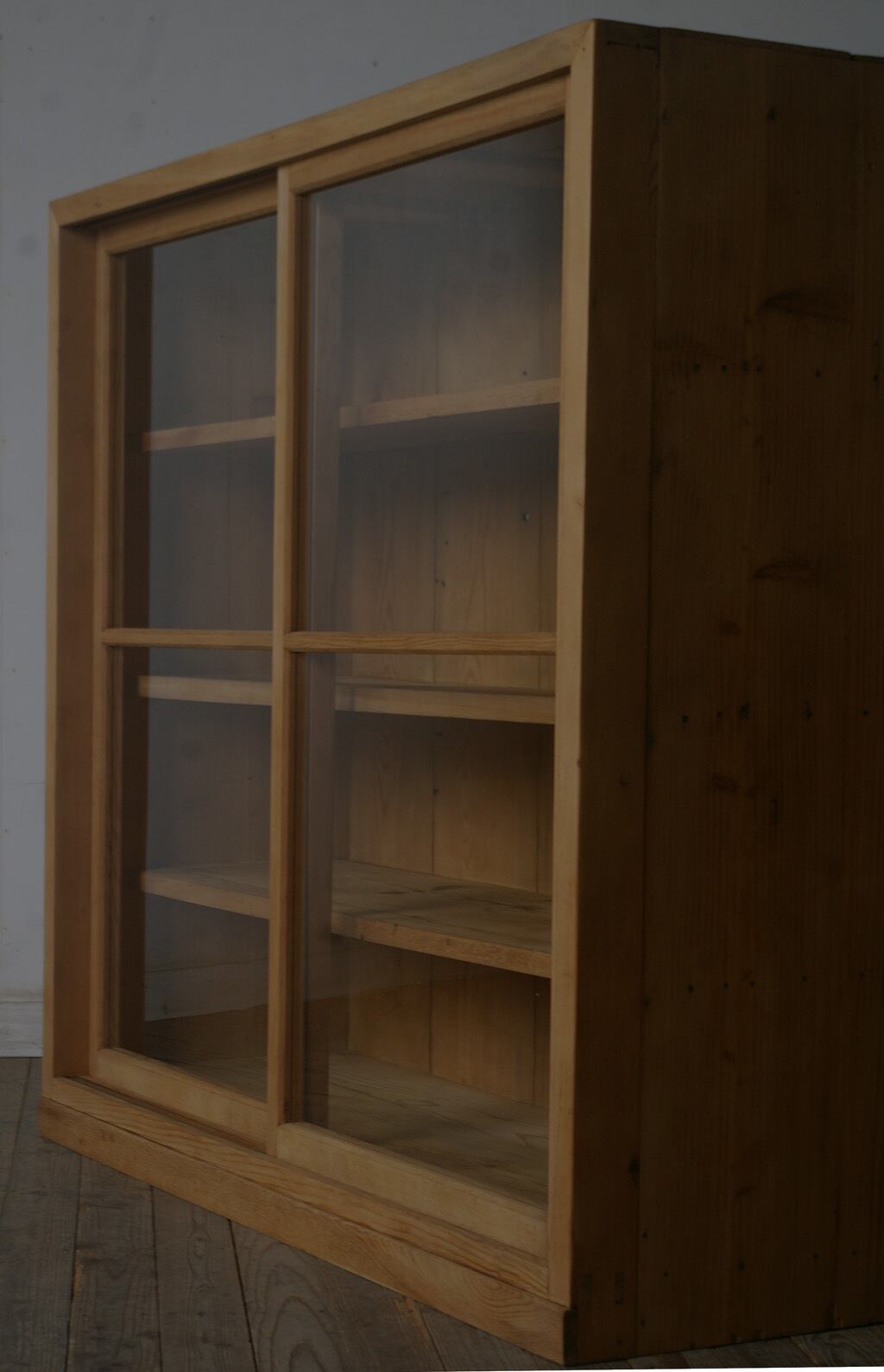 シンプルなデザインで収納力があり、大きなガラス戸2杯と古い無垢材の綺麗な木目がとても雰囲気の良いアンティークガラス戸棚です。