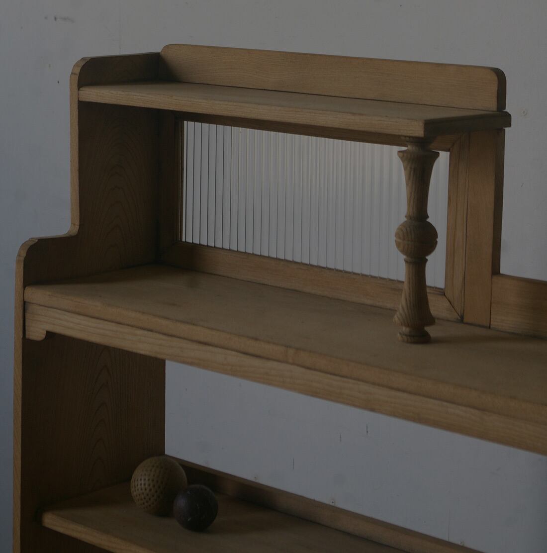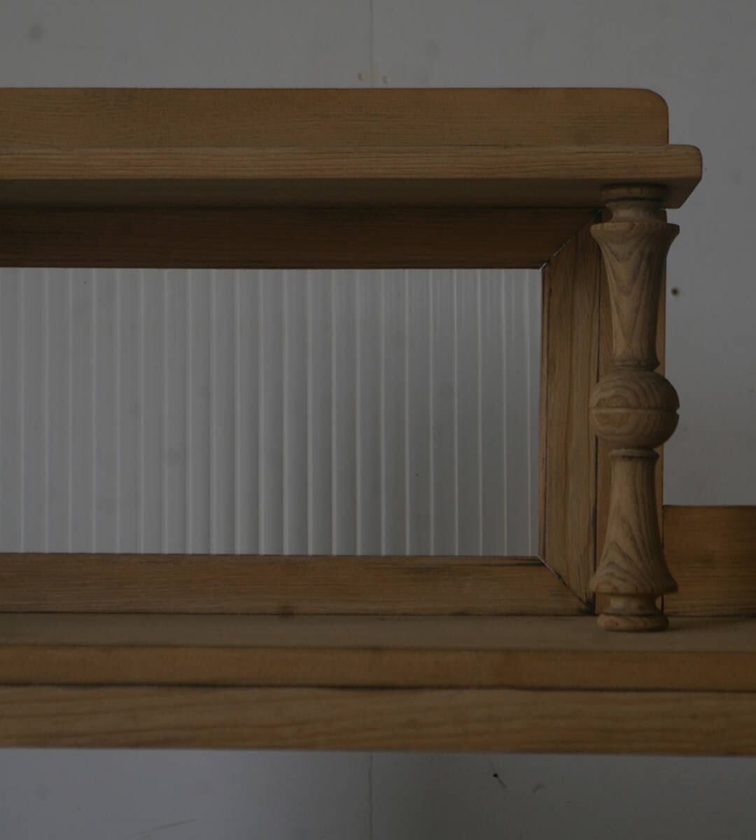 細部の細かい飾り模様や古い楢材の綺麗な木目がとても雰囲気の良いアンティーク陳列棚です。