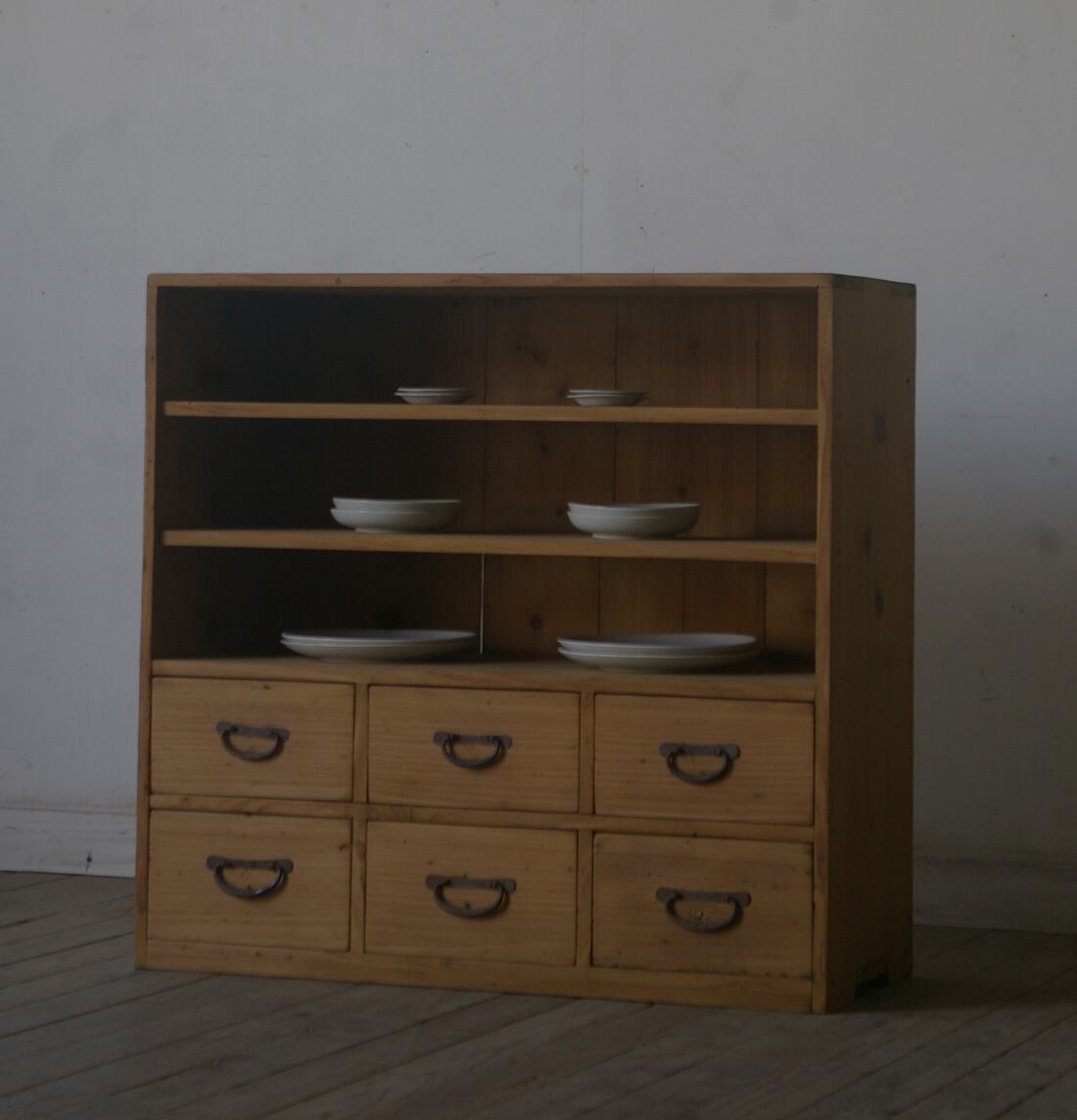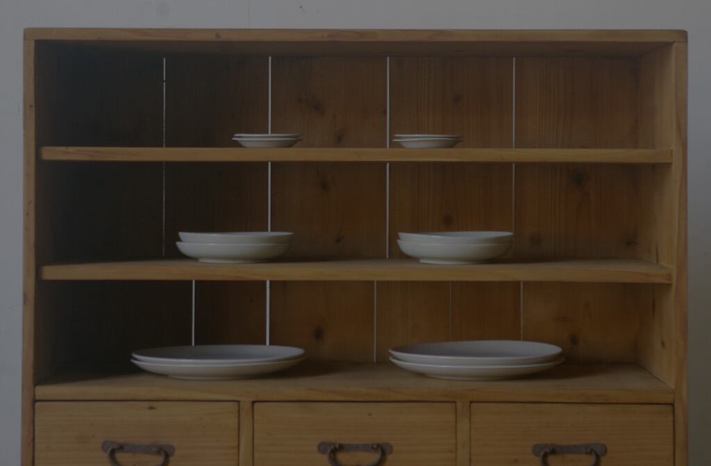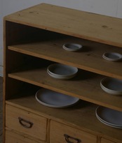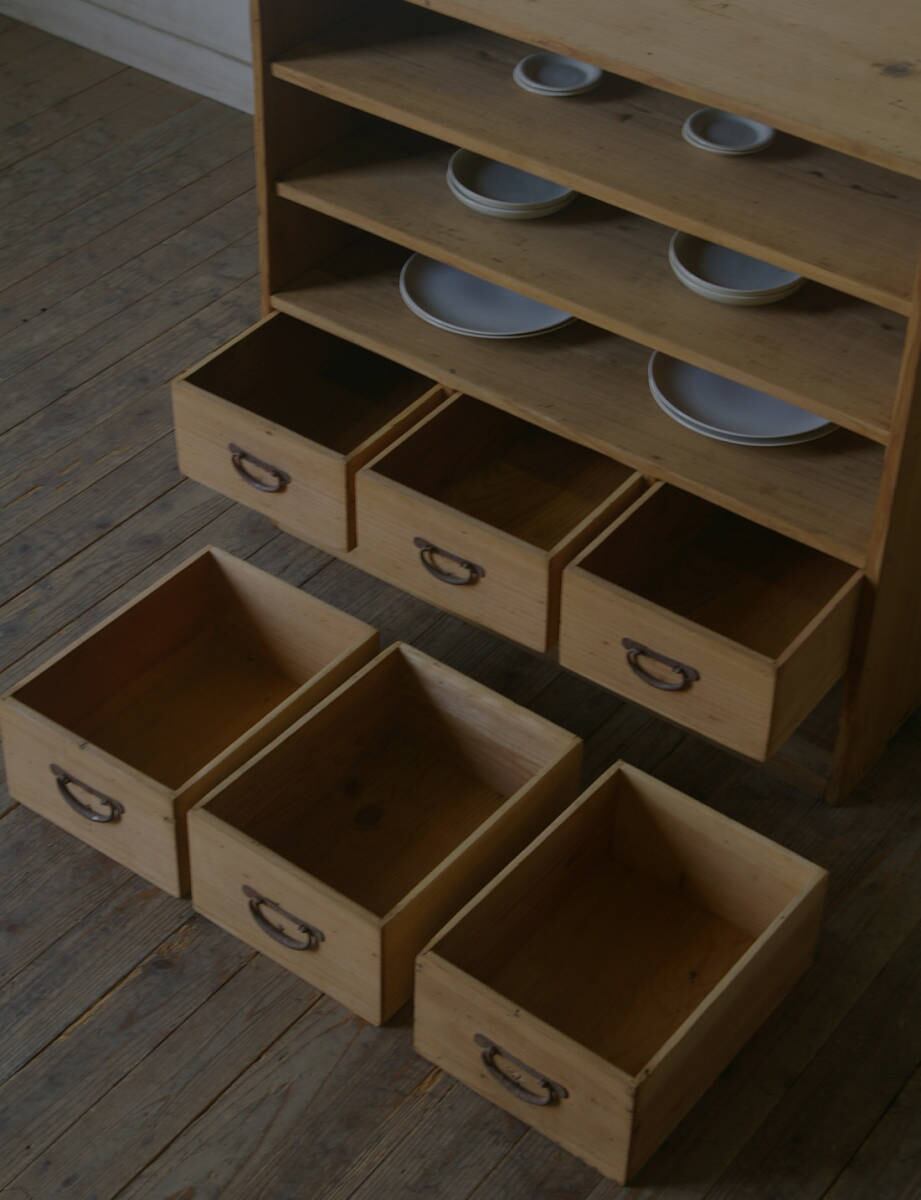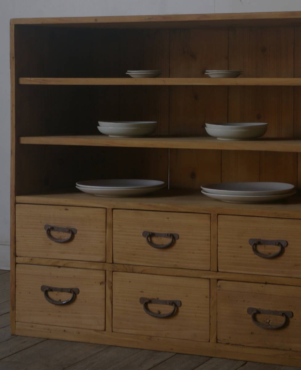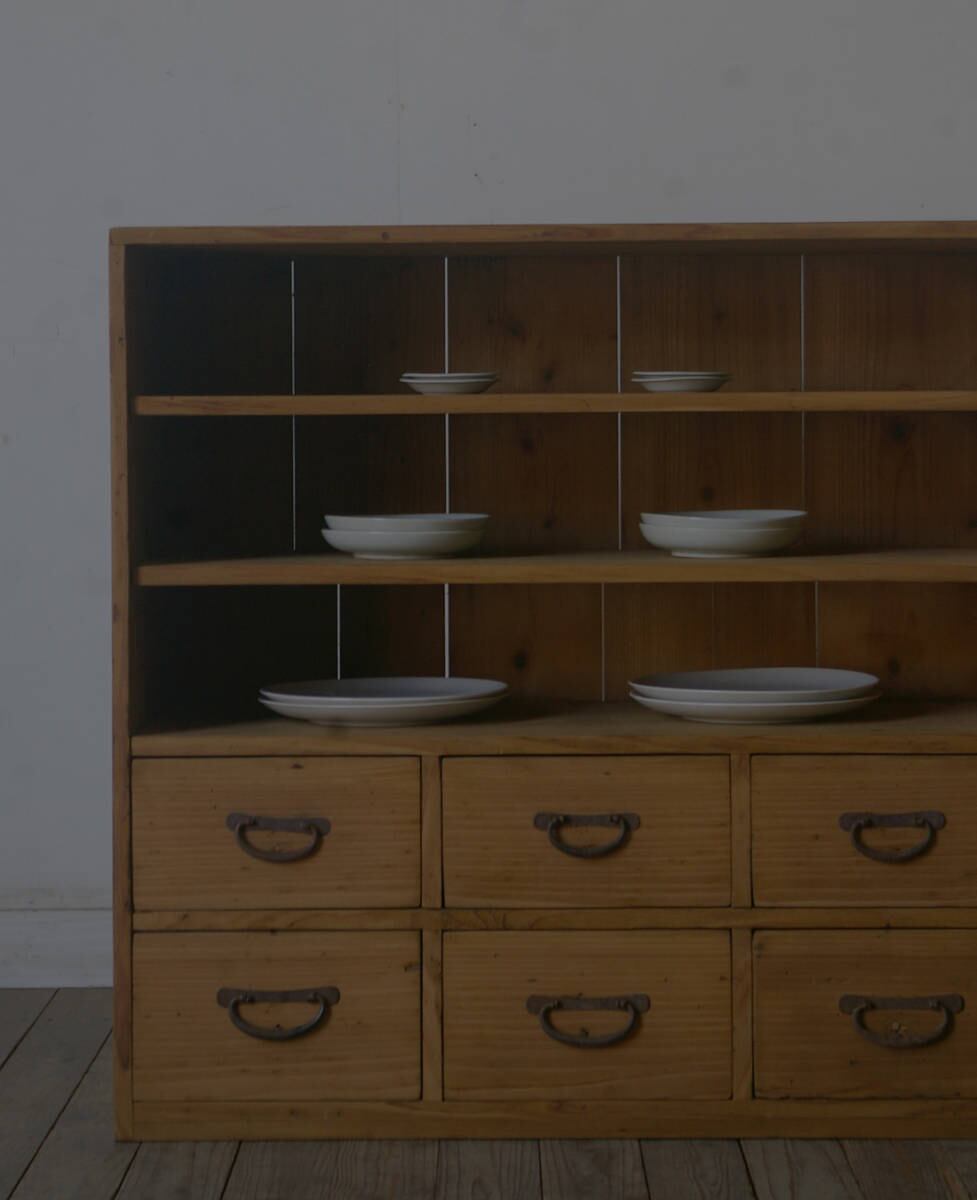 シンプルなデザインでサイズ感も良く6杯の引き出しという収納力もあり、古い無垢材の綺麗な木目がとても雰囲気の良いアンティーク飾り棚です。