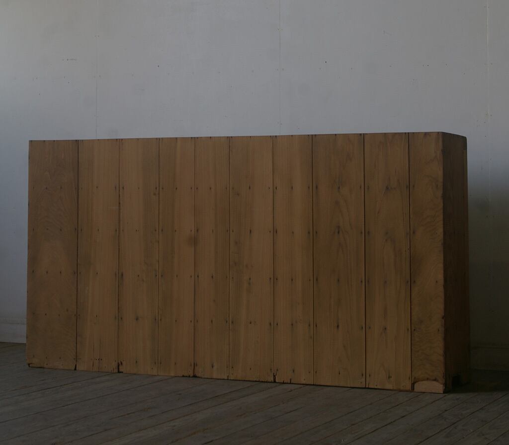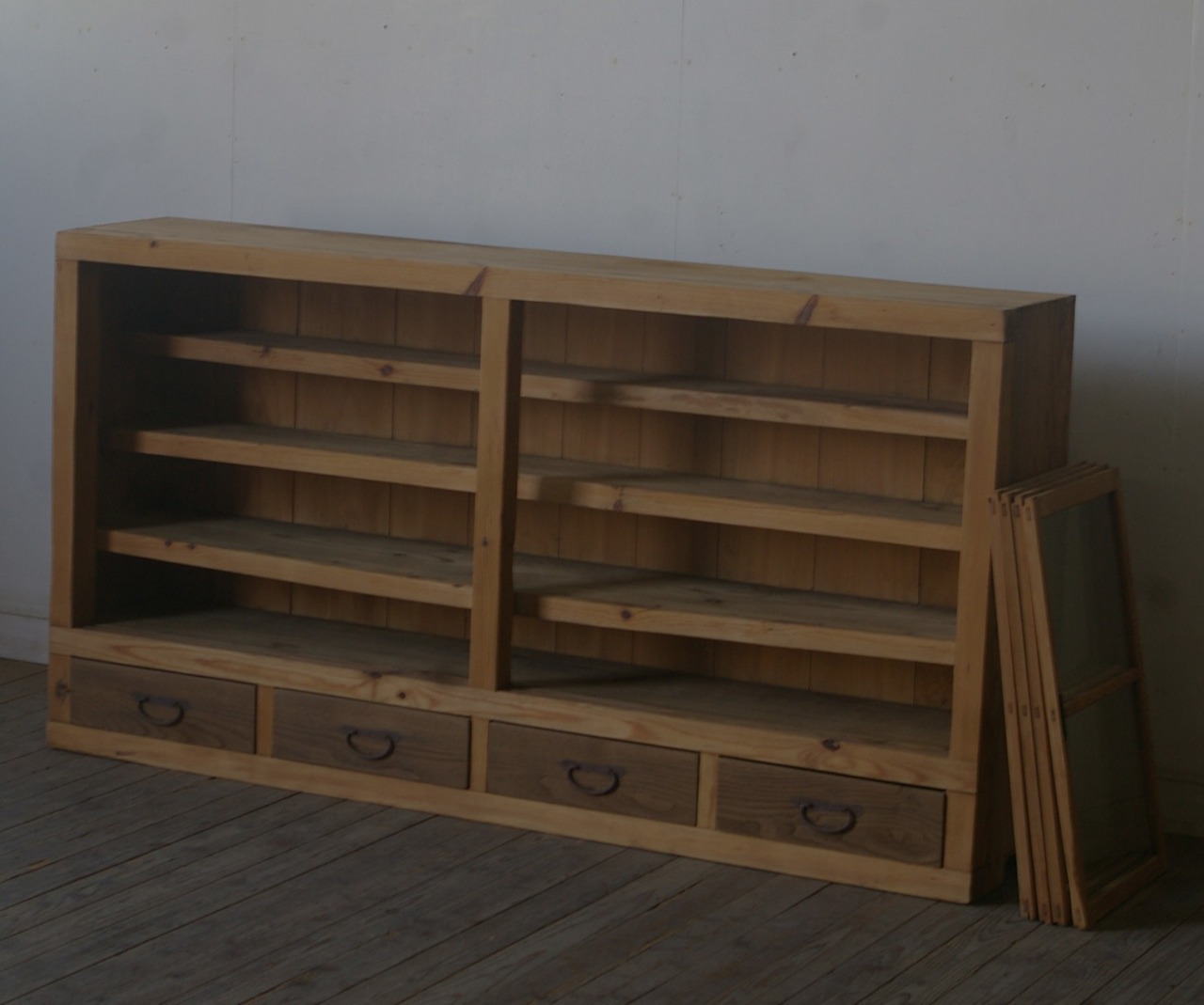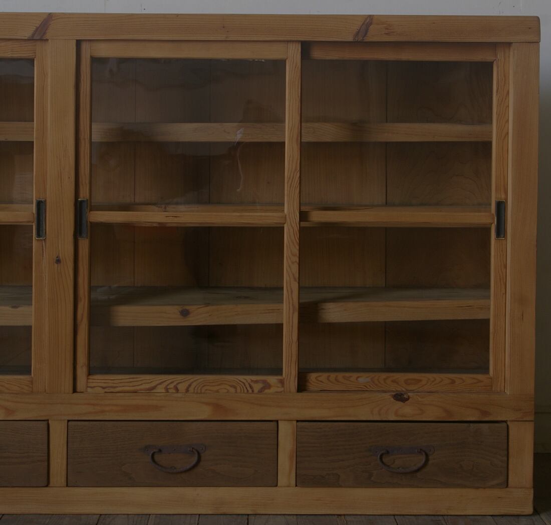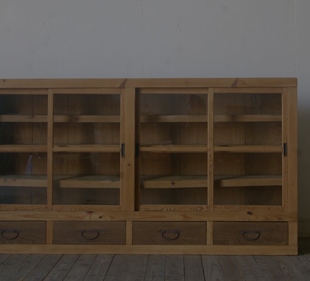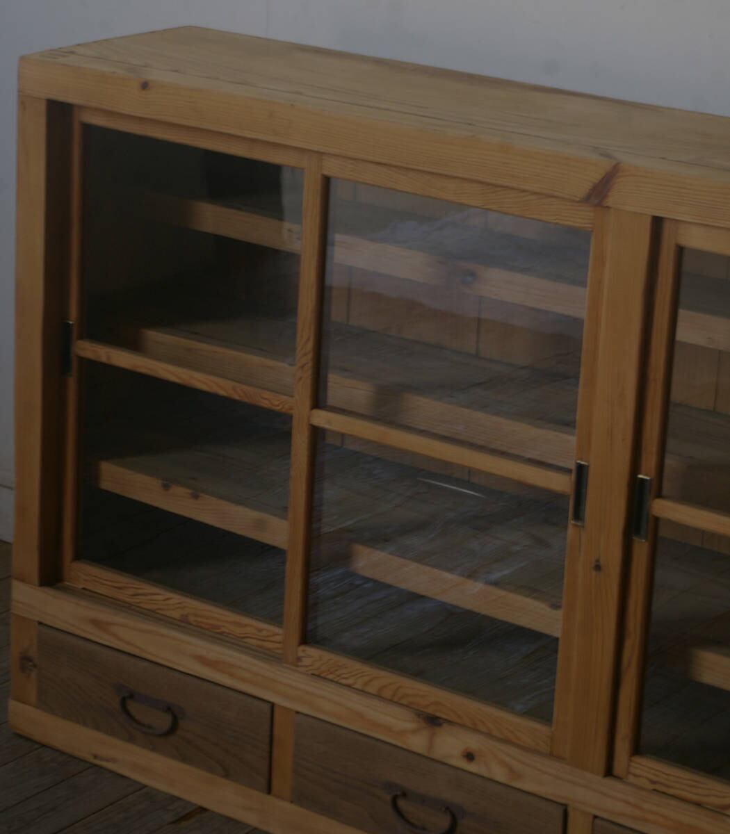 古い無垢材の綺麗な木目がとても雰囲気の良いアンティーク横長ガラス戸棚です。