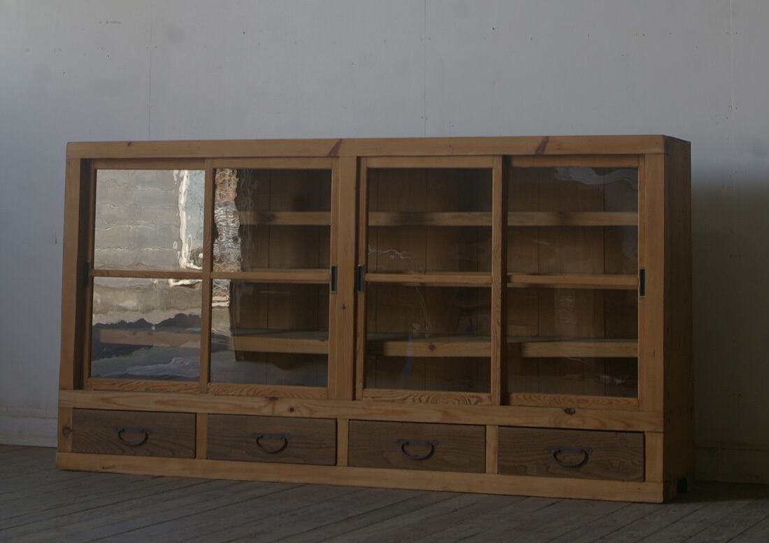 引き出し4杯◆古い横長4枚ガラス戸棚 YZ2152