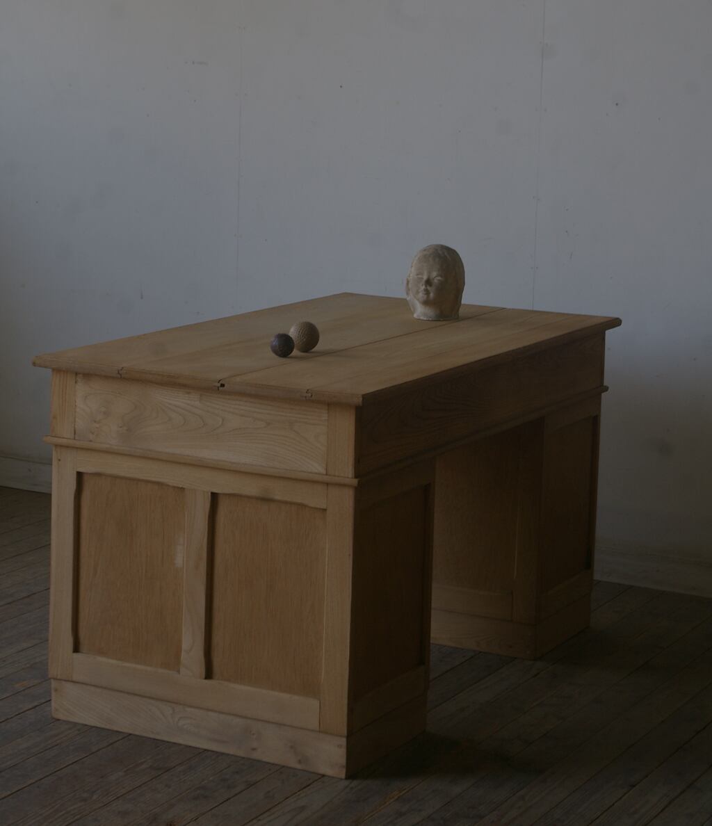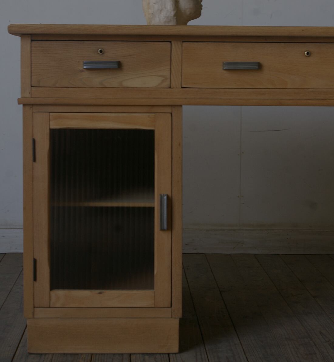 古い楢材の綺麗な木目がとても雰囲気の良いアンティーク分解式大きな両袖机です。