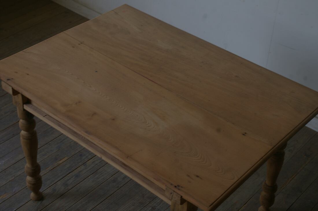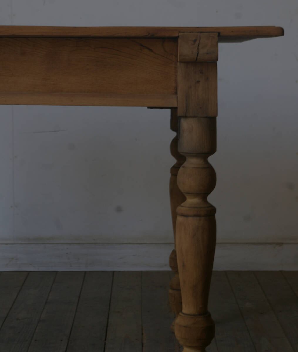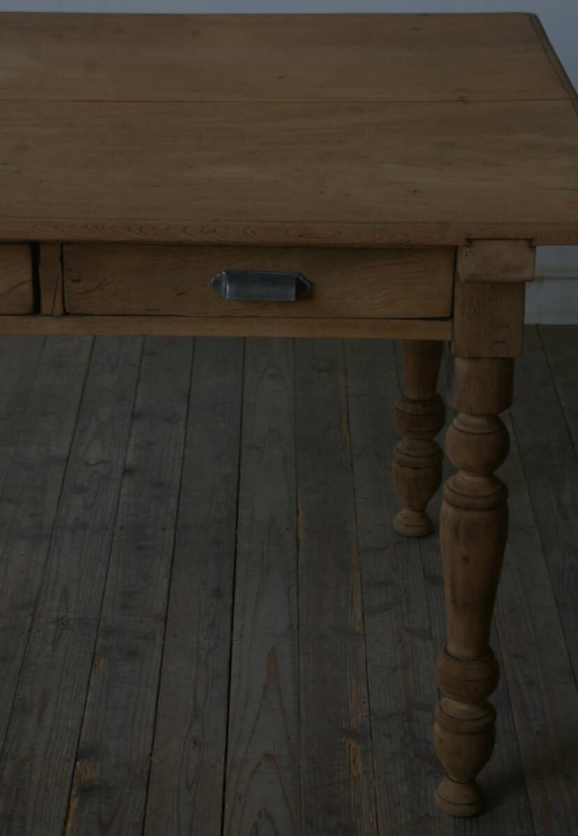 立派な造りでデザイン、サイズ感も良く、大きな天板と長い脚、古い欅材の綺麗な木目がとても雰囲気の良いアンティークテーブルです。