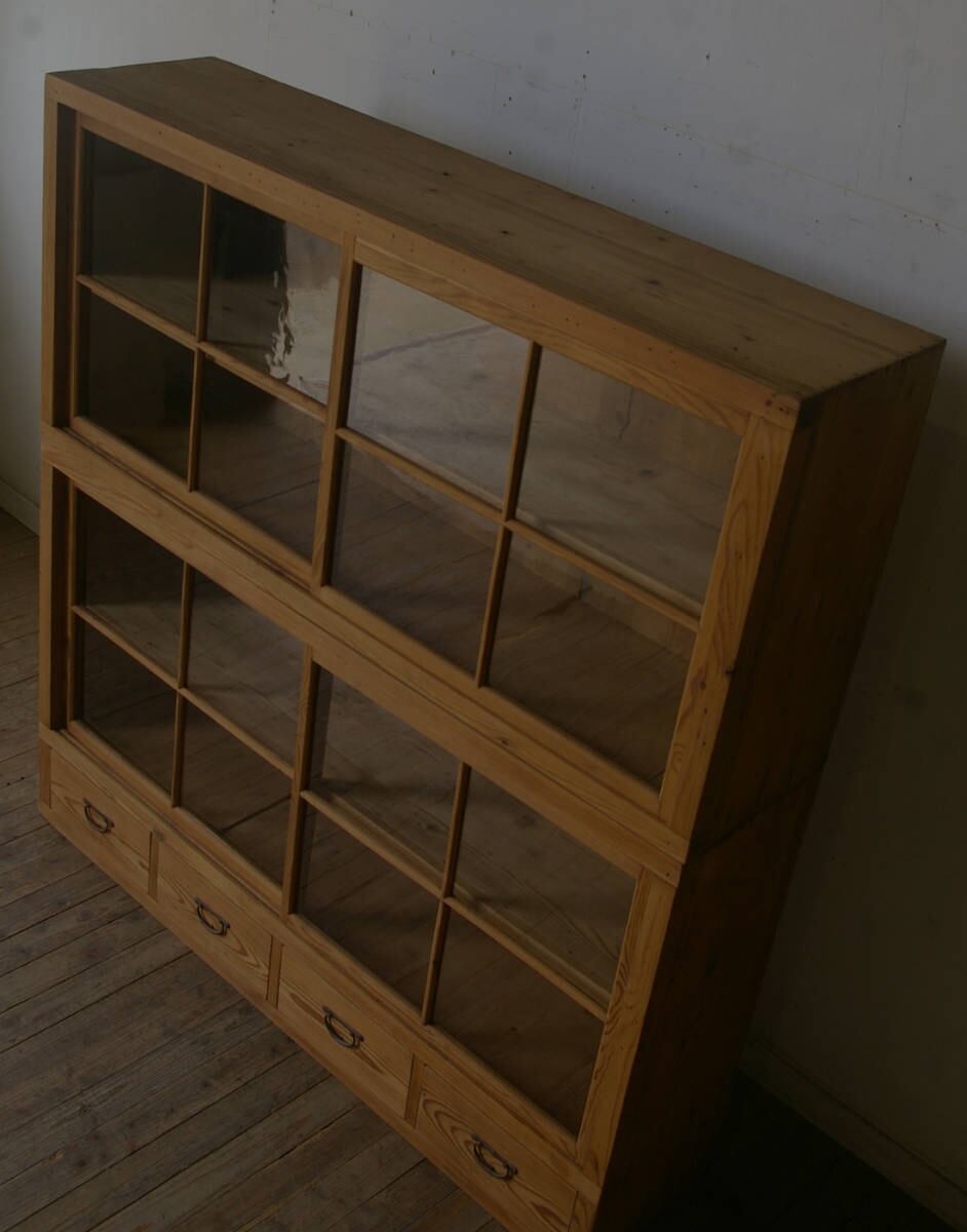引き出し4杯◆古い重ね大きな十字ガラス戸棚 YZ2163