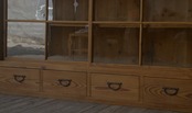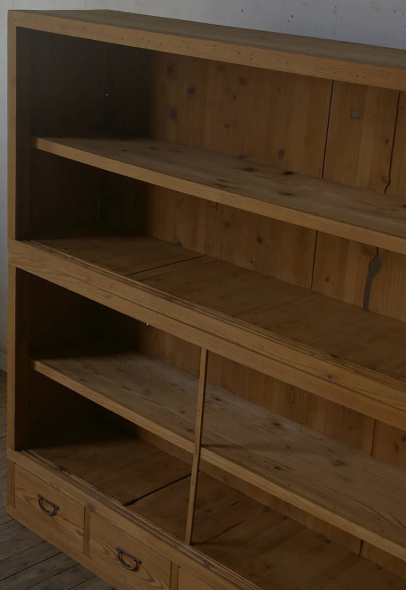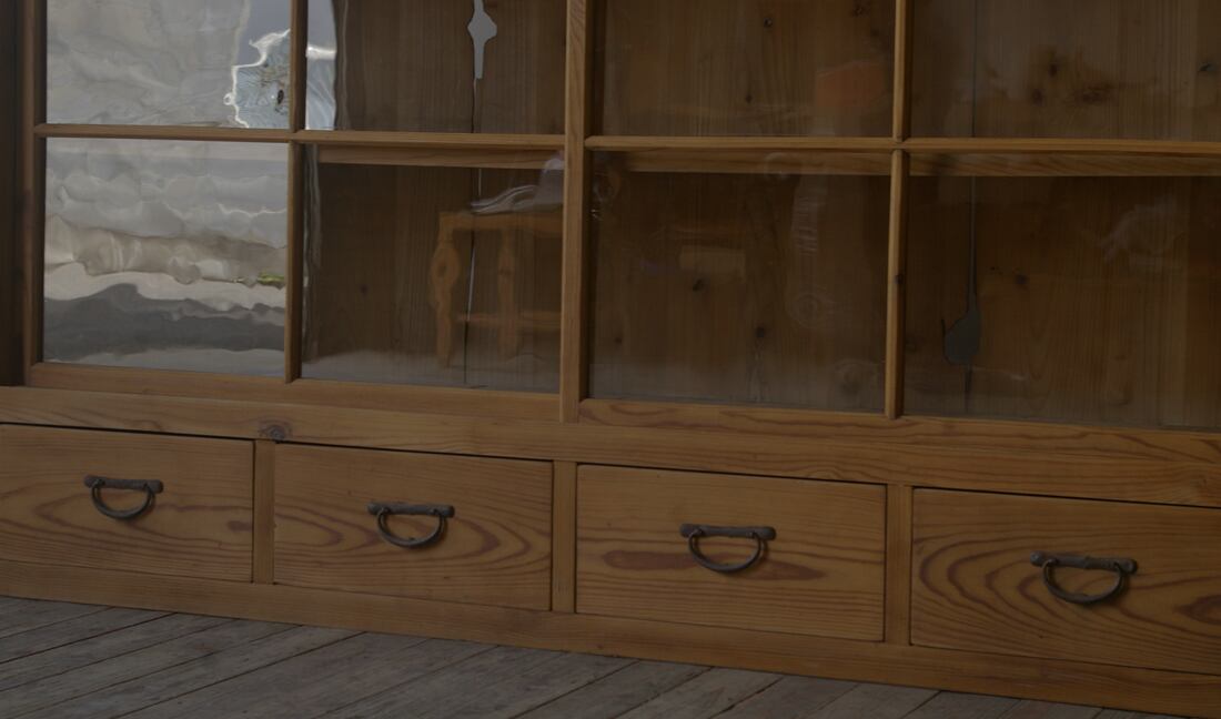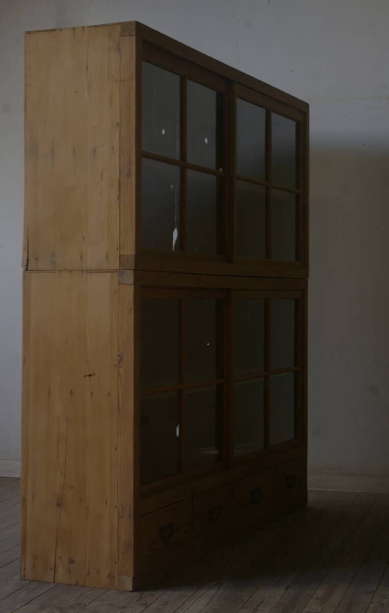 立派な造りで収納力もあり、大きな4枚の十字ガラス戸と4杯の引き出し、古い無垢材の綺麗な木目がとても雰囲気の良いアンティーク重ねガラス戸棚です。