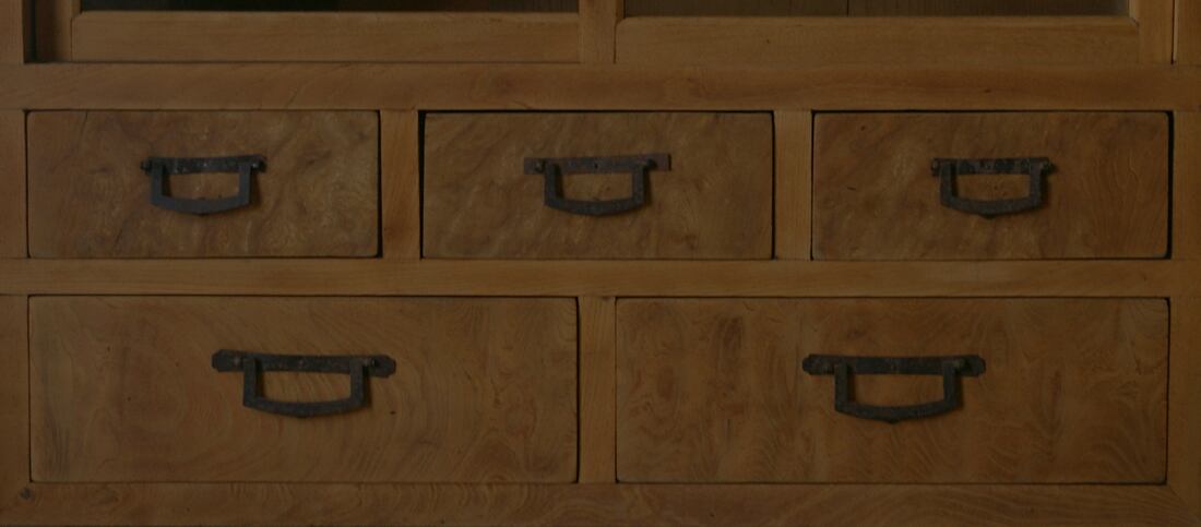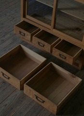 立派な造りでサイズ感も良く収納力もあり、5杯の引き出しと古い無垢材の綺麗な木目がとても雰囲気の良いアンティークガラス戸棚です。