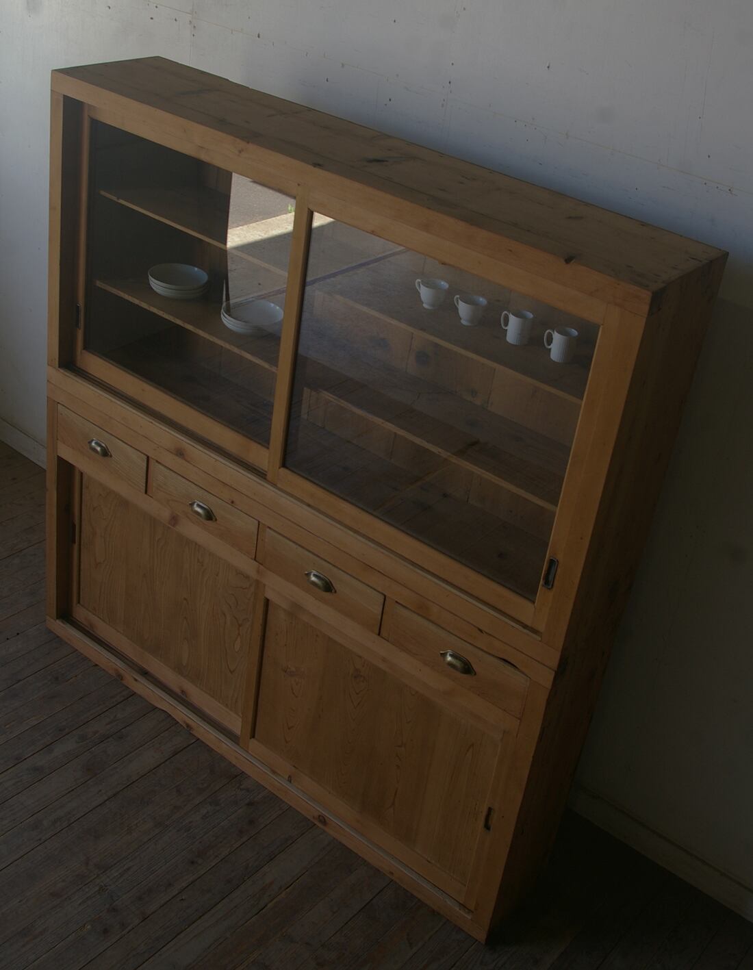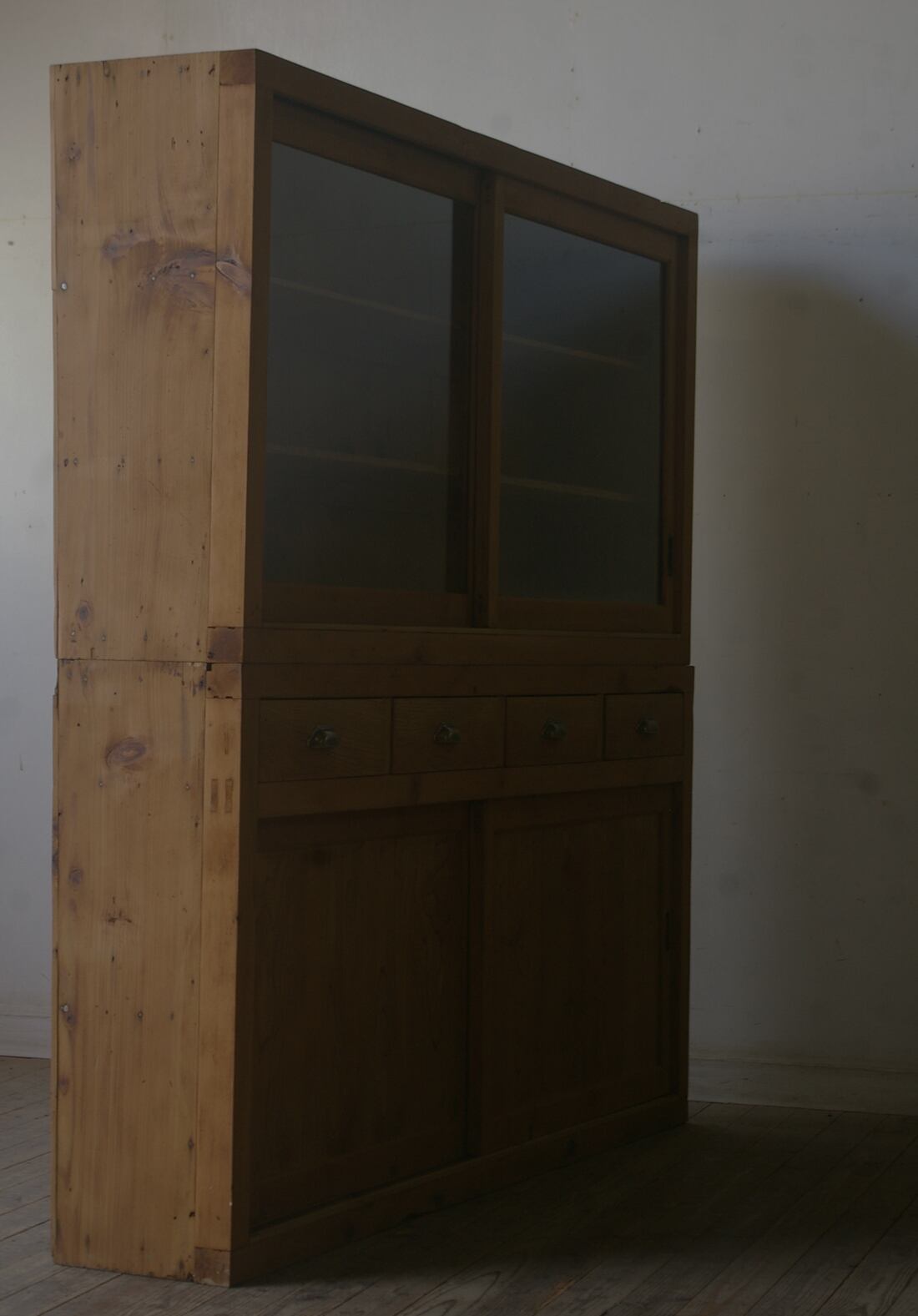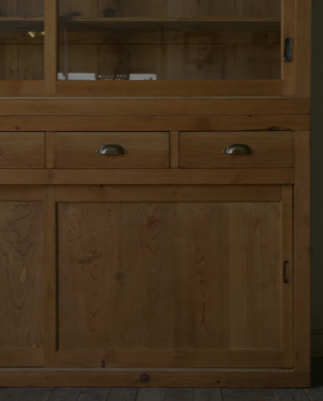 薄型の造りですがたくさん収納力があり、古い無垢材の綺麗な木目がとても雰囲気の良いアンティーク重ねガラス戸棚です。