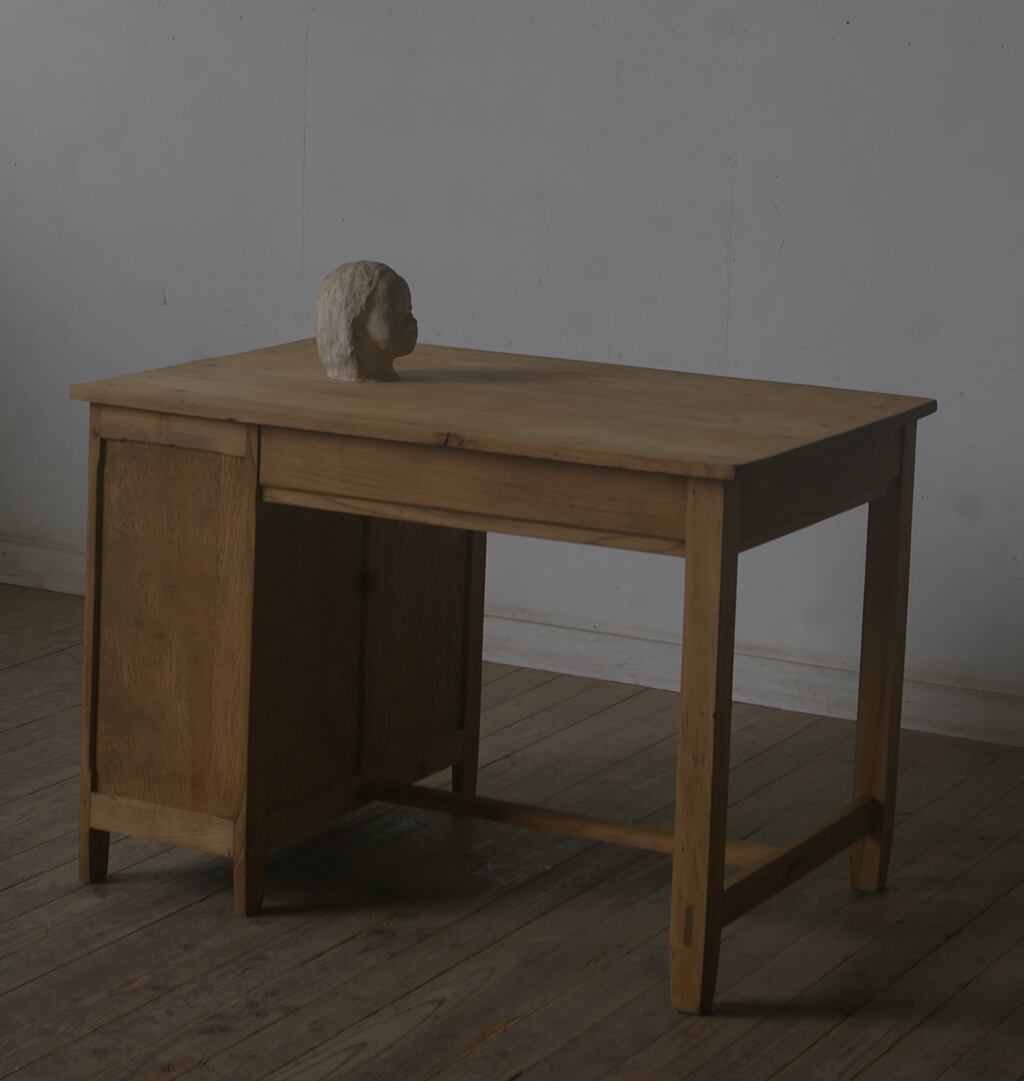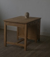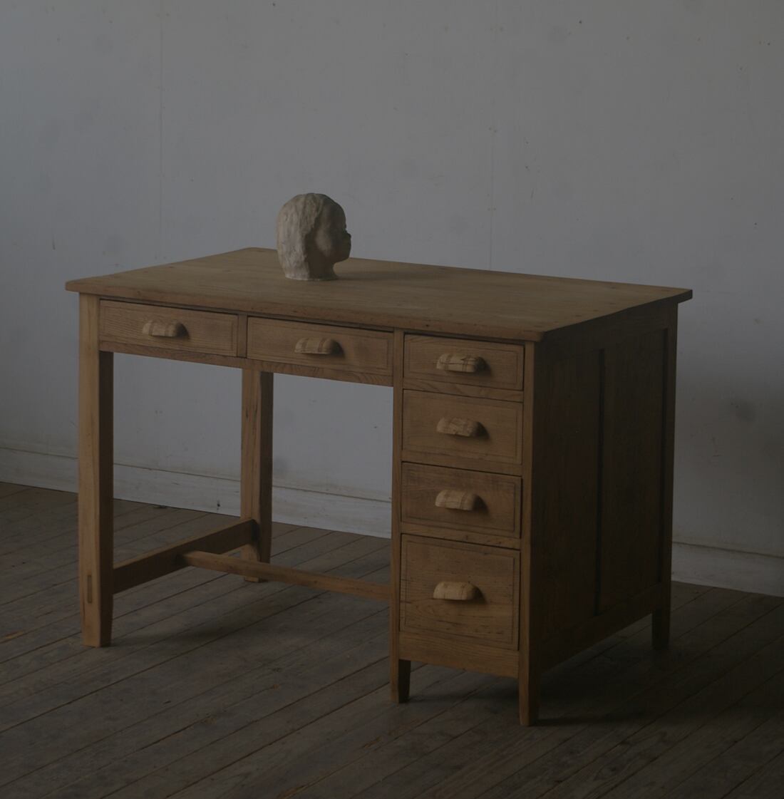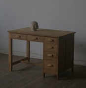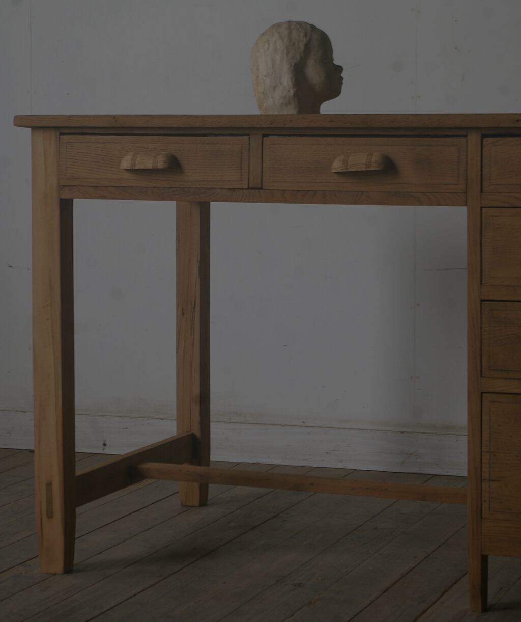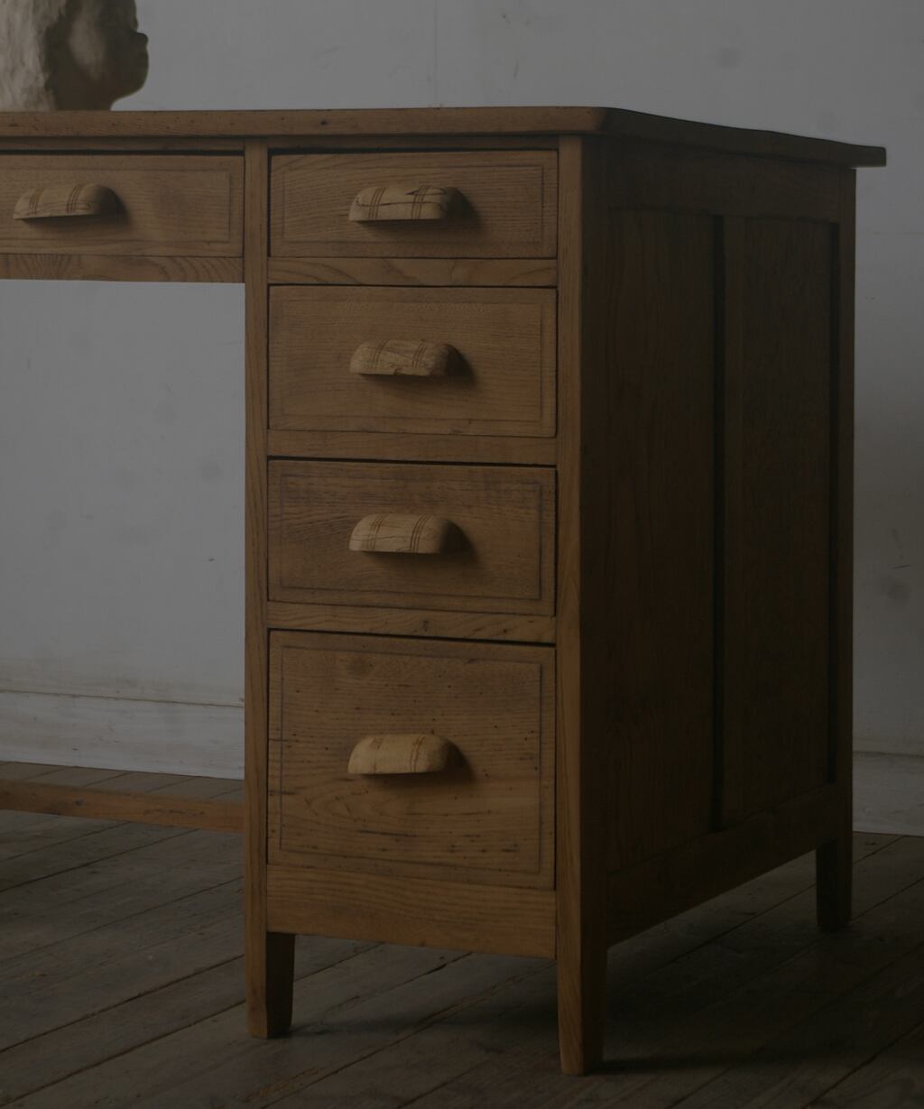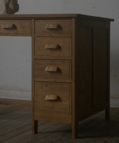 立派な造りでデザインも良く、ぼってりとした木製の引手や古い楢材の綺麗な木目がとても雰囲気の良いアンティーク片袖机です。