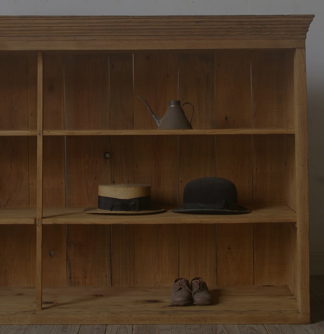 シンプルなデザインで造りも良く、収納力もあり、古い無垢材の綺麗な木目がとても雰囲気の良いアンティーク大きな陳列棚です。