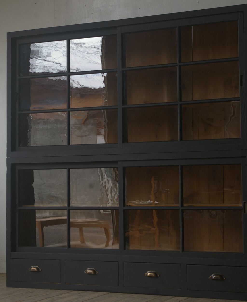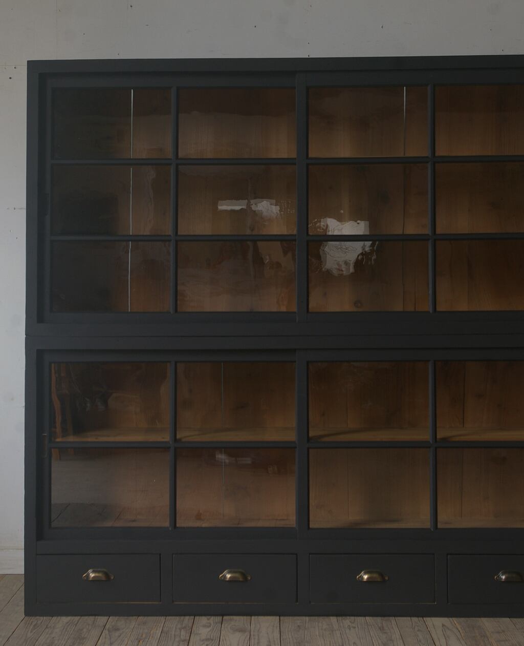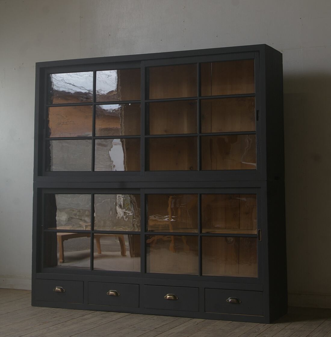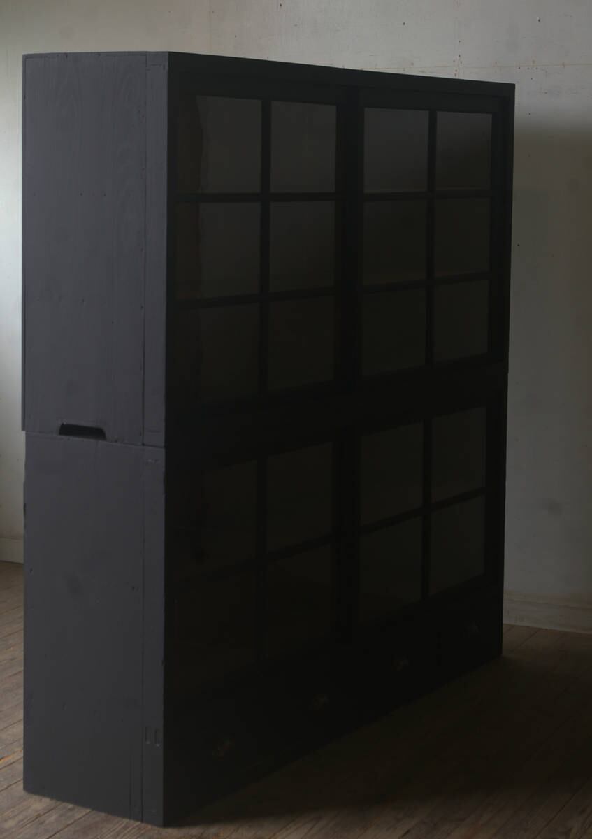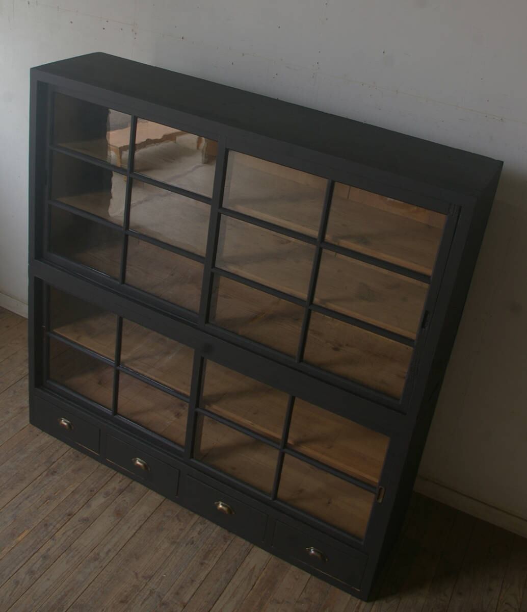 引き出し4杯◆重ね◆古い大きな格子ガラス戸棚 YZ2189