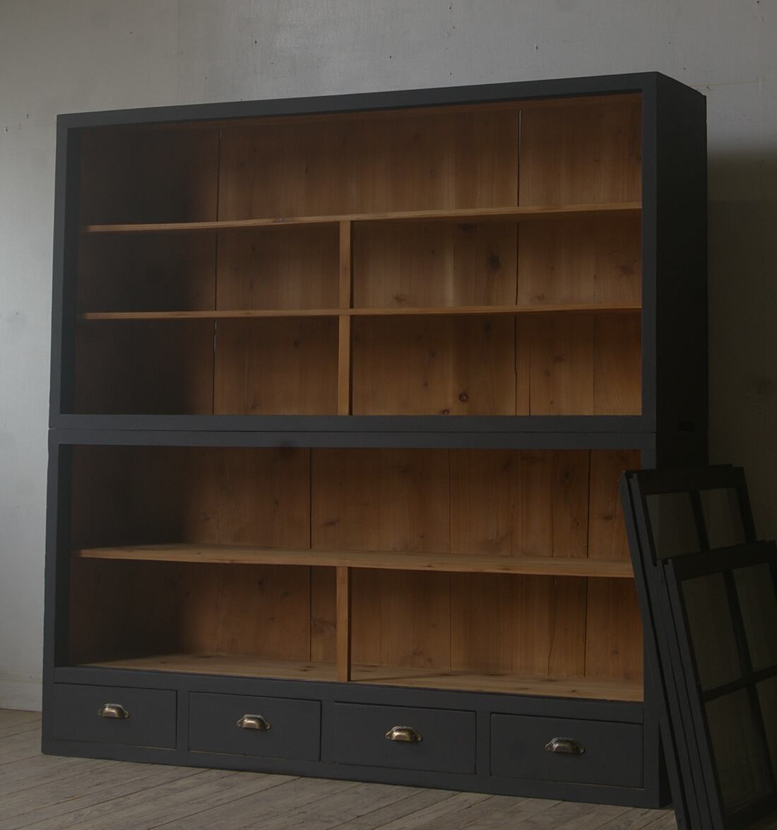 立派な造りでデザインも良く、収納力もあり、とても存在感のあるアンティーク重ね大きな格子ガラス戸棚です。