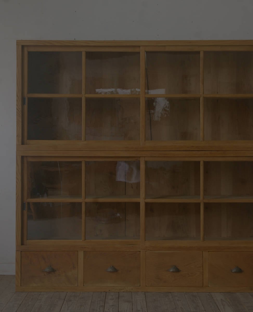 立派な造りで収納力もあり、十字ガラス戸と4杯の引き出し、古い無垢材の綺麗な木目がとても雰囲気の良いアンティーク重ねガラス戸棚です。