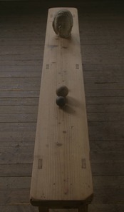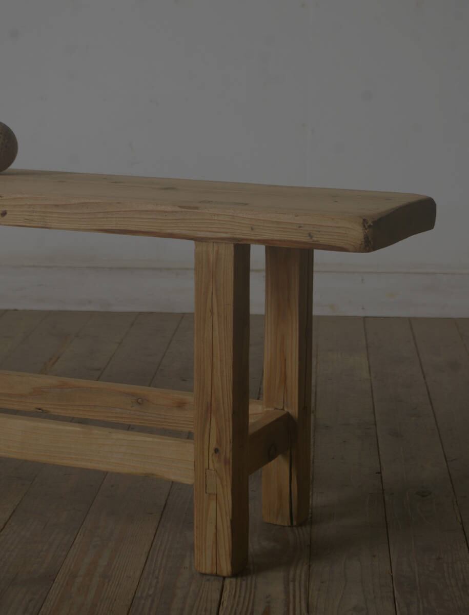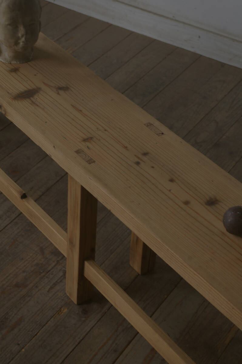 シンプルな薄型のグッドデザインで味があり、古い無垢材の綺麗な木目がとても雰囲気の良いアンティーク横長ベンチです。