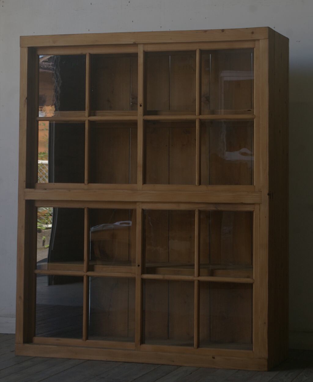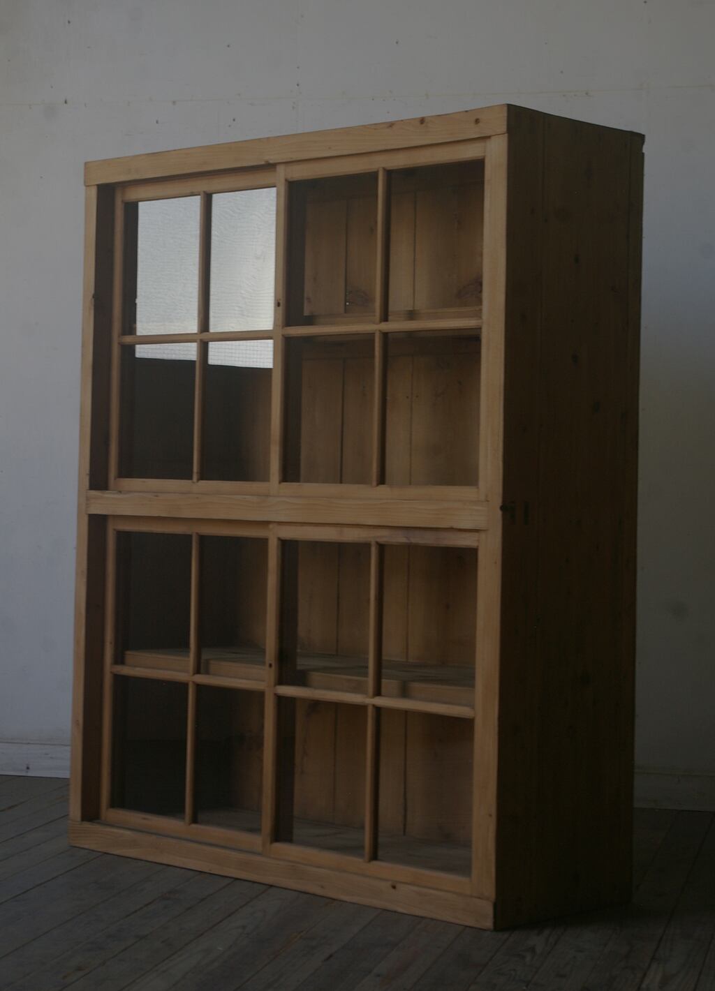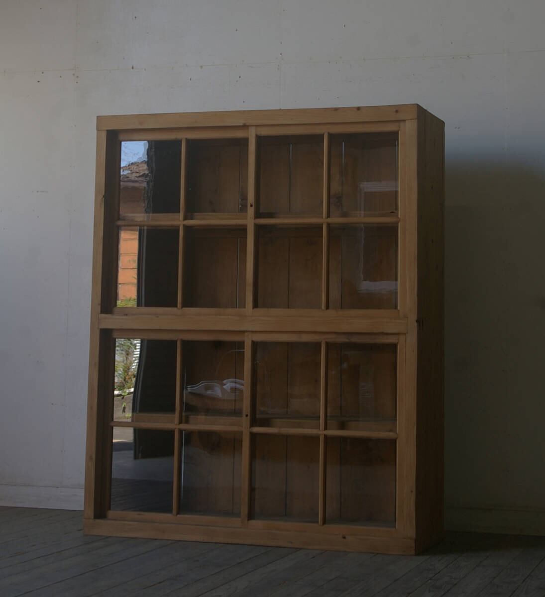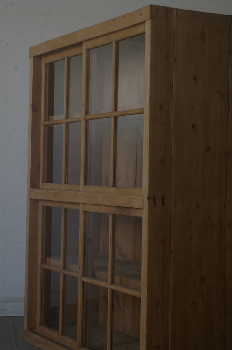シンプルな造りで収納力もあり、4枚の十字ガラス戸と古い無垢材の綺麗な木目がとても雰囲気の良いアンティークガラス戸棚です。