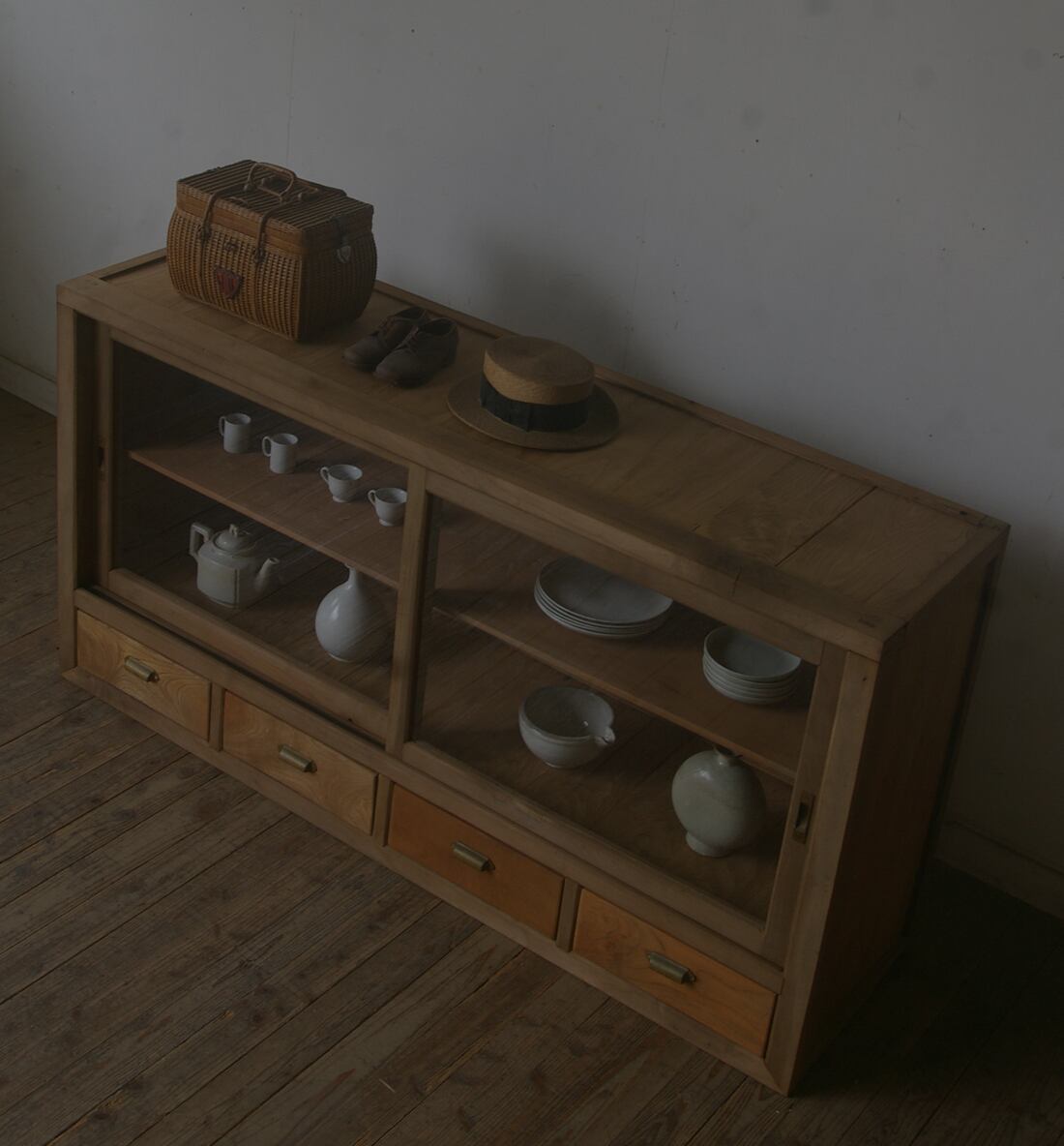 引き出し4杯◆古い横長ガラス戸棚 YZ2224